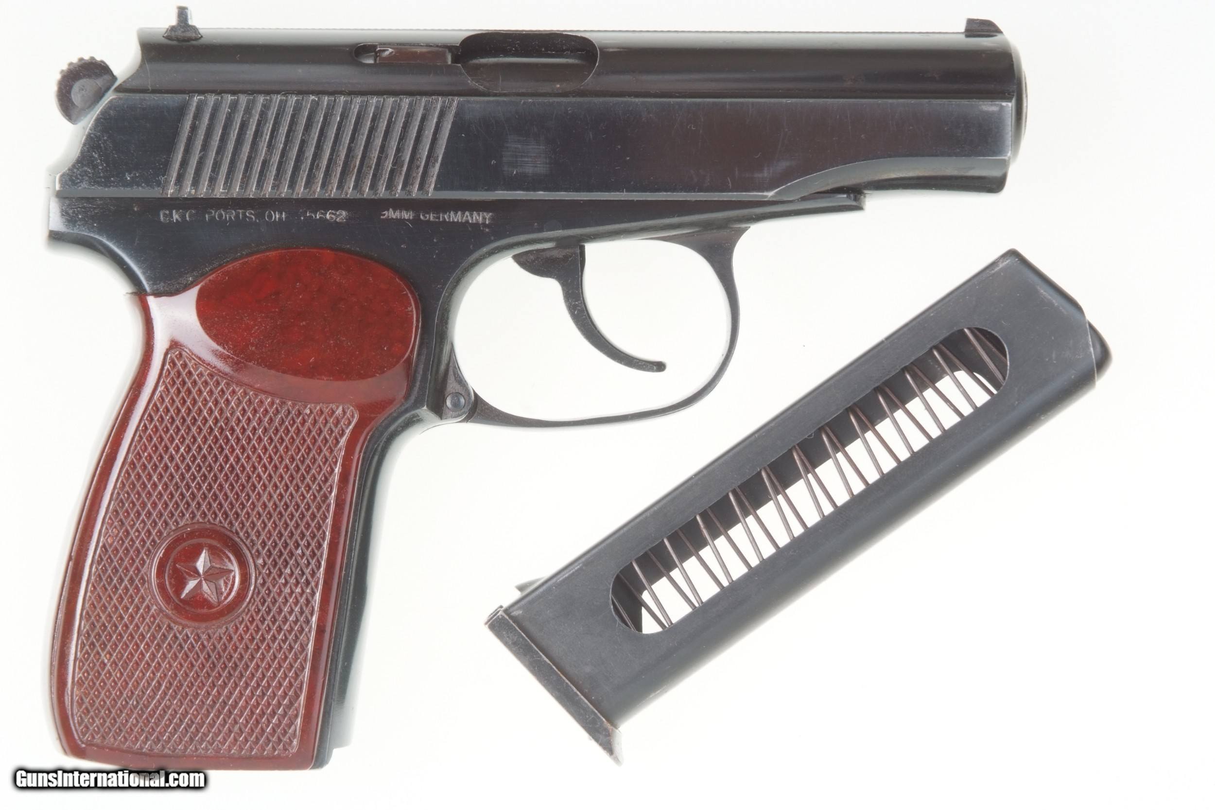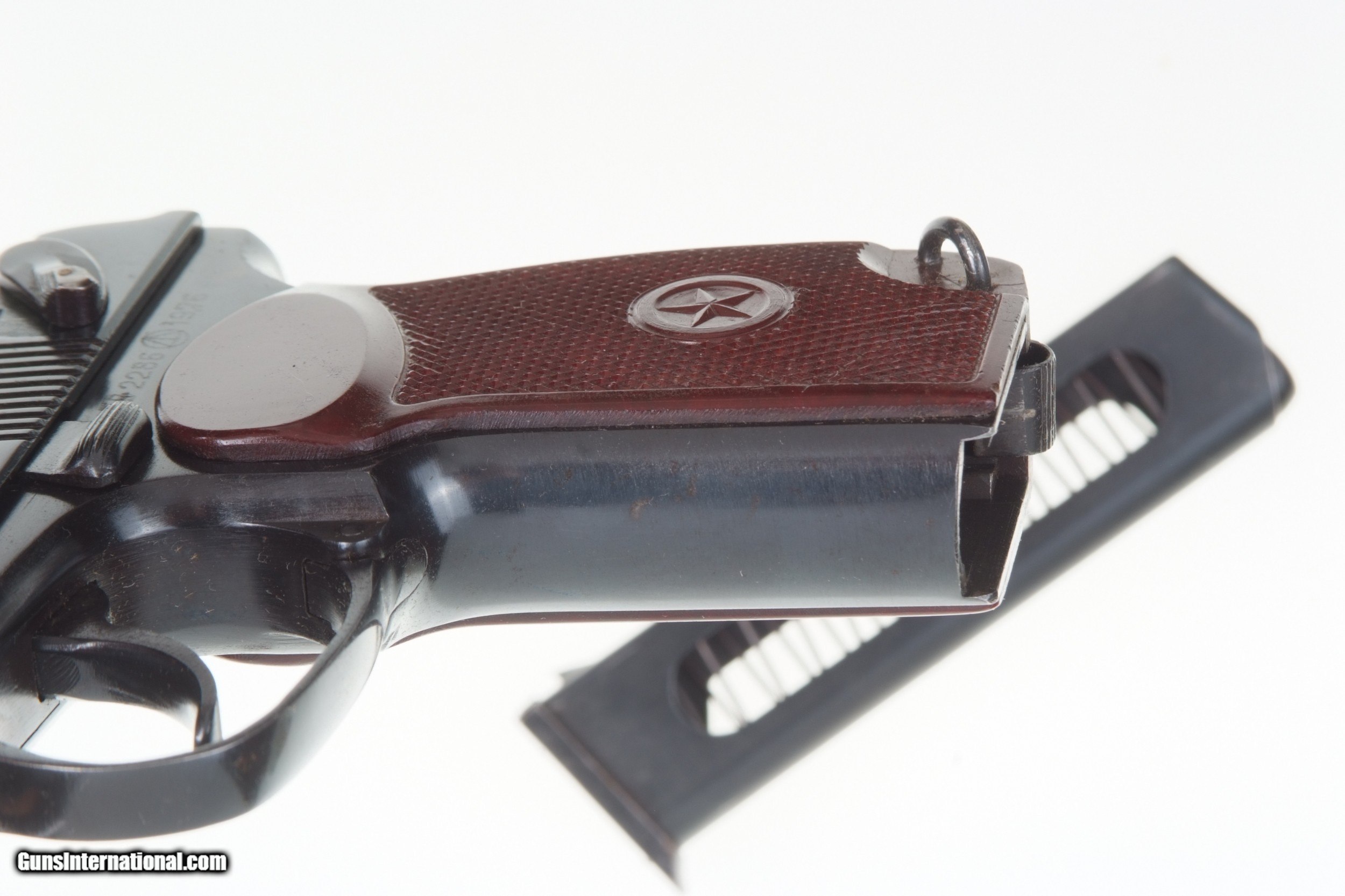 Description: Russian Military Makarov, dated 1976 with Bulgarian magazine. SN: TB2286. Cal. 9mm Mak. Standard configuration Makarov with fixed front and drift adjustable rear sight. Full serial number on left side of slide that is repeated on the left frame adjacent to the Izhevsk Arsenal symbol and the year 1976. Import marking on right frame. Usual reddish brown phenolic grips impressed with encircled 5 pointed star on each side. Lanyard ring. Unmarked Bulgarian magazine Condition: Approximately 96-97% salt blue. Comparable or better condition grips. Mirror bore. Perfect manual mechanics. A HISTORIC INVESTMENT! A-686. $695 +$40 shipping SOLD Curio/Relic: Yes Manufacturer: Izhevsk Model: Makarov |