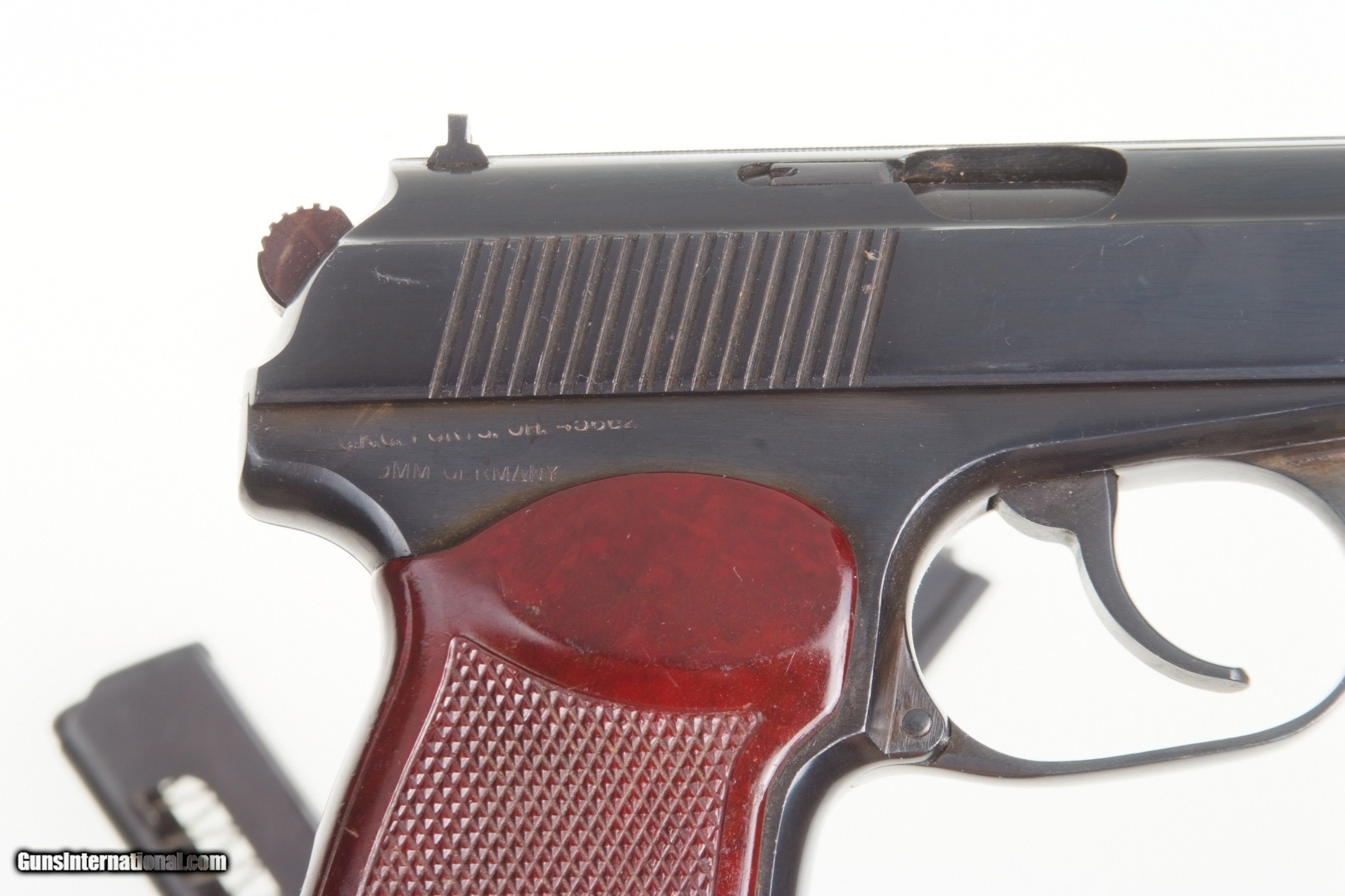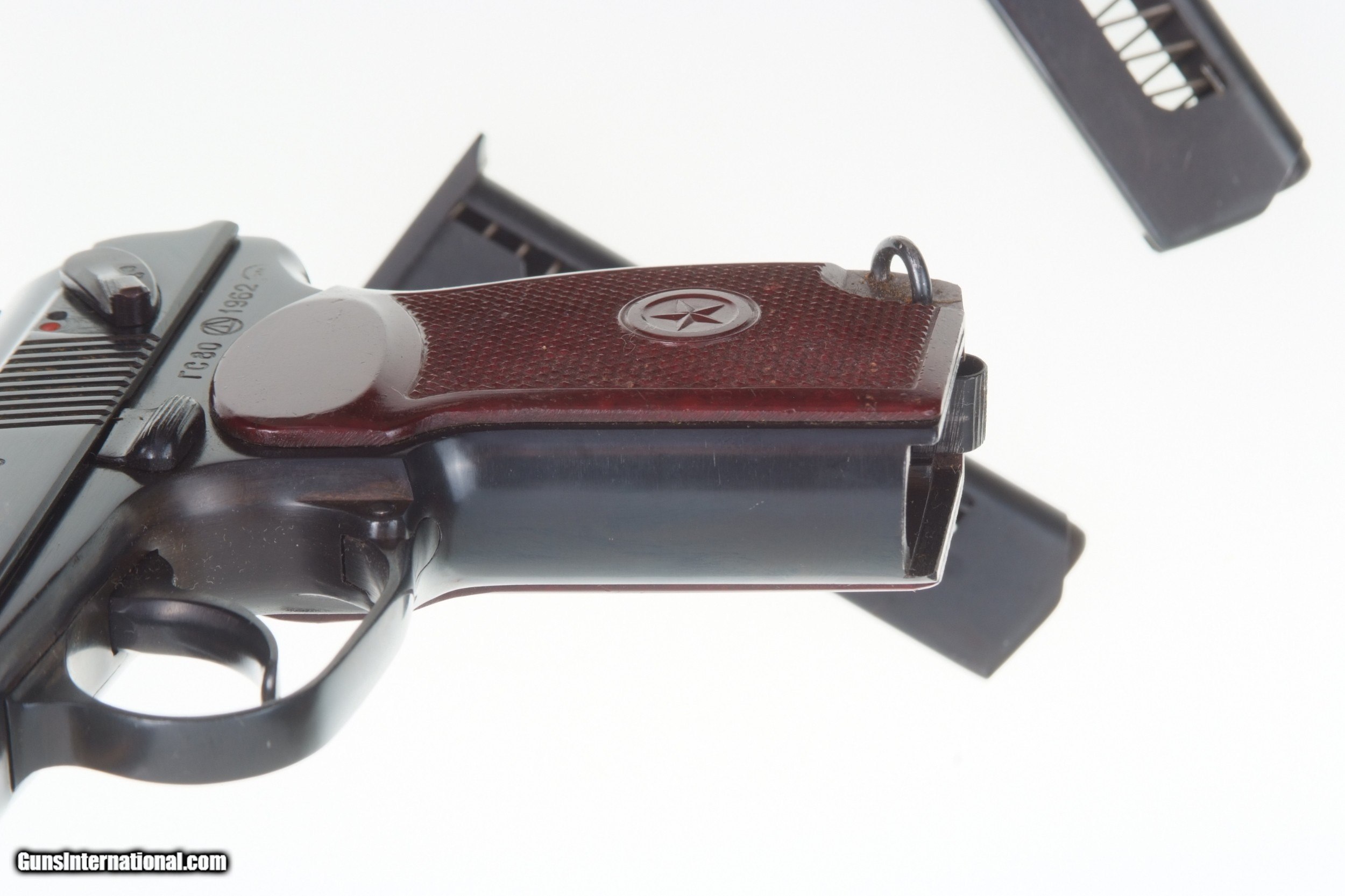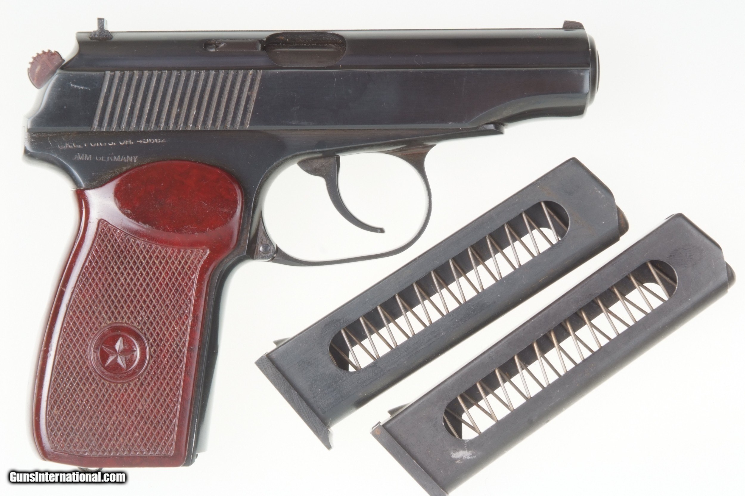 Description: Scarce Russian Makarov, dated 1962, with two electro-penciled matching magazines. SN: RC80. Cal: 9mmMak. Standard configuration Makarov with fixed front sight and drift adjustable rear sight. Full serial number on left side of slide, safety, left side of frame, and electro-penciled on the left side of each of the two magazines. Izhevsk Arsenal marking on left side of frame. Import markings as imaged. Single piece reddish maroon plastic grip with two checkered panels impressed with encircled 5 pointed star. Condition: Bright 98% original salt blue with comparable condition later-era magazines. Mirror bore, perfect manual mechanics with both magazines. A super condition, early, Russian Makarov with two electro-penciled (later-era) matching magazines. A HISTORIC INVESTMENT! #A-299. SOLD Curio/Relic: Yes Manufacturer: Izhevsk Model: Makarov |