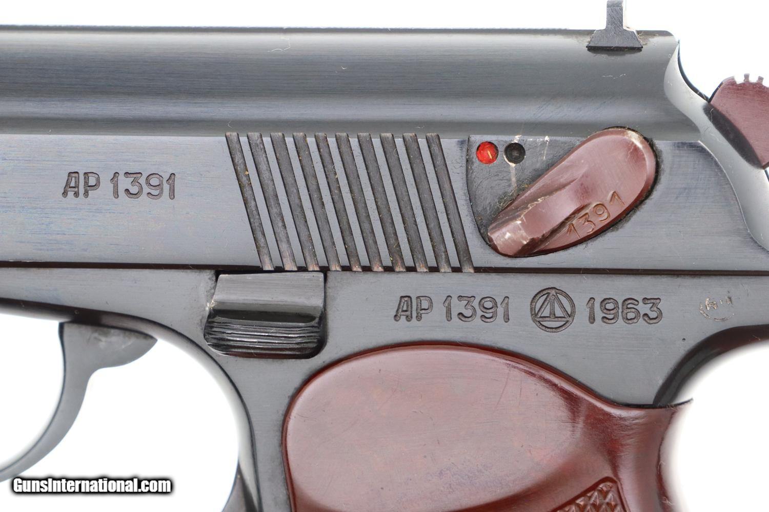 Beautiful, standard configuration Russian Makarov made by Izhvesk, dated 1963, with fixed front sight and drift adjustable rear sight. Izhevsk Arsenal marking on left side of frame along with manufacturing date of "1963”. Import marked on right side of frame. Early matching safety. Single piece reddish maroon plastic grip with two checkered panels impressed with encircled 5 pointed star. Complete with two early factory matching Russian magazines.
