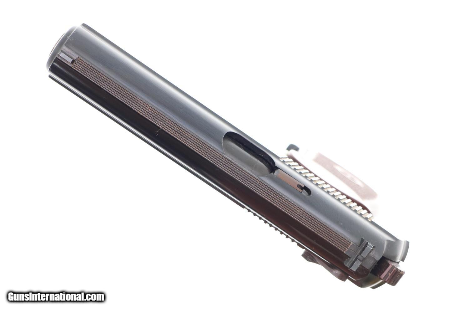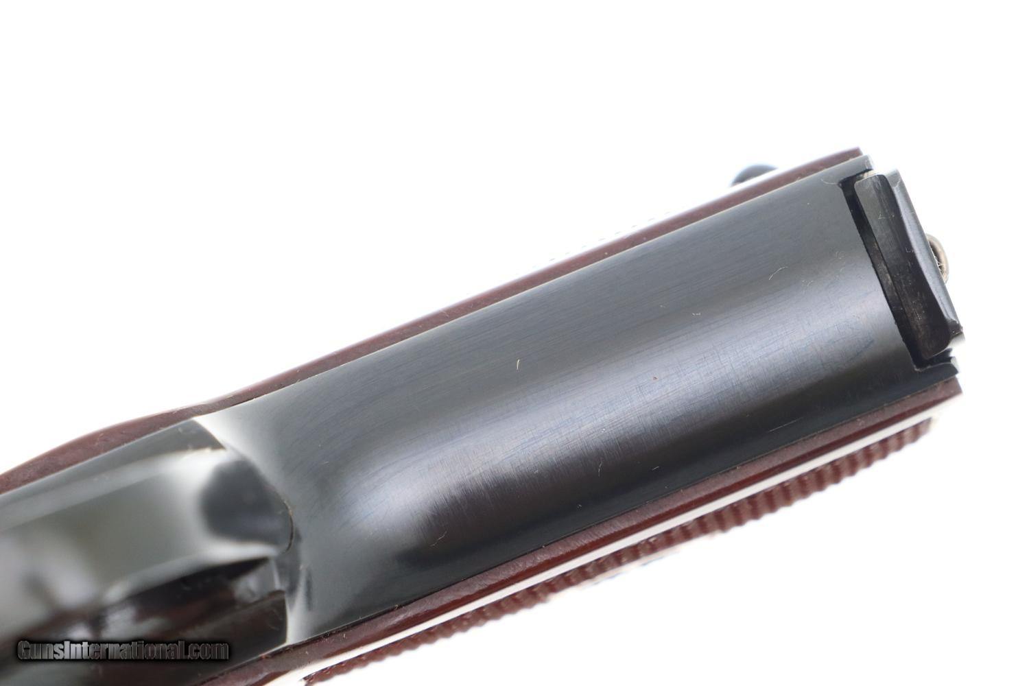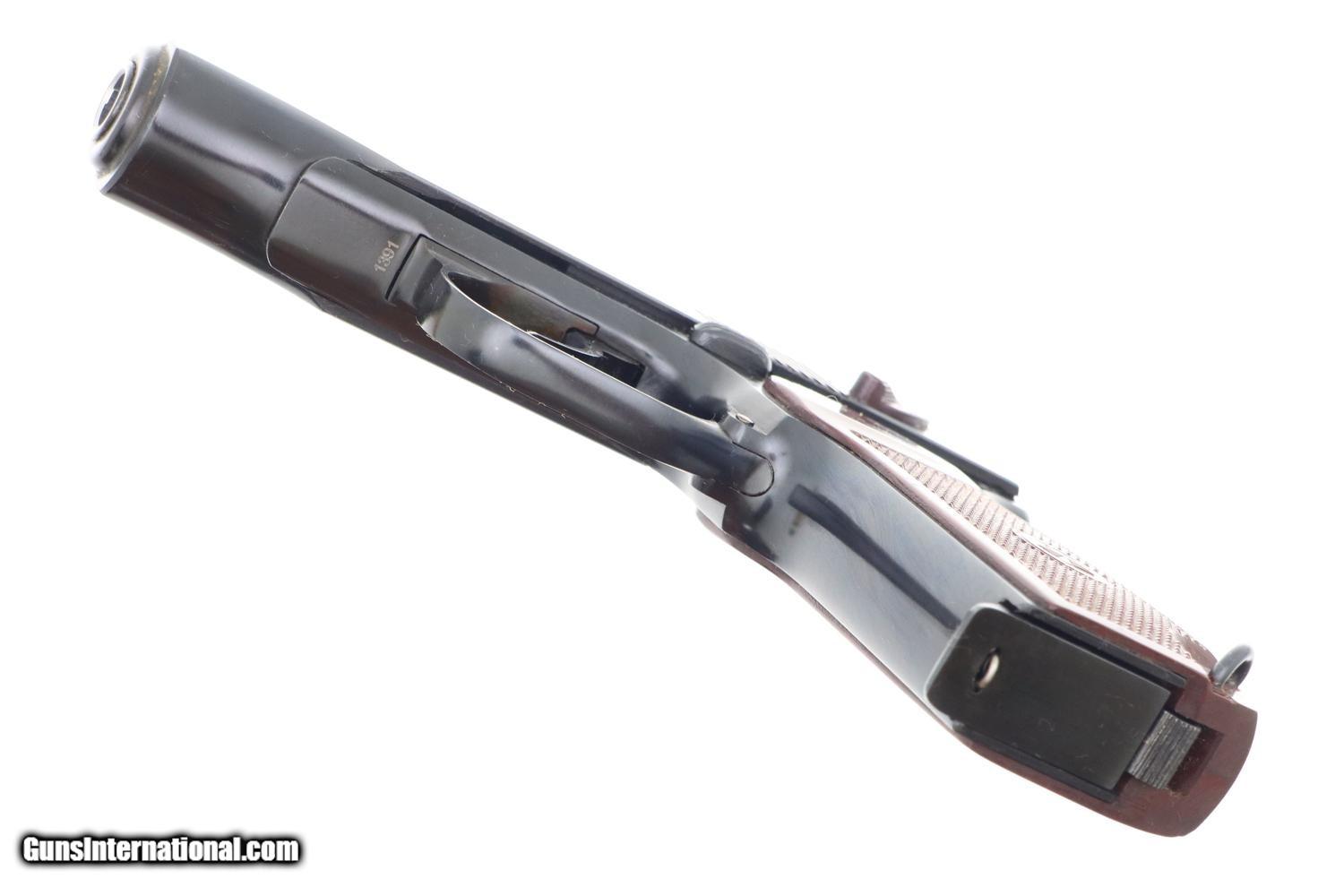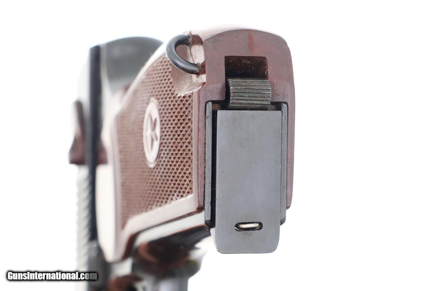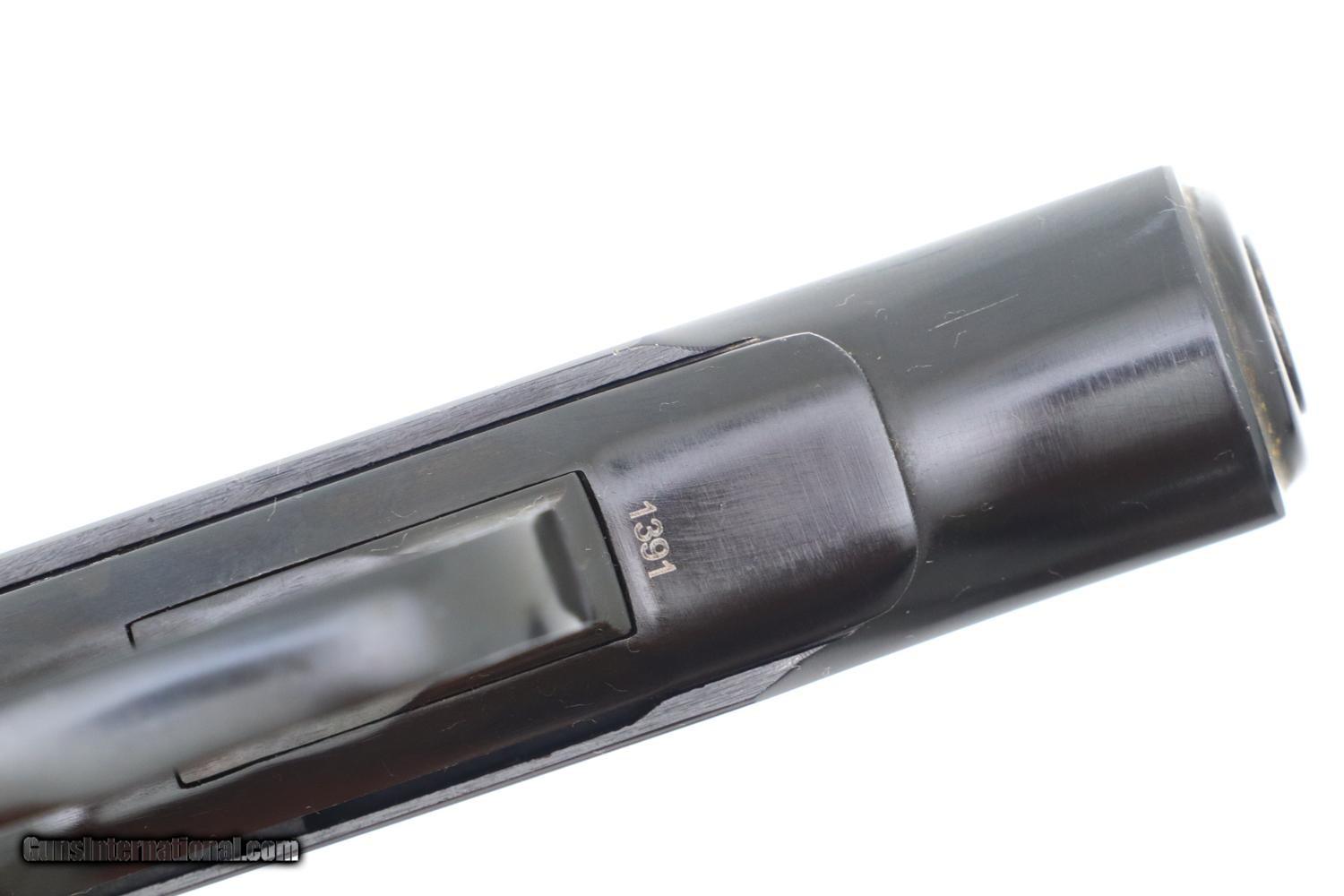 Description: Synopsis: Near New Russian Military Makarov Pistol, made by Izhvesk, 1963 Dated, with Two Factory Matching Magazines. A beautiful ensemble, no longer importable, that would be difficult to improve upon. Description: Beautiful, standard configuration Russian Makarov made by Izhvesk, dated 1963, with fixed front sight and drift adjustable rear sight. Izhevsk Arsenal marking on left side of frame along with manufacturing date of "1963”. Import marked on right side of frame. Early matching safety. Single piece reddish maroon plastic grip with two checkered panels impressed with encircled 5 pointed star. Complete with two early factory matching Russian magazines. Condition: Stunning 99.5% bright original salt blue, plum-toned hammer and safety reflecting a different degree of hardness, comparably crisp grip with only the most minute storage-related scuffing, magazines with very minor insertional wear. A beautiful Russian military Makarov from 1963 with two factory matching magazines whose condition would be extremely difficult to improve upon, well suited for an advanced collector. Curio/Relic: Yes Manufacturer: Izhevsk Model: Makarov Serial Number: 1391 Caliber Info: 9mm Condition: EXC Price: $2,495.00 Contact Seller |