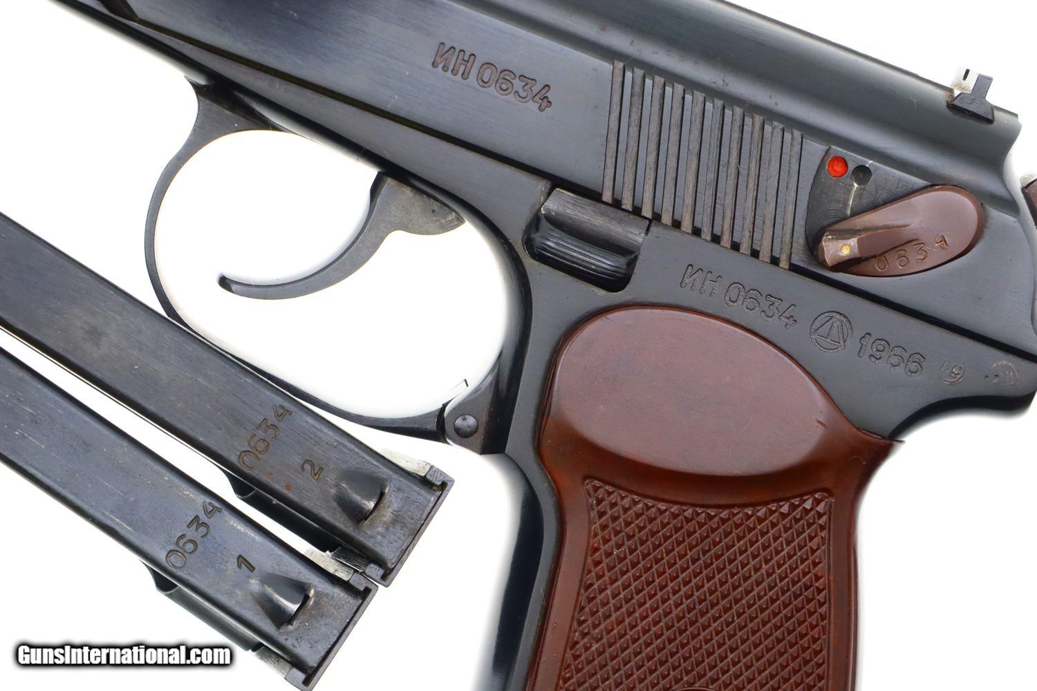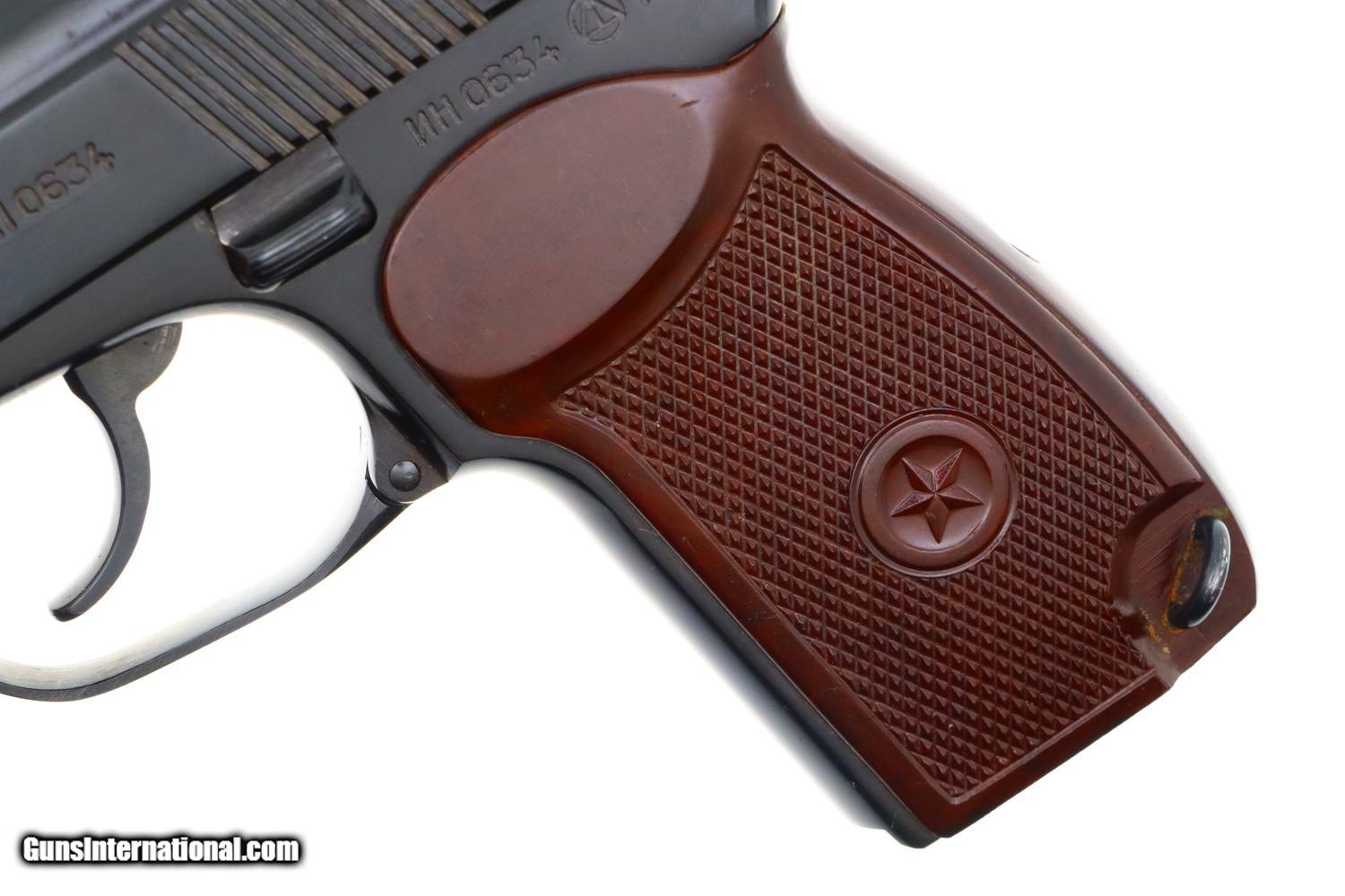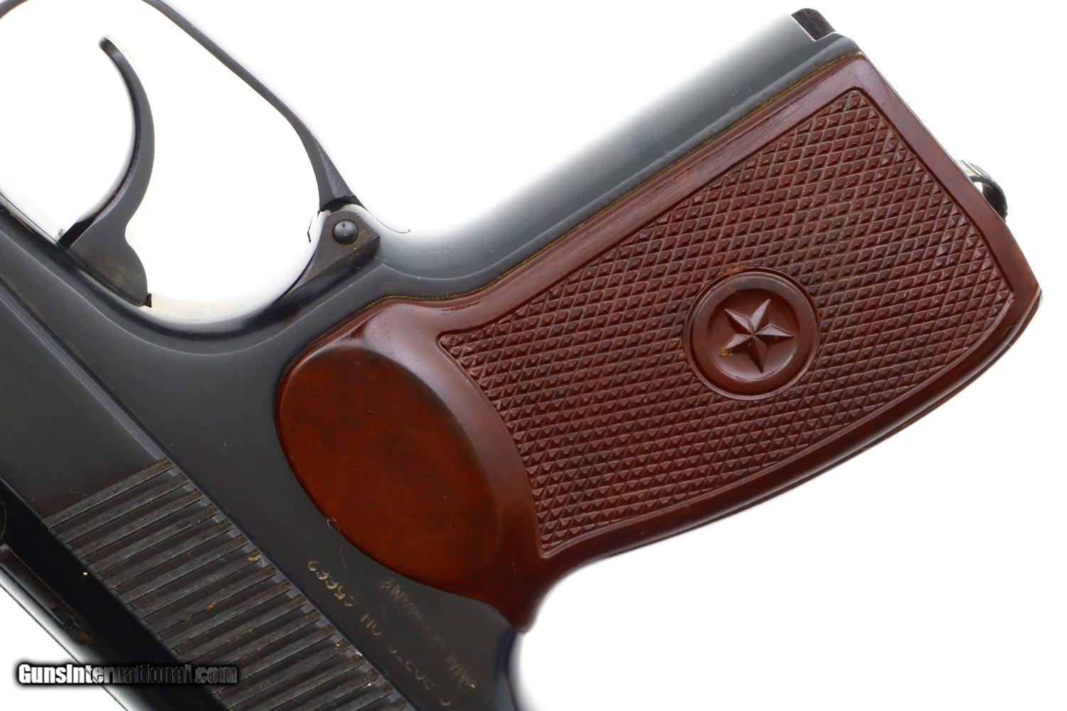 Description: Synopsis: Russian, Izhevsk, Military Makarov, 1966 Dated, 0634, FB00422 Description: Beautiful standard configuration Makarov, dated 1966, with fixed front sight and drift adjustable rear sight. Izhevsk Arsenal marking on left side of frame along with manufacturing date of "1966”. Import marked on right side of frame. Standard configuration safety and two early factory matching Russian magazines. Single piece reddish maroon plastic grip with two checkered panels impressed with encircled 5 pointed star. Condition: 99% bright original salt blue with handling marks as imaged. Bright bore with shallow rifling. Perfect manual mechanics with both magazines. A gorgeous example, whose appeal could be easily improved by the inclusion of a correct holster. ~~Insured shipping fee of $55; most packages shipped using FedEx 2nd Day.~~ SOLD Manufacturer: Izhevsk Serial Number: 0634 Caliber Info: 9mm |