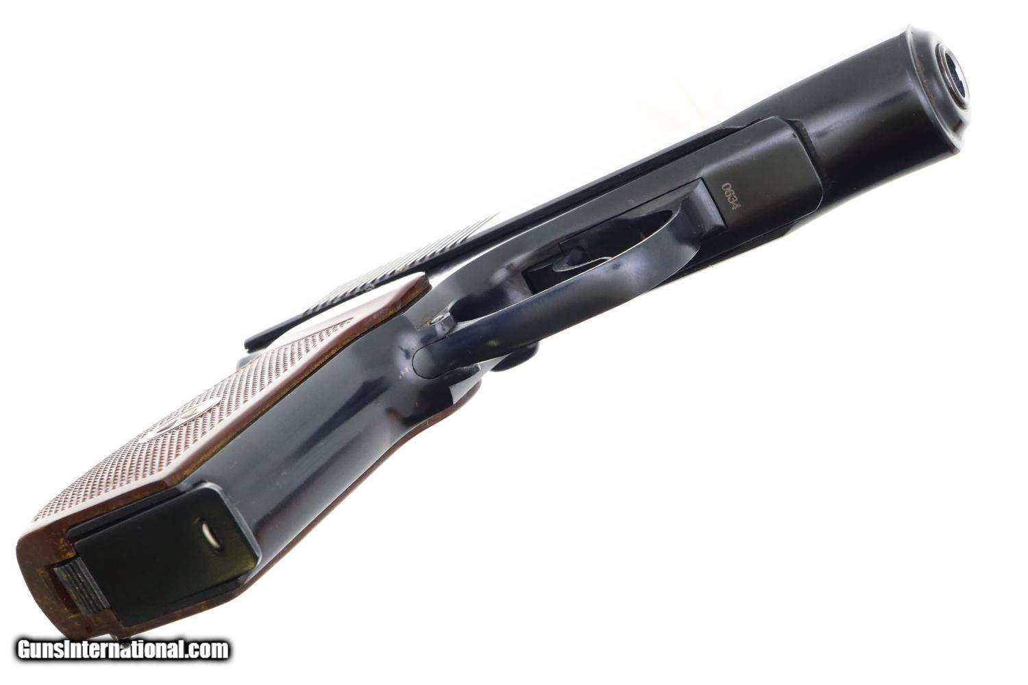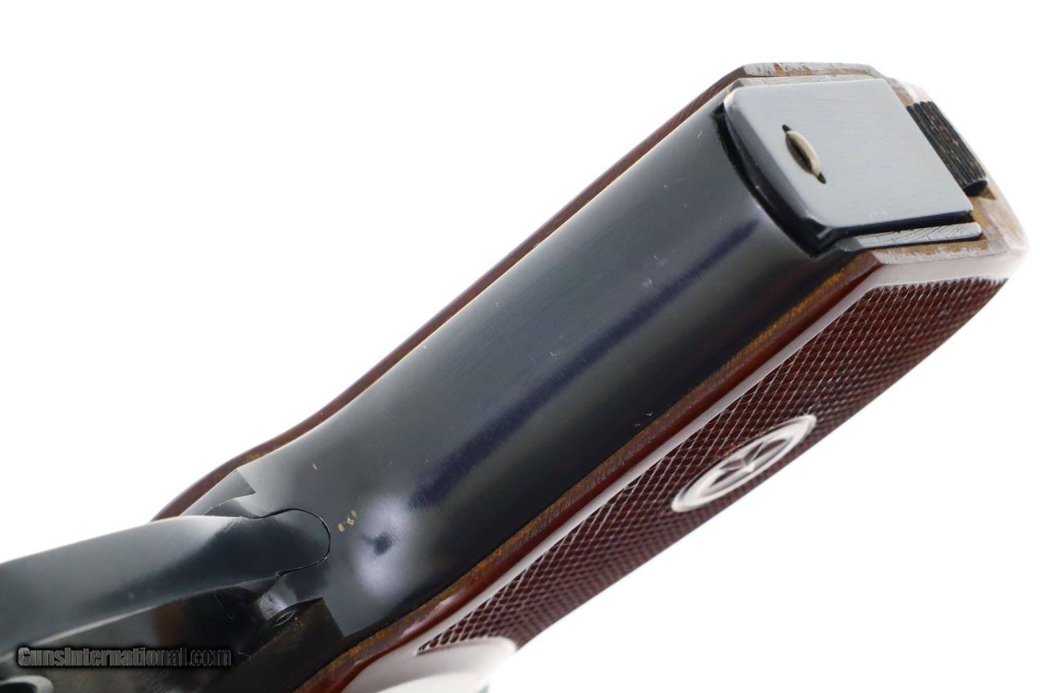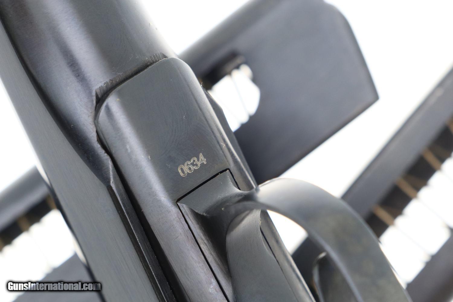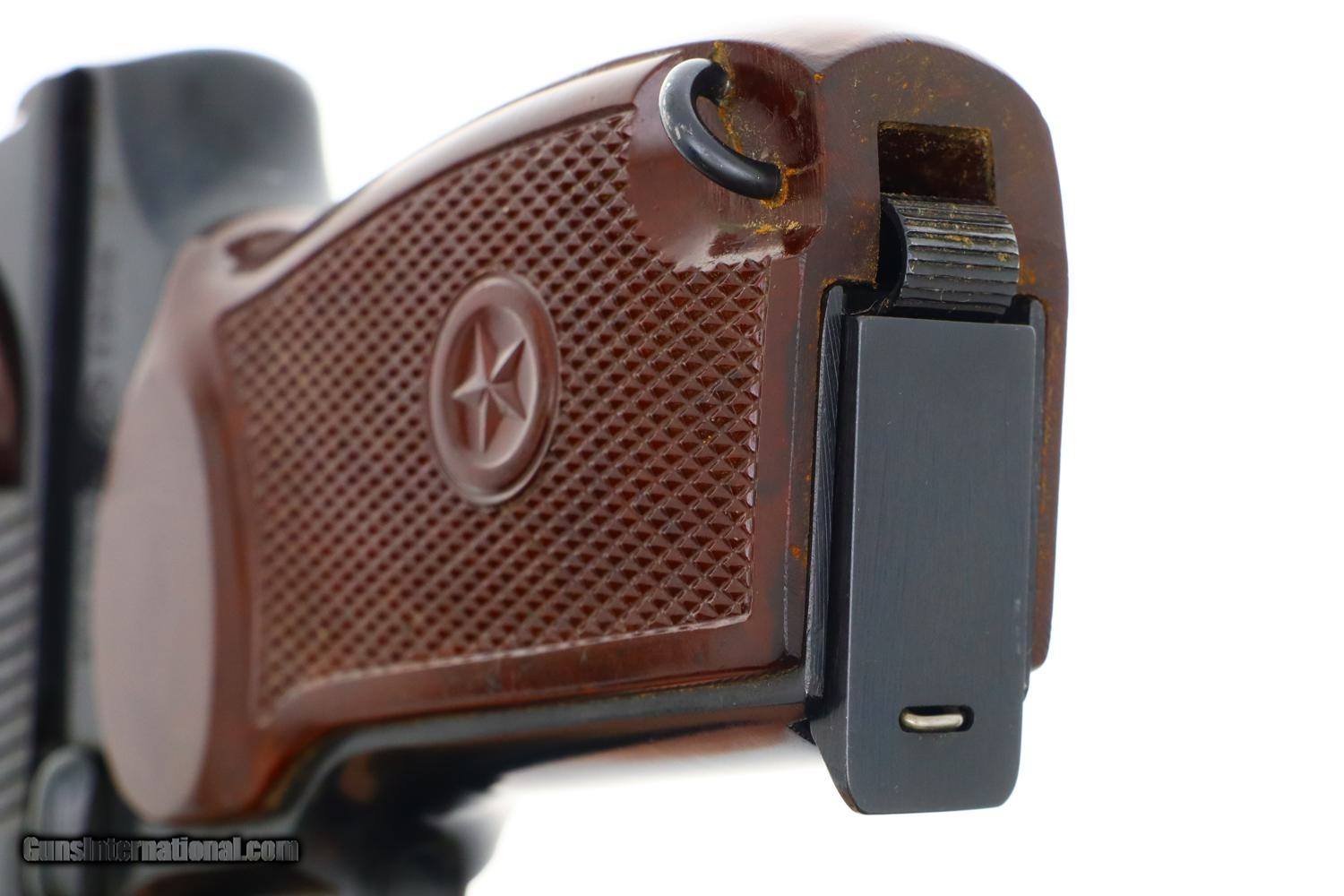 Description: Synopsis: Russian, Izhevsk, Military Makarov, 1966 Dated, 0634, FB00422 Description: Beautiful standard configuration Makarov, dated 1966, with fixed front sight and drift adjustable rear sight. Izhevsk Arsenal marking on left side of frame along with manufacturing date of "1966”. Import marked on right side of frame. Standard configuration safety and two early factory matching Russian magazines. Single piece reddish maroon plastic grip with two checkered panels impressed with encircled 5 pointed star. Condition: 99% bright original salt blue with handling marks as imaged. Bright bore with shallow rifling. Perfect manual mechanics with both magazines. A gorgeous example, whose appeal could be easily improved by the inclusion of a correct holster. ~~Insured shipping fee of $55; most packages shipped using FedEx 2nd Day.~~ SOLD Manufacturer: Izhevsk Serial Number: 0634 Caliber Info: 9mm |