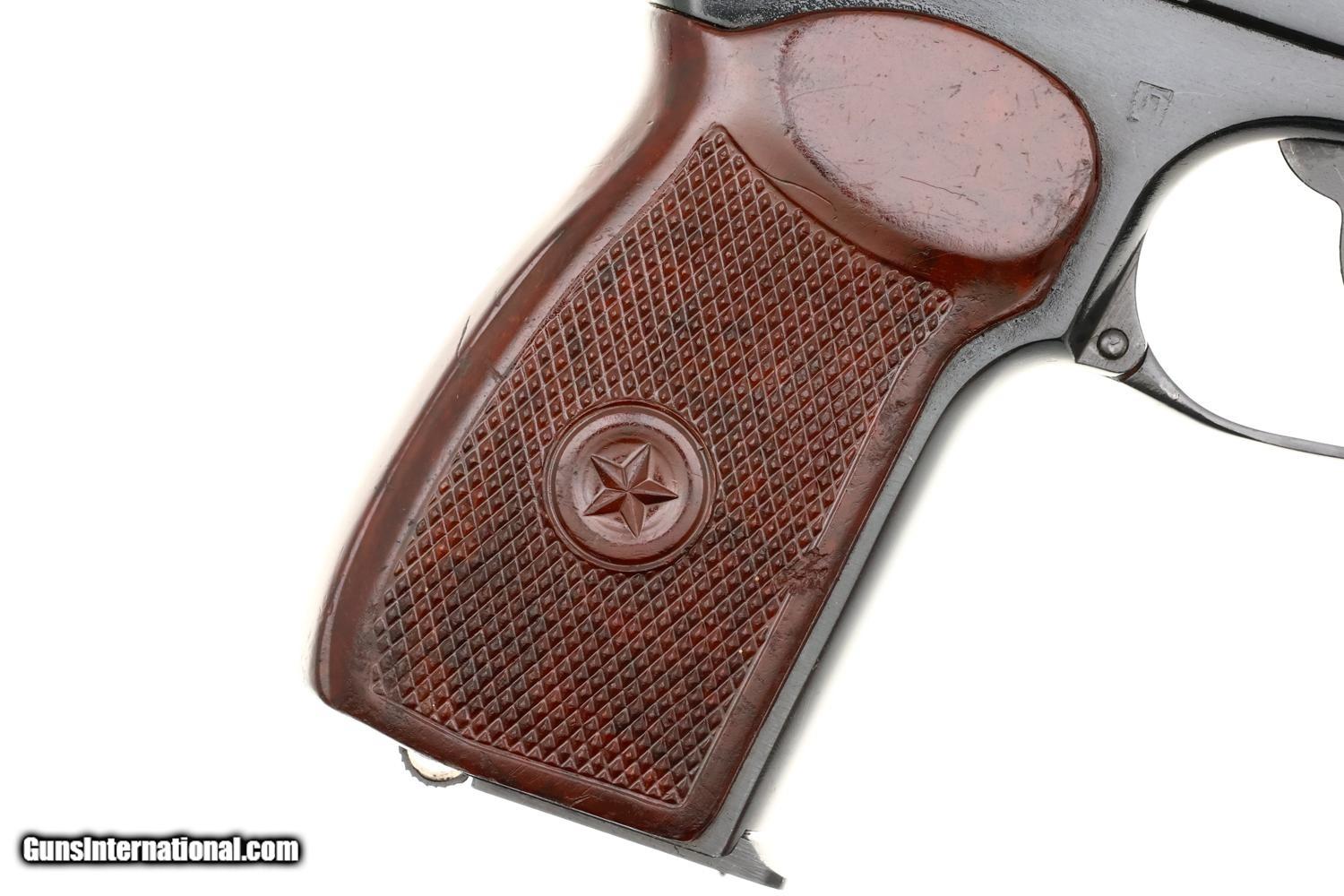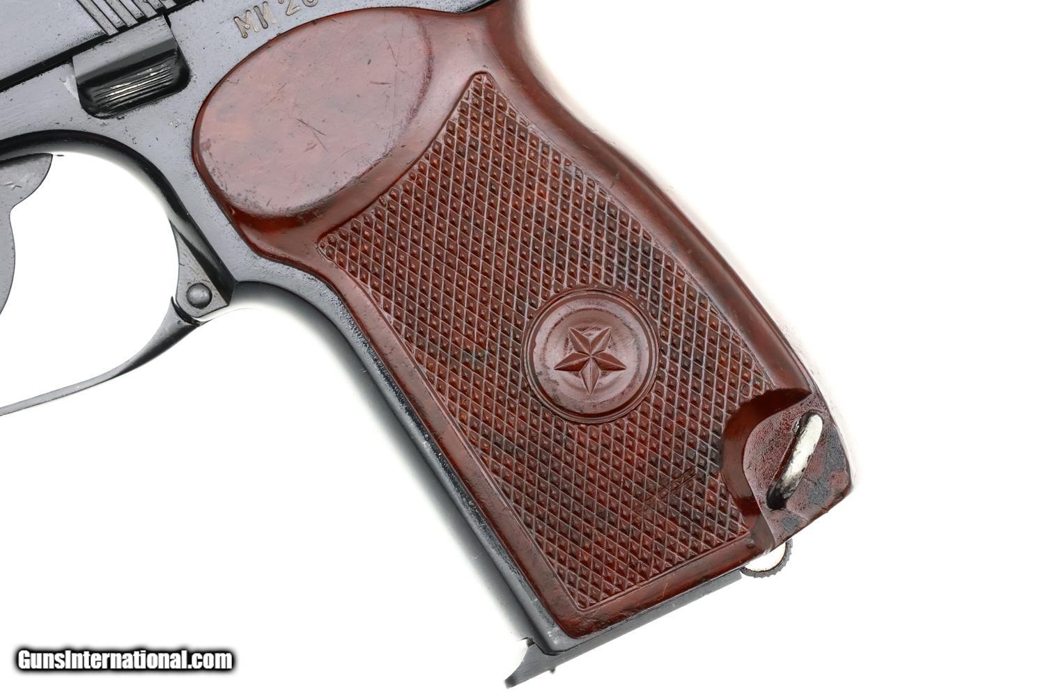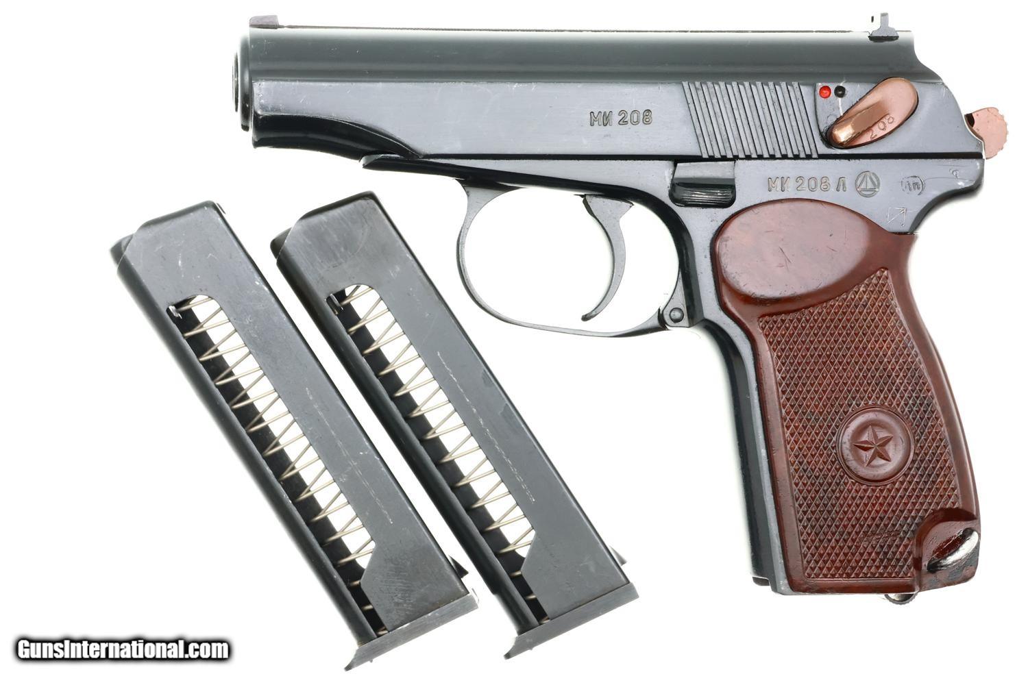Standard configuration Izhevsk Makarov pistol in 9mmMak with fixed blade front sight and drift adjustable rear sight. Left side of slide marked "M? 208" with matching "M? 208 " on the left side of frame followed by Izhevsk logo and "?" date code reflecting production in 1959. Matching safety lever. Forward frame extension marked "208". Import marks on right side of frame. Reddish brown bakelite grip molded with encircled 5-pointed star on each side. Two late style eight-round magazines, one electropencil-numbered "208-1", the other "208-2", both numbered on spine. The PM was designed by Nikolay Makarov to replace the TT pistol, becoming the standard service pistol of the Soviet Armed Forces and the Military in 1951, one of the most-produced and recognizable firearms in the world.