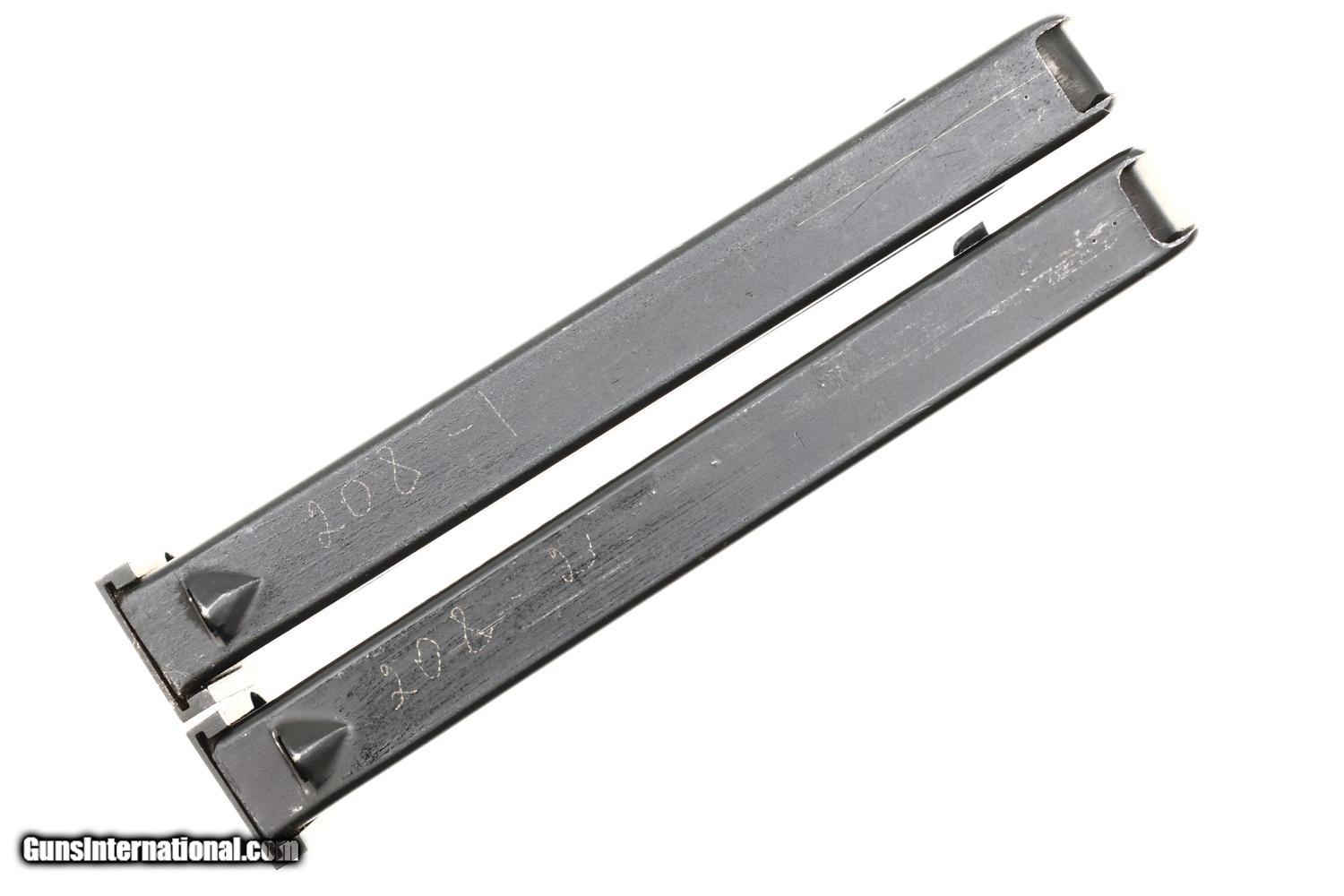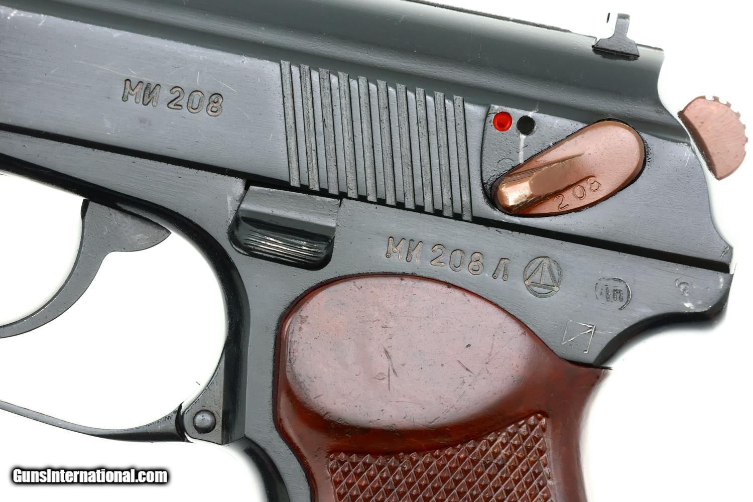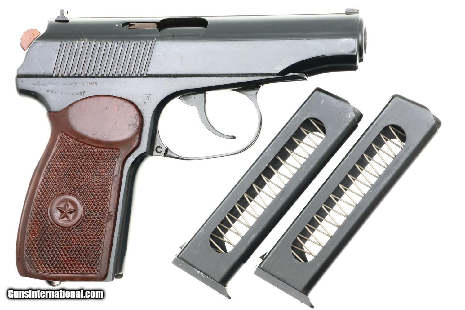 Standard configuration Izhevsk Makarov pistol in 9mmMak with fixed blade front sight and drift adjustable rear sight. Left side of slide marked "M? 208" with matching "M? 208 " on the left side of frame followed by Izhevsk logo and "?" date code reflecting production in 1959. Matching safety lever. Forward frame extension marked "208". Import marks on right side of frame. Reddish brown bakelite grip molded with encircled 5-pointed star on each side. Two late style eight-round magazines, one electropencil-numbered "208-1", the other "208-2", both numbered on spine. The PM was designed by Nikolay Makarov to replace the TT pistol, becoming the standard service pistol of the Soviet Armed Forces and the Military in 1951, one of the most-produced and recognizable firearms in the world.