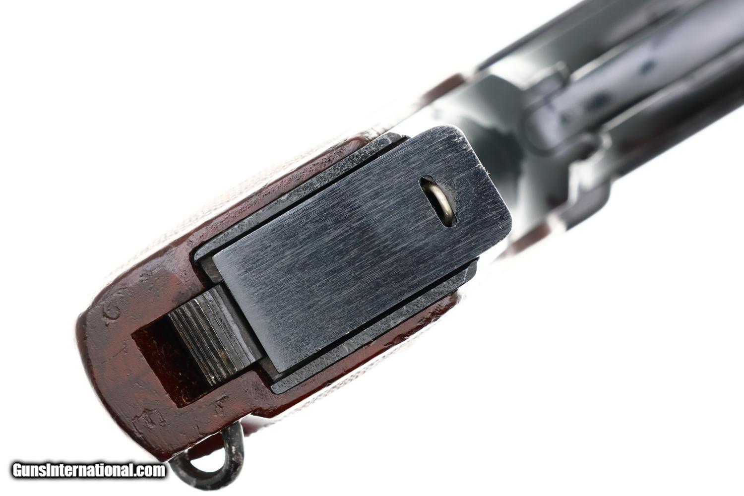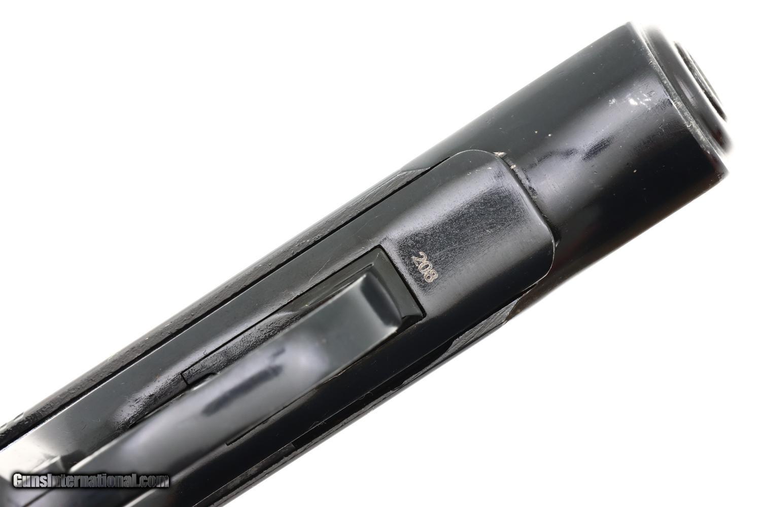 Description: Synopsis: Very early Russian Military Makarov from 1959, Date Coded 1959, with later electropenciled-to-match magazines. Extremely unusual to find a pistol with such an early date! Description: Standard configuration Izhevsk Makarov pistol in 9mmMak with fixed blade front sight and drift adjustable rear sight. Left side of slide marked "M? 208" with matching "M? 208 " on the left side of frame followed by Izhevsk logo and "?" date code reflecting production in 1959. Matching safety lever. Forward frame extension marked "208". Import marks on right side of frame. Reddish brown bakelite grip molded with encircled 5-pointed star on each side. Two late style eight-round magazines, one electropencil-numbered "208-1", the other "208-2", both numbered on spine. The PM was designed by Nikolay Makarov to replace the TT pistol, becoming the standard service pistol of the Soviet Armed Forces and the Military in 1951, one of the most-produced and recognizable firearms in the world. Condition: 98% salt blue with light holster wear at muzzle, a few scattered handling marks, the blue slightly dulled on the frontstrap. Comparable condition grip. Mirror bore. Correct manual mechanics with both magazines. Curio/Relic: Yes Manufacturer: Izhevsk Model: Makarov Serial Number: 208 Caliber Info: 9mm Condition: EXC Price: $2,995.00 Contact Seller |