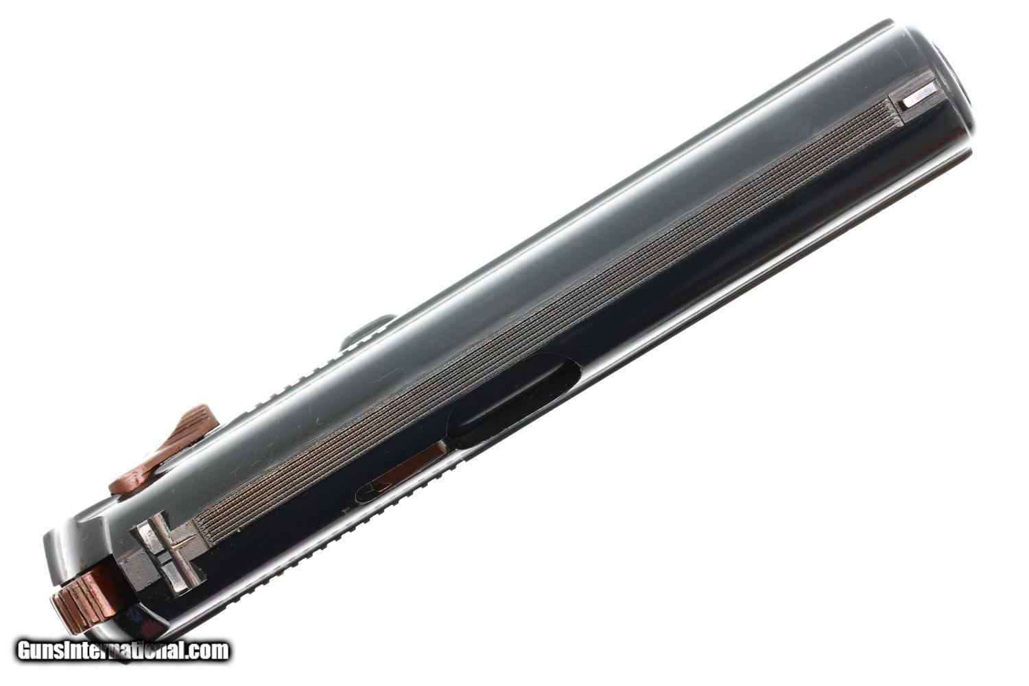 98% salt blue with light holster wear at muzzle, a few scattered handling marks, the blue slightly dulled on the frontstrap. Comparable condition grip. Mirror bore. Correct manual mechanics with both magazines.