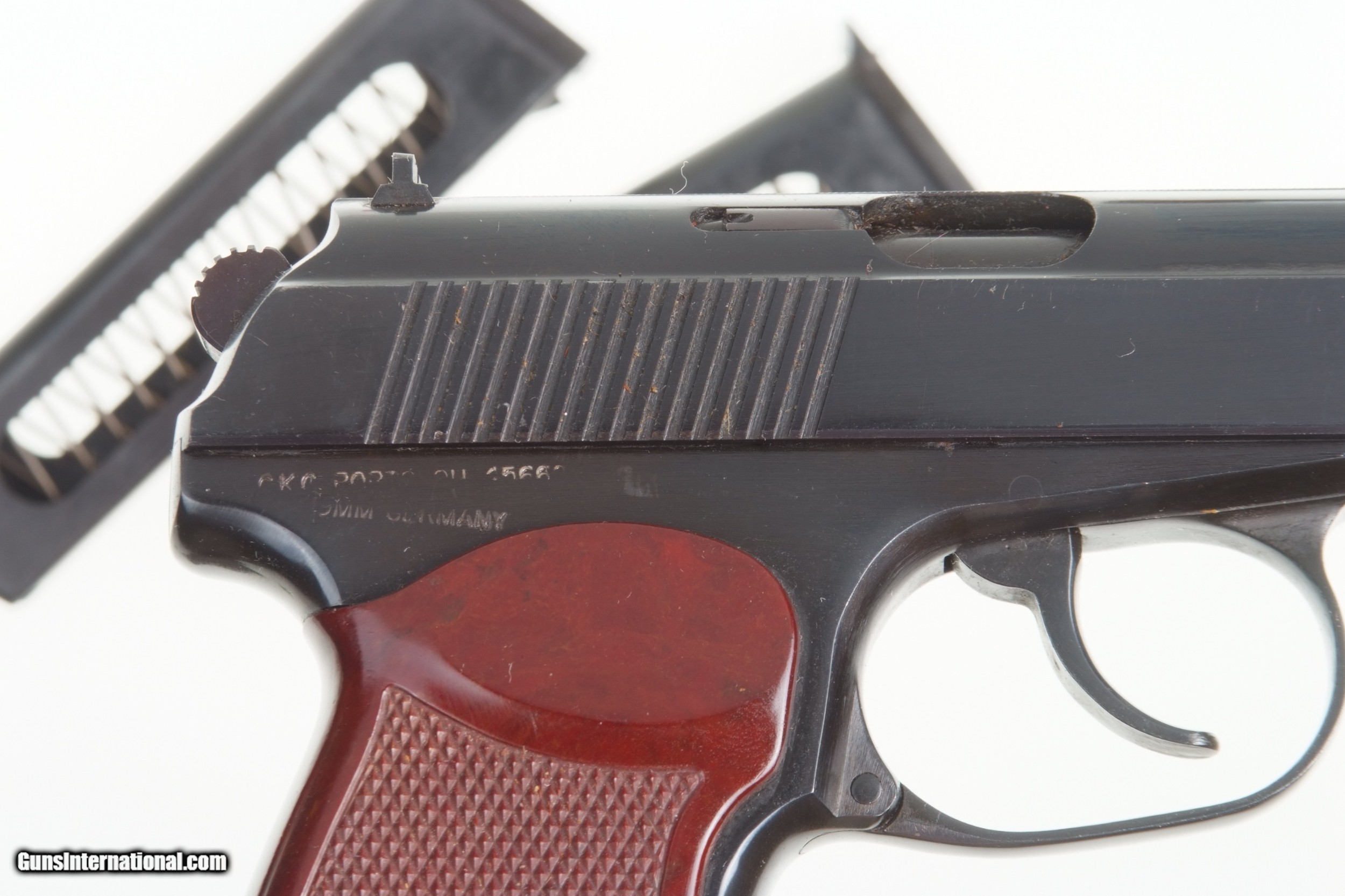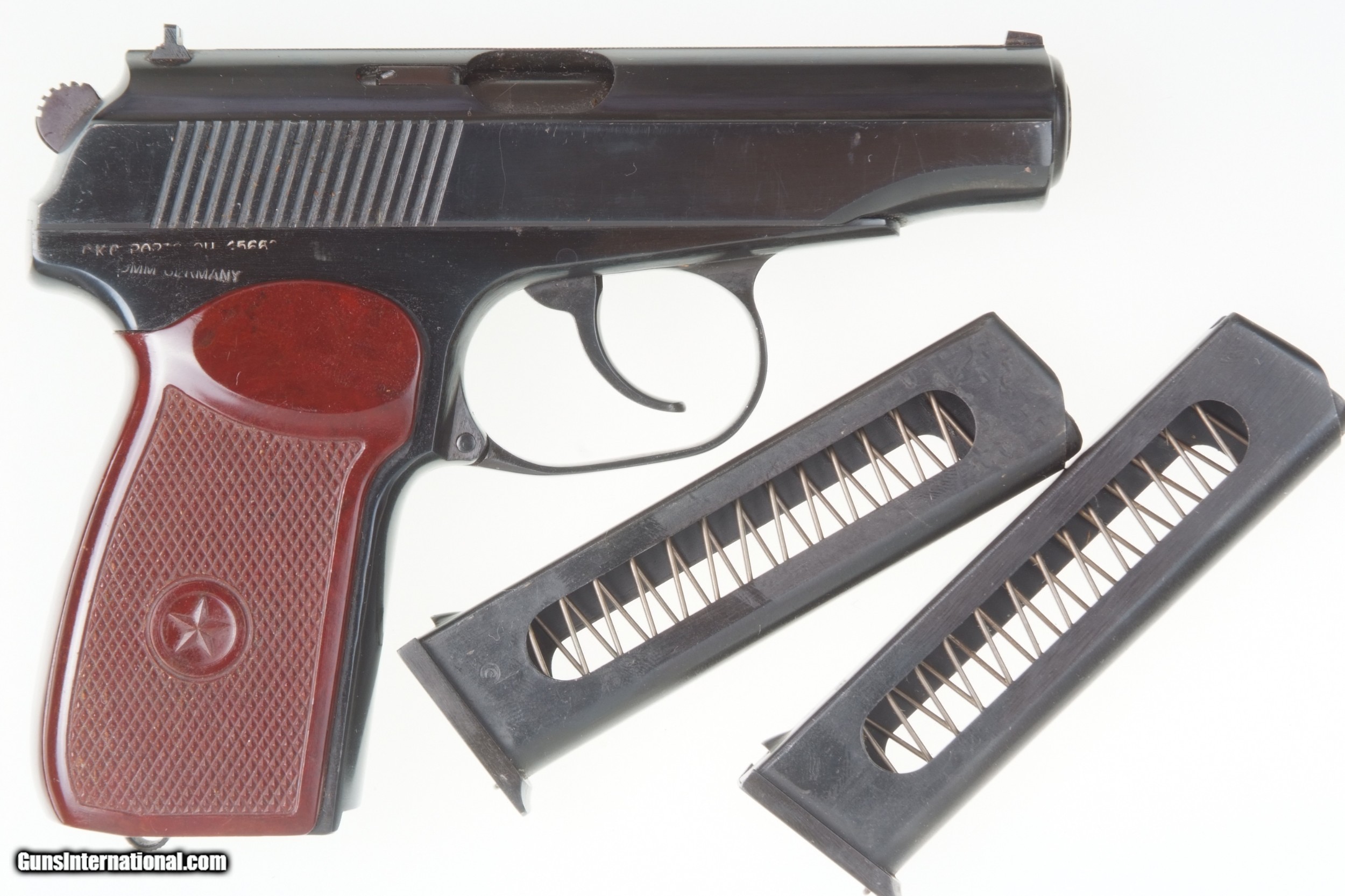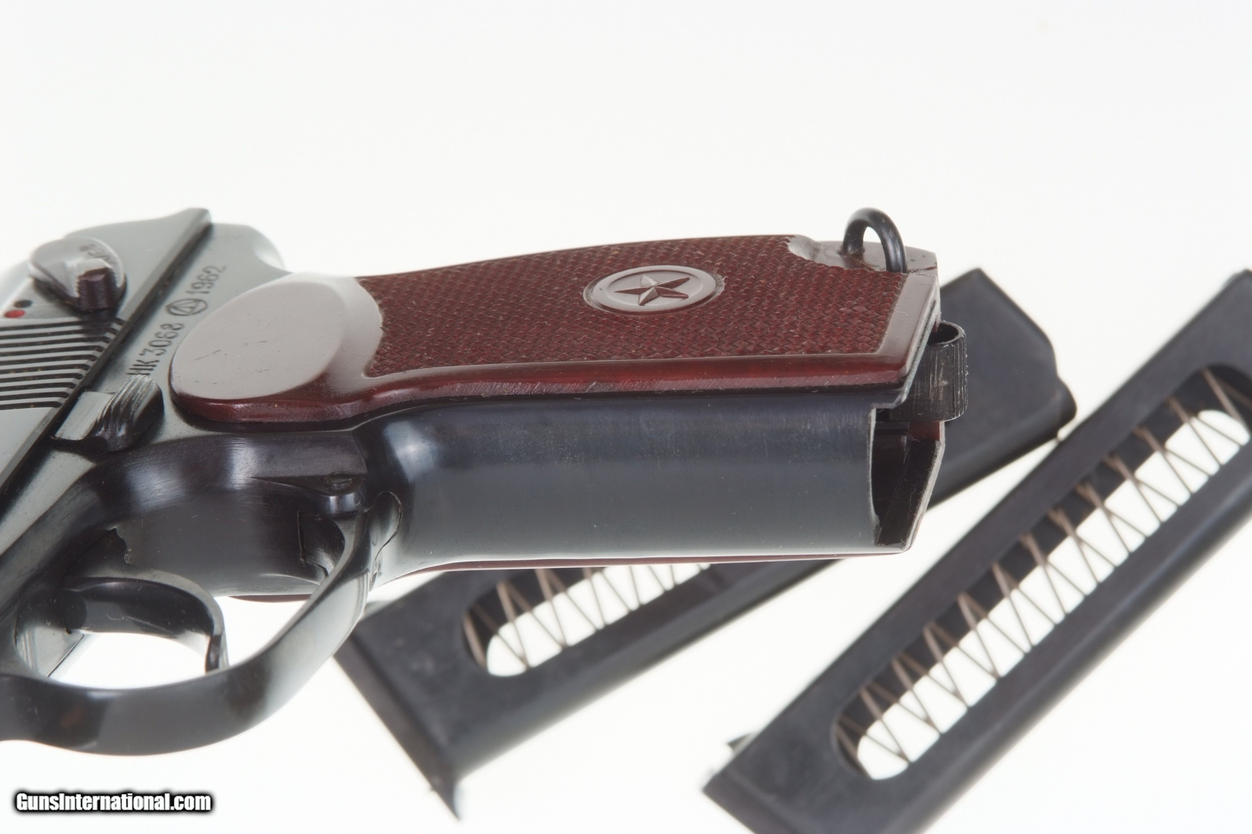 Description: Scarce Russian Makarov, dated 1962, with two factory-matching magazines. SN: HK3068. Cal: 9mmMak. Standard configuration Makarov with fixed front sight and drift adjustable rear sight. Full serial number on left side of slide, safety, and left side of frame. Original factory-matching magazines subnumbered “1” and “2”. Izhevsk Arsenal marking on left side of frame. Import markings as imaged. Single piece reddish maroon plastic grip with two checkered panels impressed with encircled 5 pointed star. Condition: Bright 98% original salt blue with comparable condition magazines. Mirror bore, perfect manual mechanics with both magazines. A super condition, early, Russian Makarov with two factory-matching magazines! A HISTORIC INVESTMENT! #A-298. SOLD Curio/Relic: Yes Manufacturer: Izhvesk Model: Makarov |