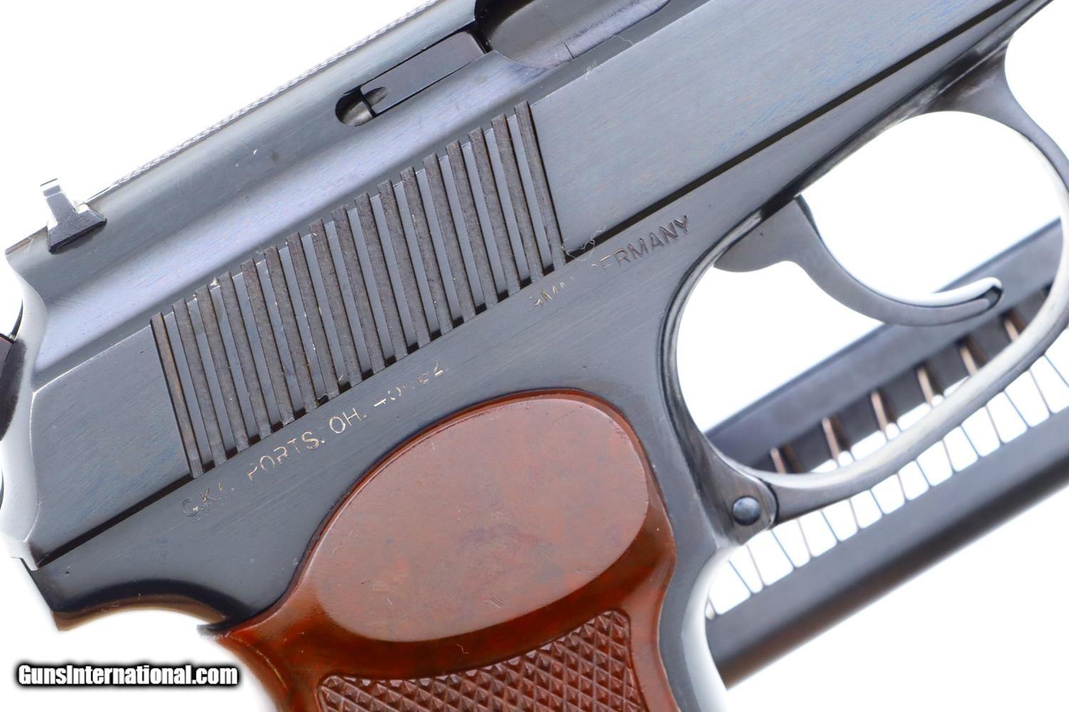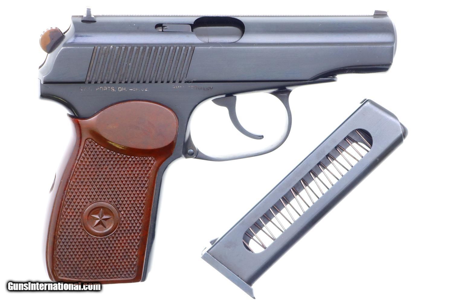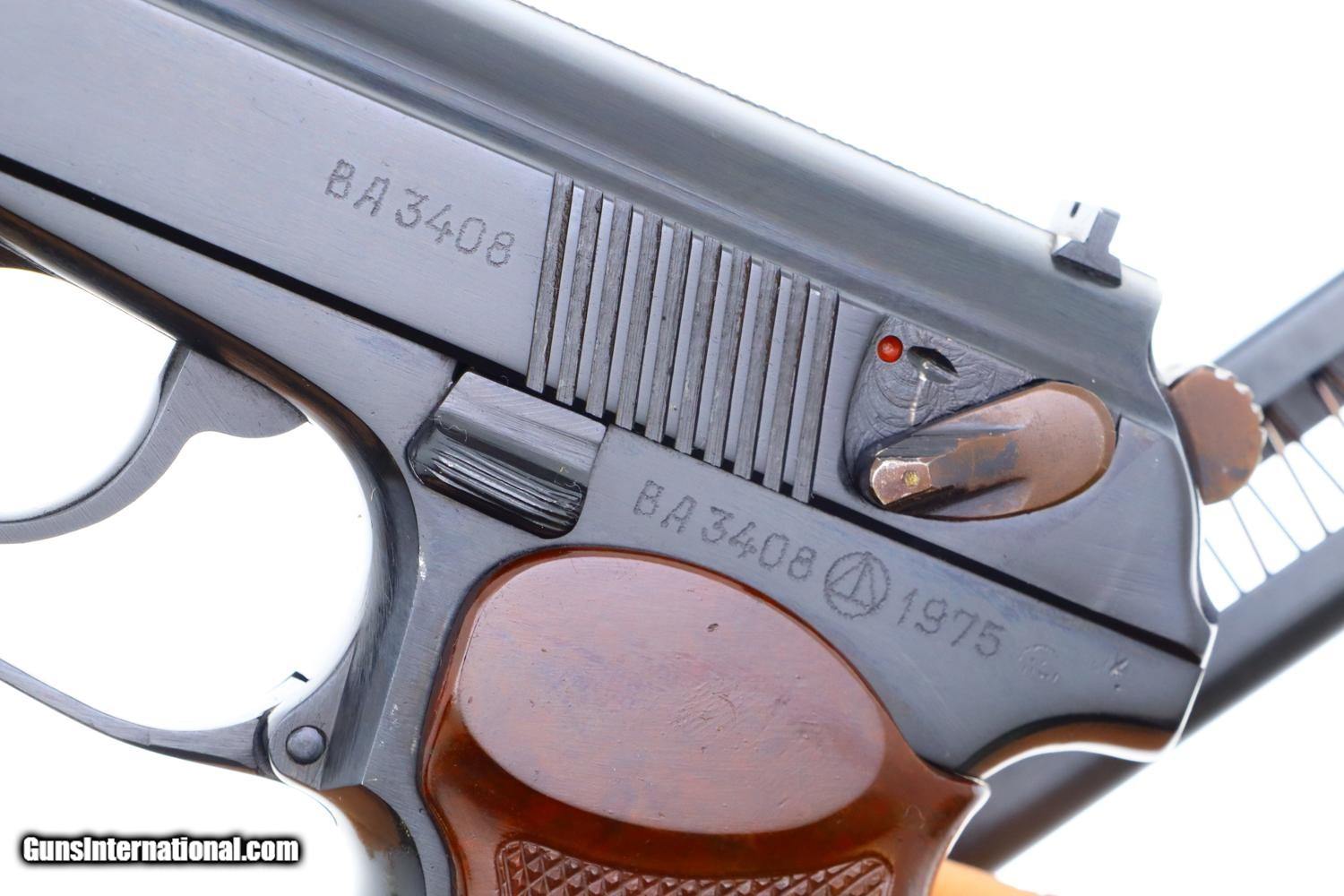 Standard configuration Makarov with fixed front sight and drift adjustable rear sight. Izhevsk Arsenal marking on left side of frame along with manufacturing date of "1975”. Import marked on right side of frame. Standard configuration safety and early Russian style unnumbered magazine. Single piece reddish maroon plastic grip with two checkered panels impressed with encircled 5 pointed star.