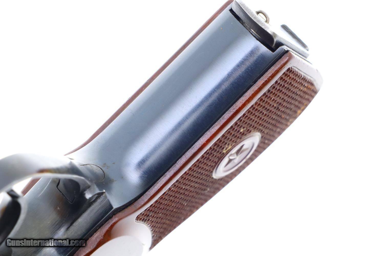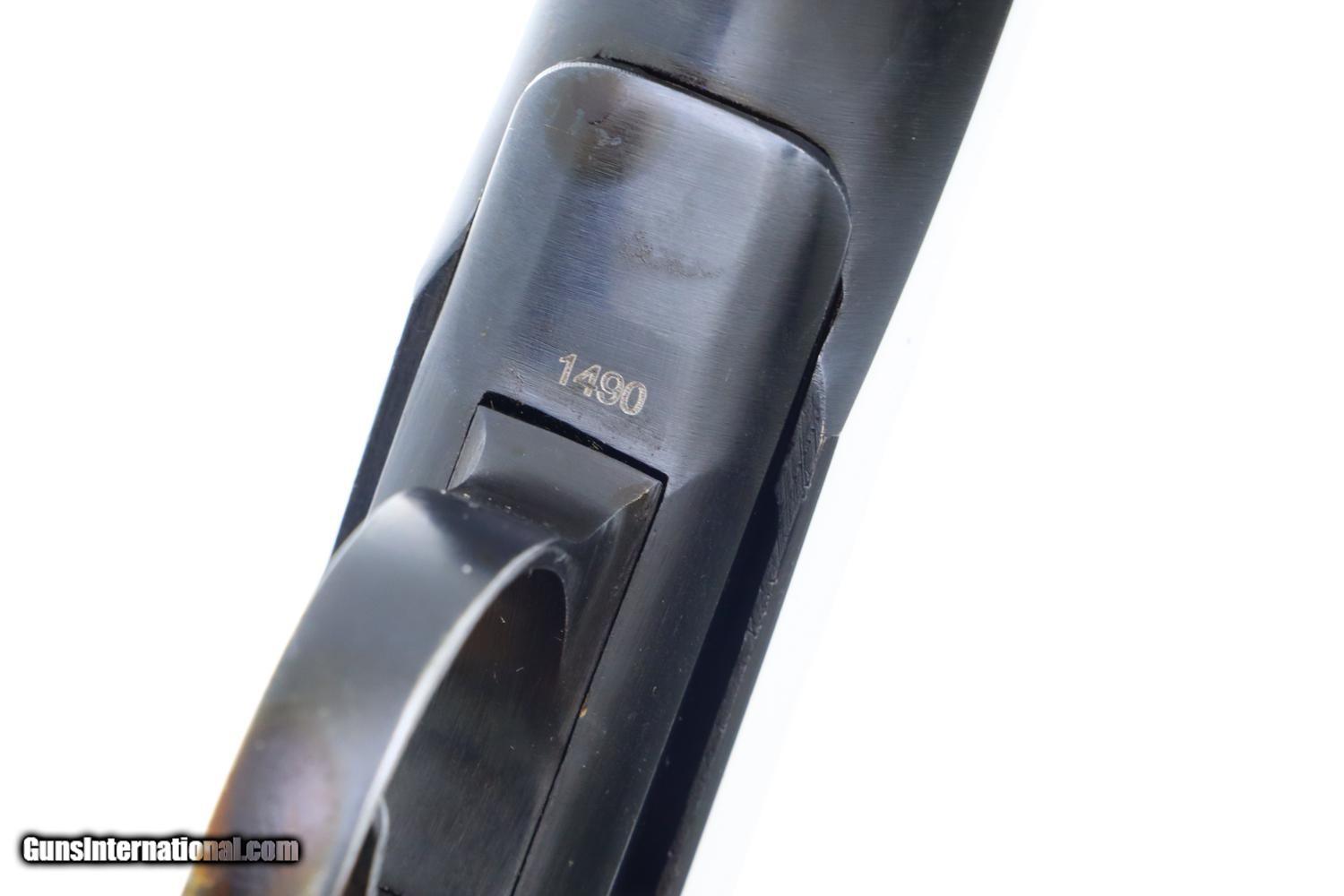 Description: Synopsis: Russian Makarov, Military, Izhevsk, 1976 Date, 1490, FB00491 Description: Standard configuration Makarov with fixed front sight and drift adjustable rear sight. Izhevsk Arsenal marking on left side of frame along with manufacturing date of "1976”. Import marked on right side of frame. Standard configuration safety and late Bulgarian style magazine electropenciled “5358-1”. Single piece reddish maroon plastic grip with two checkered panels impressed with encircled 5 pointed star. Condition: 98-99% bright original salt blue with handling marks as imaged. Bright bore. Perfect manual mechanics. Manufacturer: Izhevsk Model: Makarov Serial Number: 1490 Caliber Info: 9mm Condition: EXC Price: $995.00 Contact Seller |
