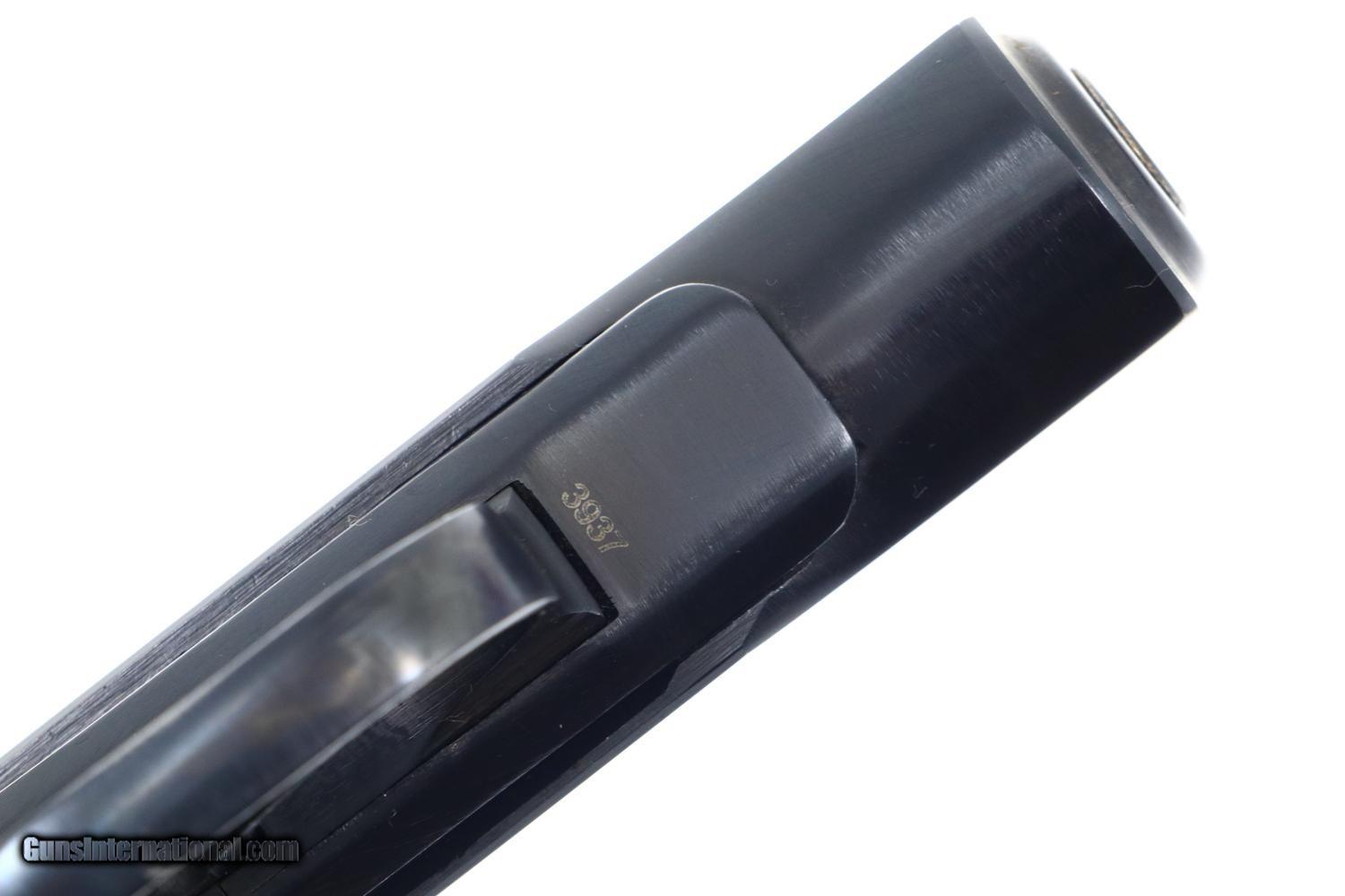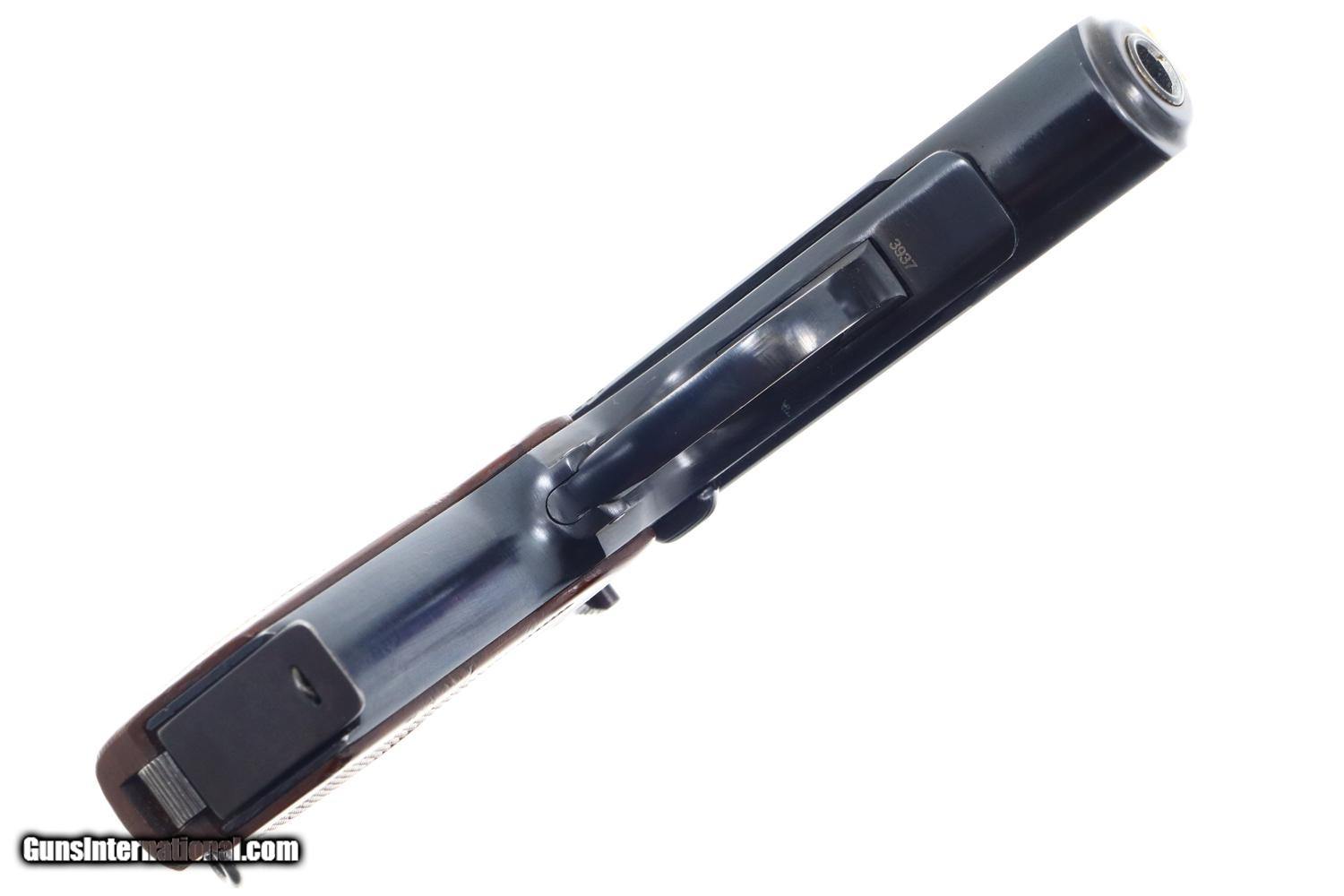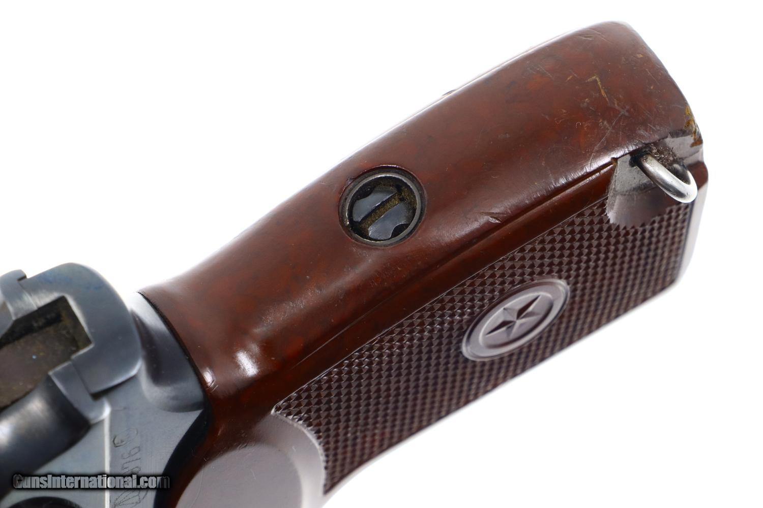 Description: Synopsis: Russian Makarov, Military, Izhevsk, 1976 Date, 3937, FB00478 Description: Standard configuration Makarov with fixed front sight and drift adjustable rear sight. Izhevsk Arsenal marking on left side of frame along with manufacturing date of "1976”. Import marked on right side of frame. Standard configuration safety and late Bulgarian style magazine electropenciled “2093-2”. Single piece reddish maroon plastic grip with two checkered panels impressed with encircled 5 pointed star. Condition: 99% bright original salt blue with negligible handling wear as imaged. Mirror bore. Perfect manual mechanics. SOLD Manufacturer: Izhevsk Model: Makarov Serial Number: 3937 Caliber Info: 9mm Condition: VG-EXC |