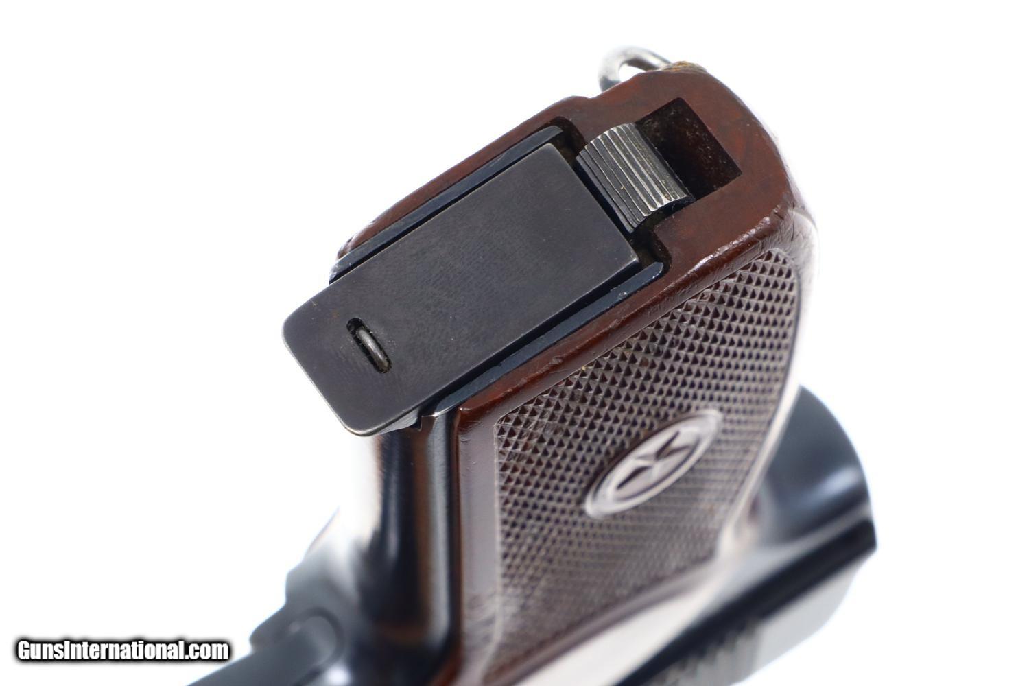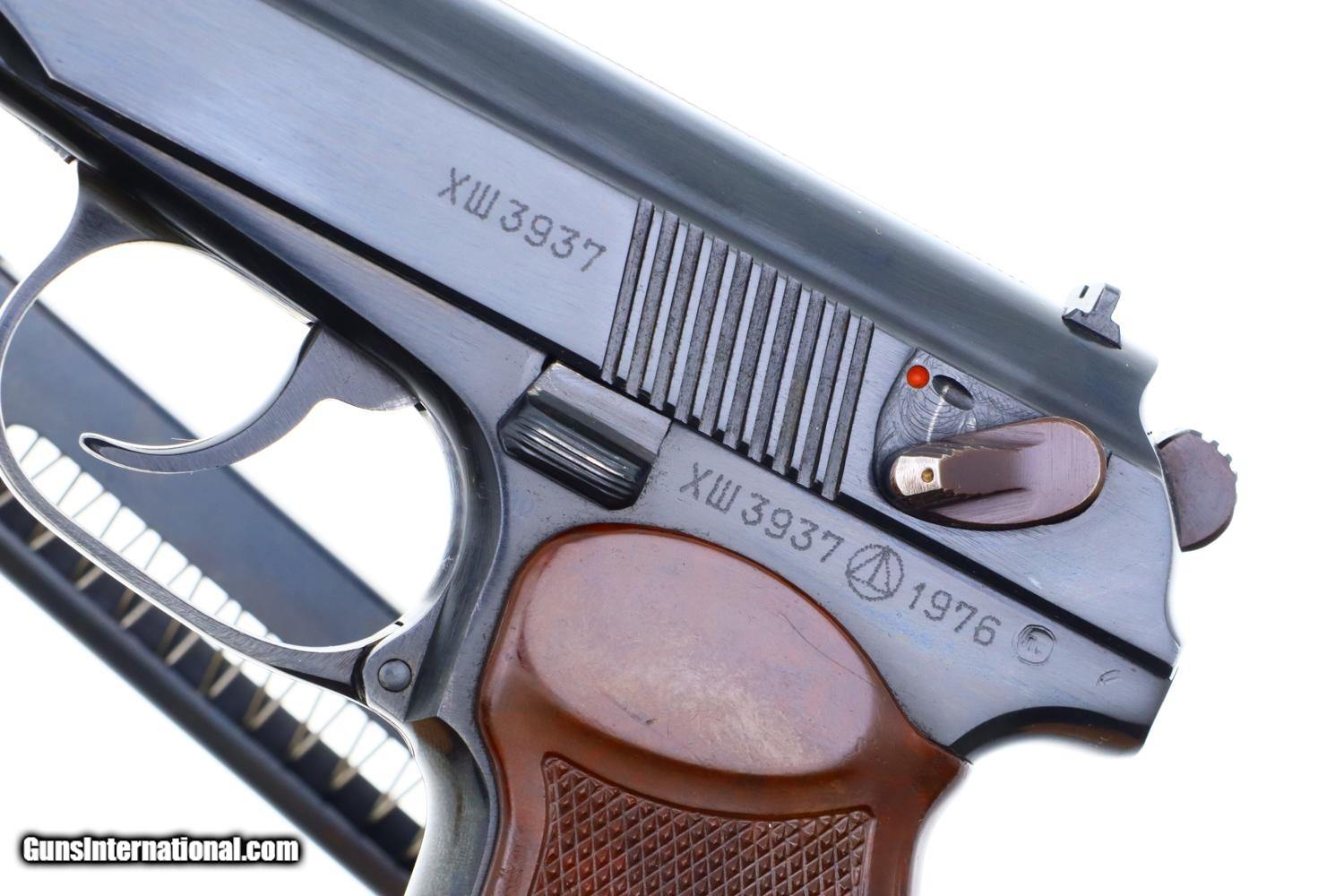 Standard configuration Makarov with fixed front sight and drift adjustable rear sight. Izhevsk Arsenal marking on left side of frame along with manufacturing date of "1976”. Import marked on right side of frame. Standard configuration safety and late Bulgarian style magazine electropenciled “2093-2”. Single piece reddish maroon plastic grip with two checkered panels impressed with encircled 5 pointed star.
