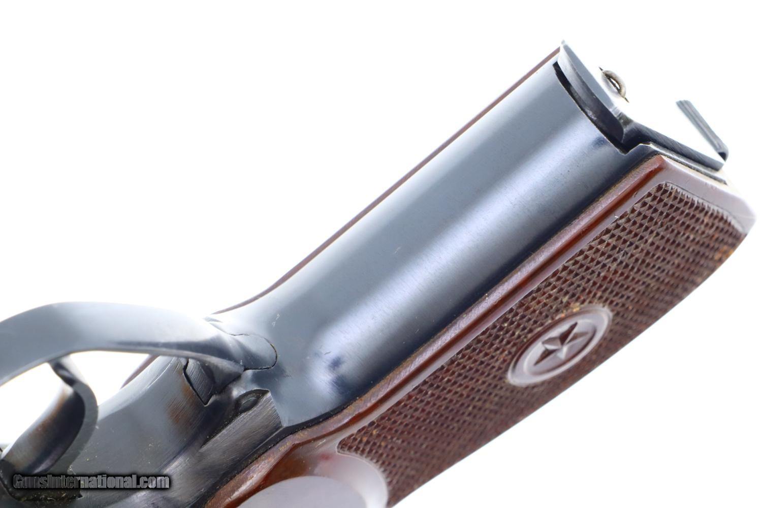 Description: Synopsis: Russian Makarov, Military, Izhevsk, 1976 Date, KE2145, FB00498 Description: Standard configuration Makarov with fixed front sight and drift adjustable rear sight. Izhevsk Arsenal marking on left side of frame along with manufacturing date of "1976”. Import marked on right side of frame. Standard configuration safety and late Bulgarian style magazine electropenciled “2145-1”. Single piece reddish maroon plastic grip with two checkered panels impressed with encircled 5 pointed star. Condition: 98% bright original salt blue with handling marks as imaged. Mirror bore. Perfect manual mechanics. SOLD Manufacturer: Izhevsk Model: Makarov Serial Number: 1490 Caliber Info: 9mm Condition: EXC |
