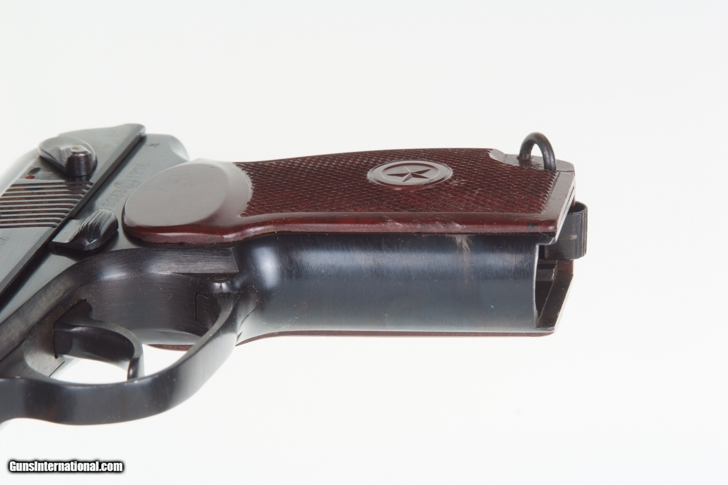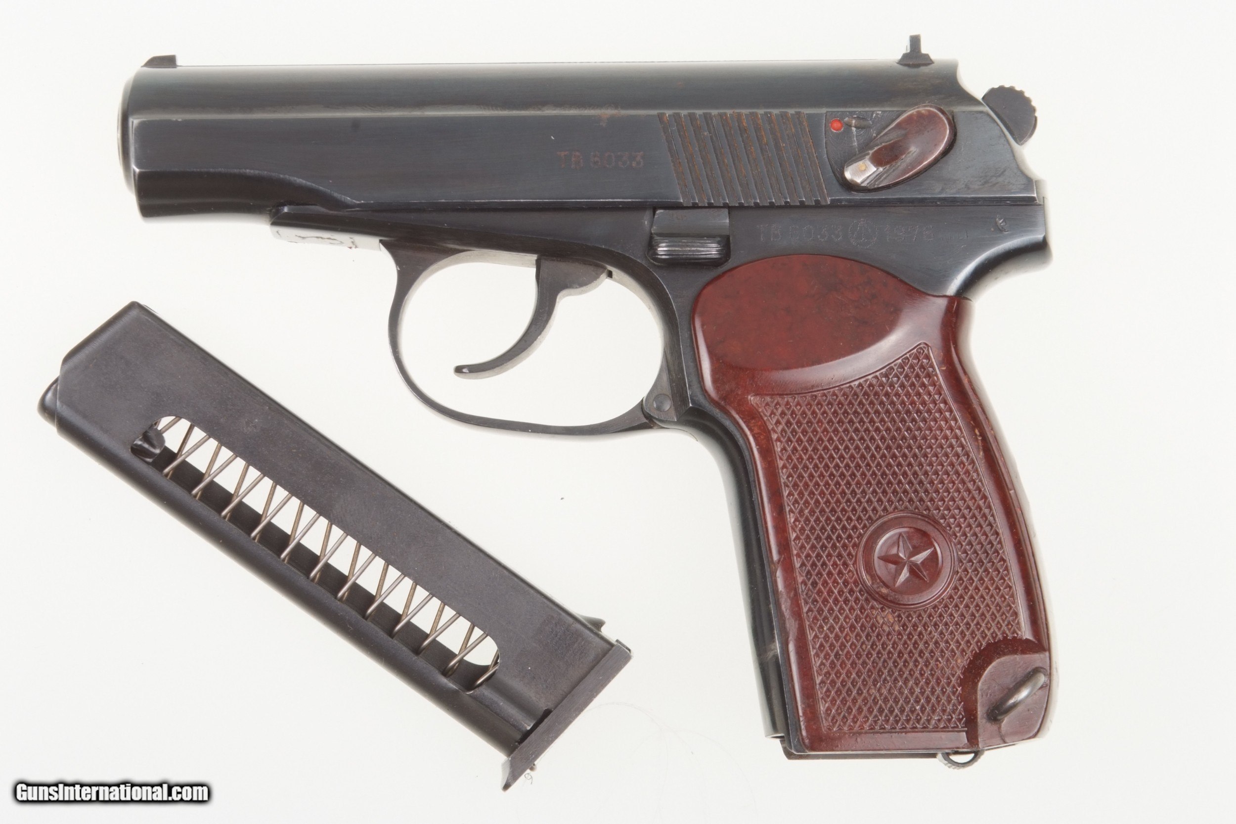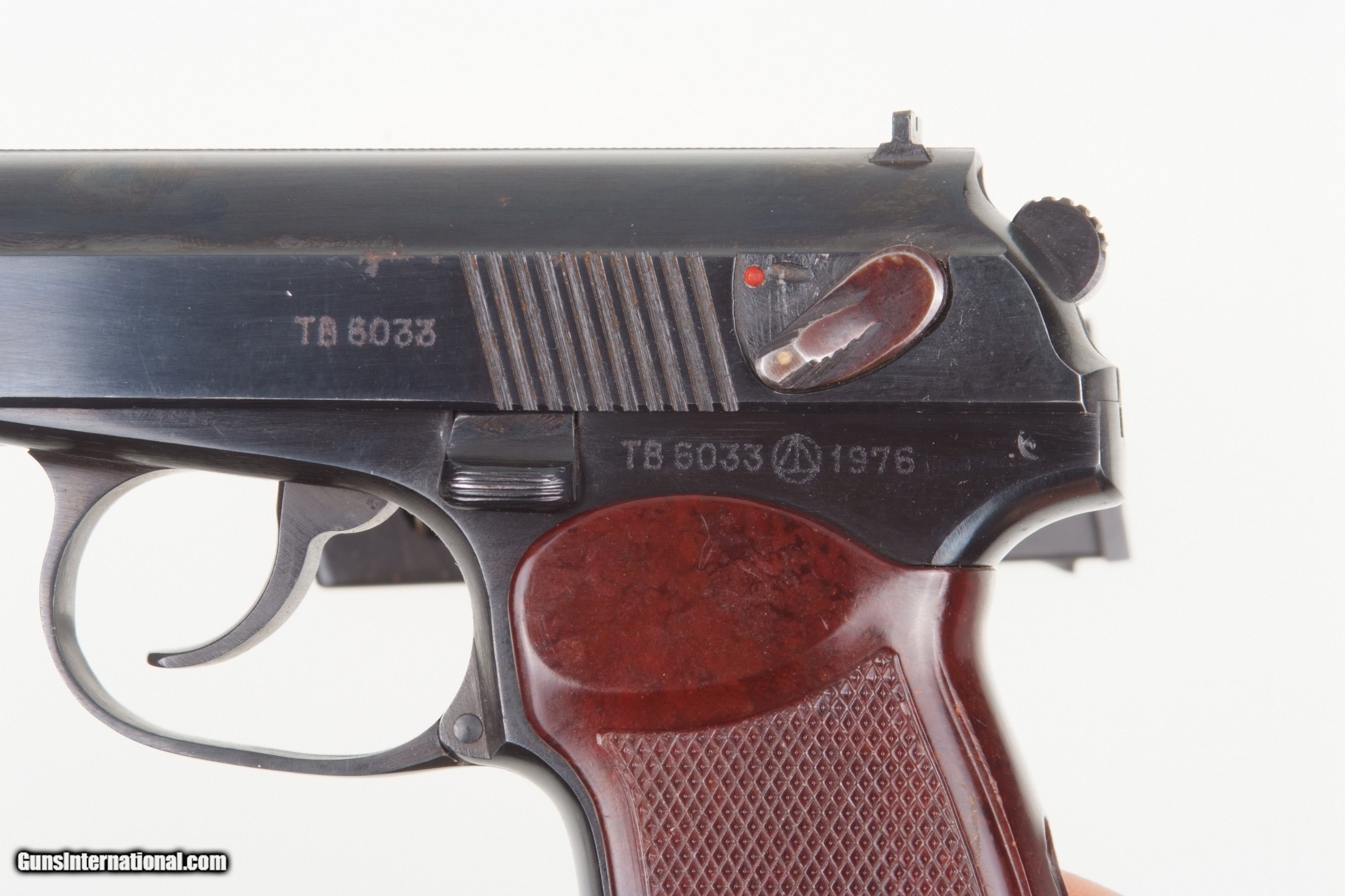 Description: Russian Military Makarov, dated 1976 with Russian magazine. SN: TB 6033. Cal. 9mm Mak. Standard configuration Makarov with fixed front and drift adjustable rear sight. Full serial number on left side of slide that is repeated on the left frame adjacent to the Izhvesk Arsenal symbol and the year 1976. Import marking on right frame. Usual reddish brown phenolic grips impressed with encircled 5 pointed star on each side. Lanyard ring. Russian Mag. Condition: Approximately 97-98% salt blue. Comparable or better condition grips. Near mirror bore. Perfect manual mechanics. A HISTORIC INVESTMENT! Buyer pays $40.00 shipping SOLD Manufacturer: Izhvesk Model: Makarov |