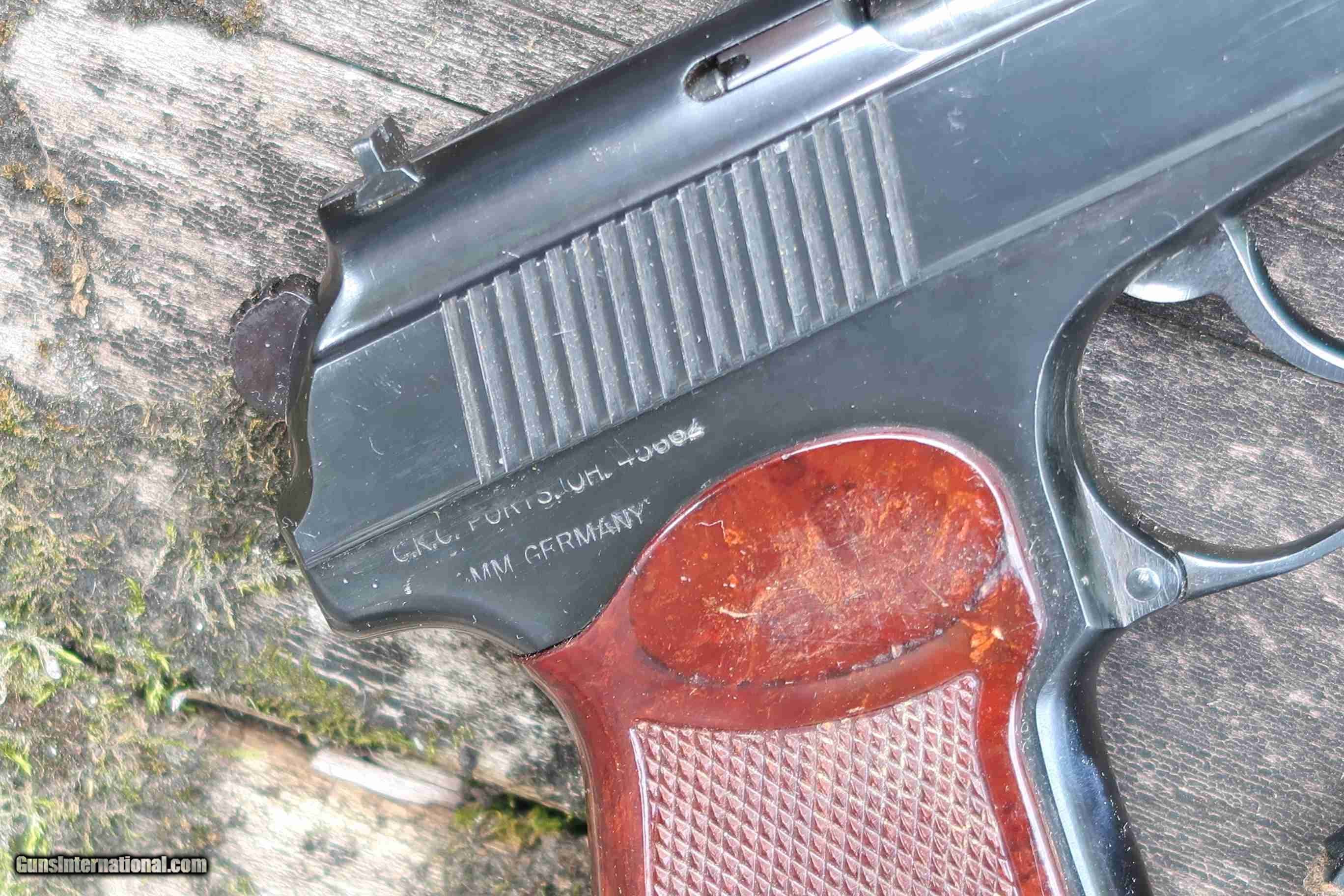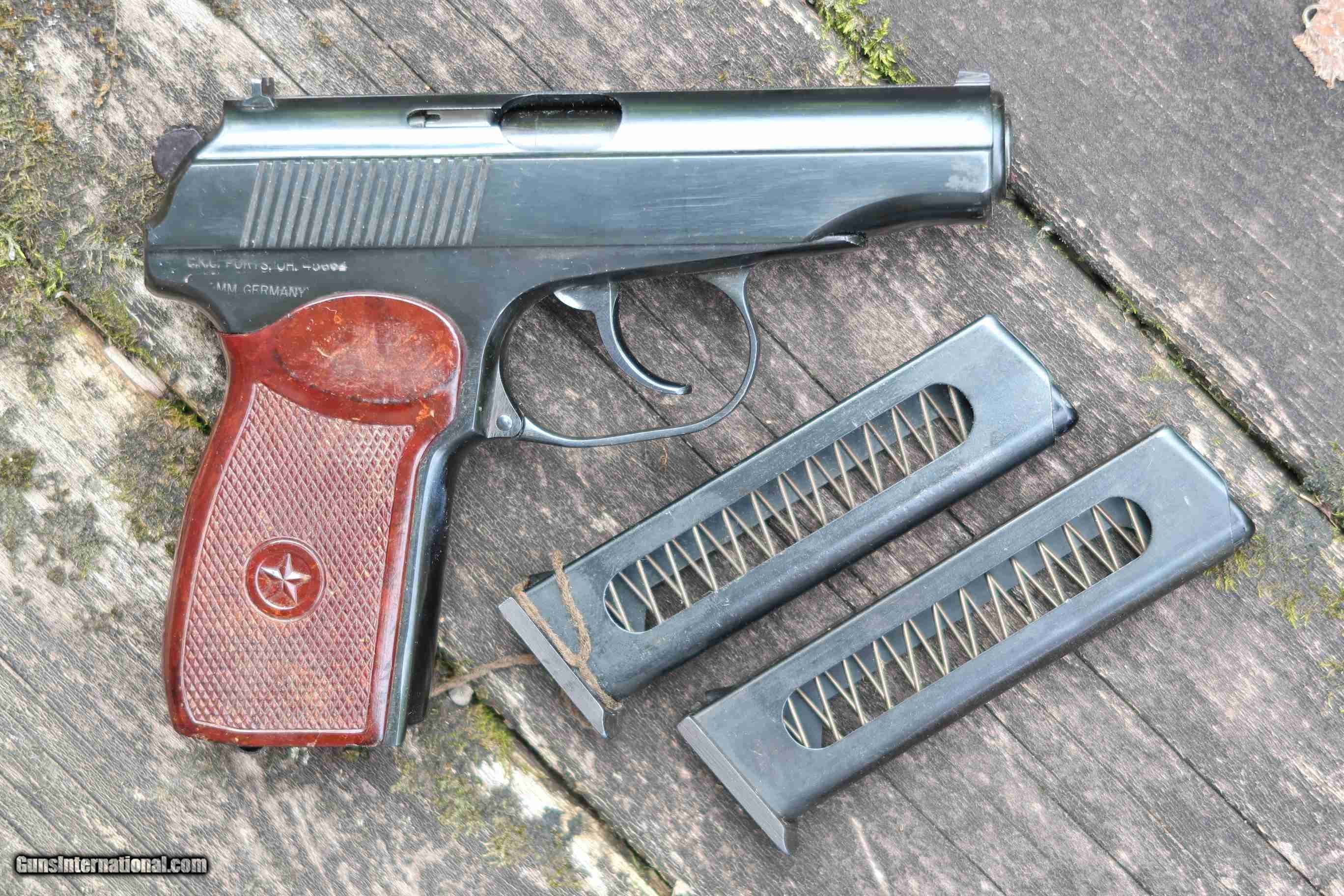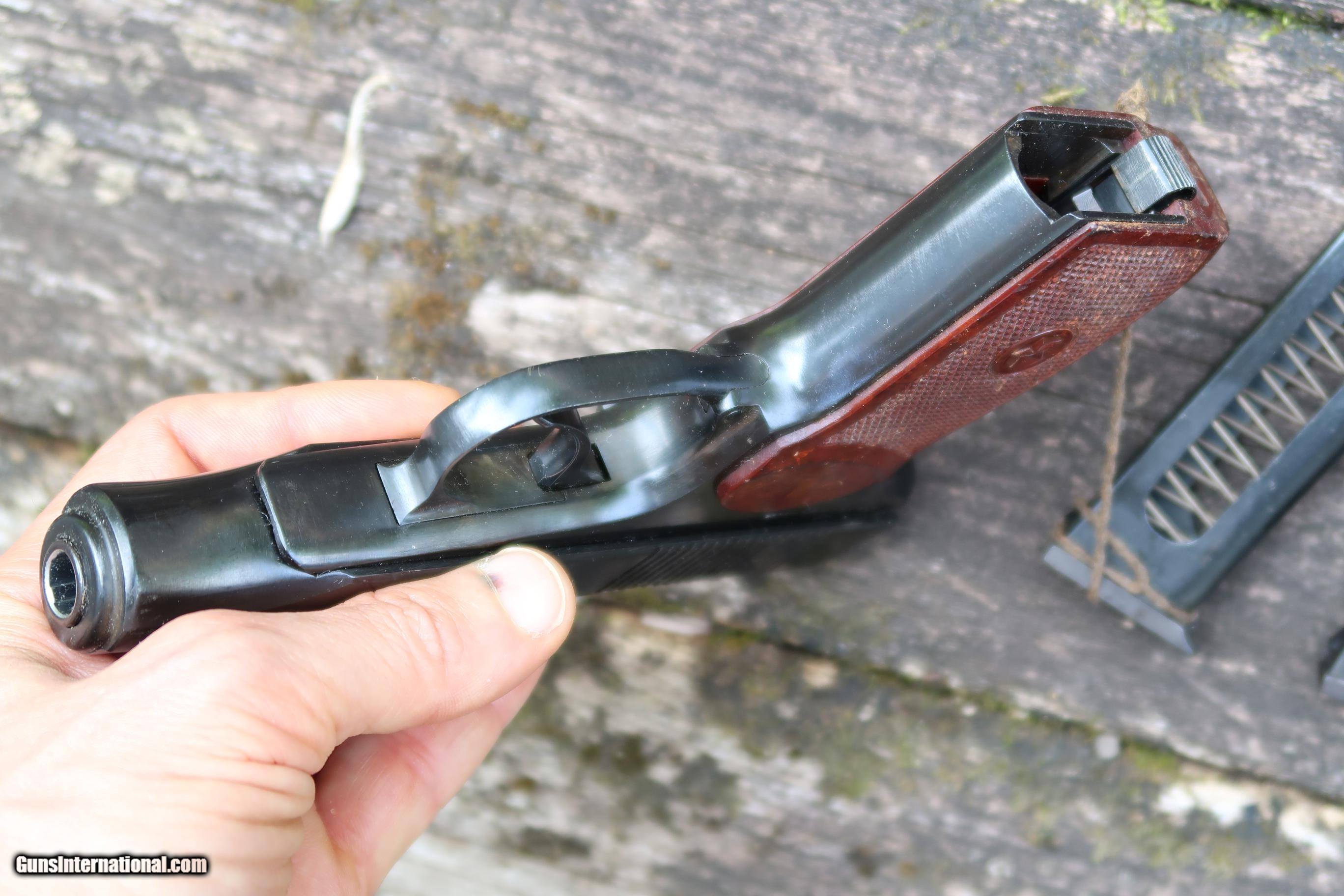 Description: Standard configuration Makarov with fixed front sight and drift adjustable rear sight. Full serial number on left side of slide, safety, and left side of frame, the frame number suffixed by the “P” Code that corresponds with 1960 production. Fitted with later, Bulgarian style, electropenciled-to-match magazines. Izhevsk Arsenal marking on left side of frame. Import markings as imaged. Single piece reddish maroon plastic grip with two checkered panels impressed with encircled 5 pointed star. Synopsis: Scarce Russian Makarov, “P” Code Date, with two factory-matching magazines. Condition: Bright 99+% original salt blue with comparable condition magazines. Mirror bore, perfect manual mechanics with both magazines. A super condition, early, Russian Makarov with two electropenciled-to-match magazines! ~~Insured shipping fee of $55; most packages shipped using FedEx 2nd Day.~~ SOLD Curio/Relic: Yes Manufacturer: Ishevsk Serial Number: KB1547 P Caliber Info: 9mmM |