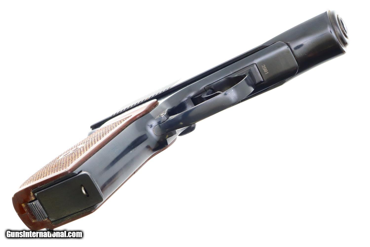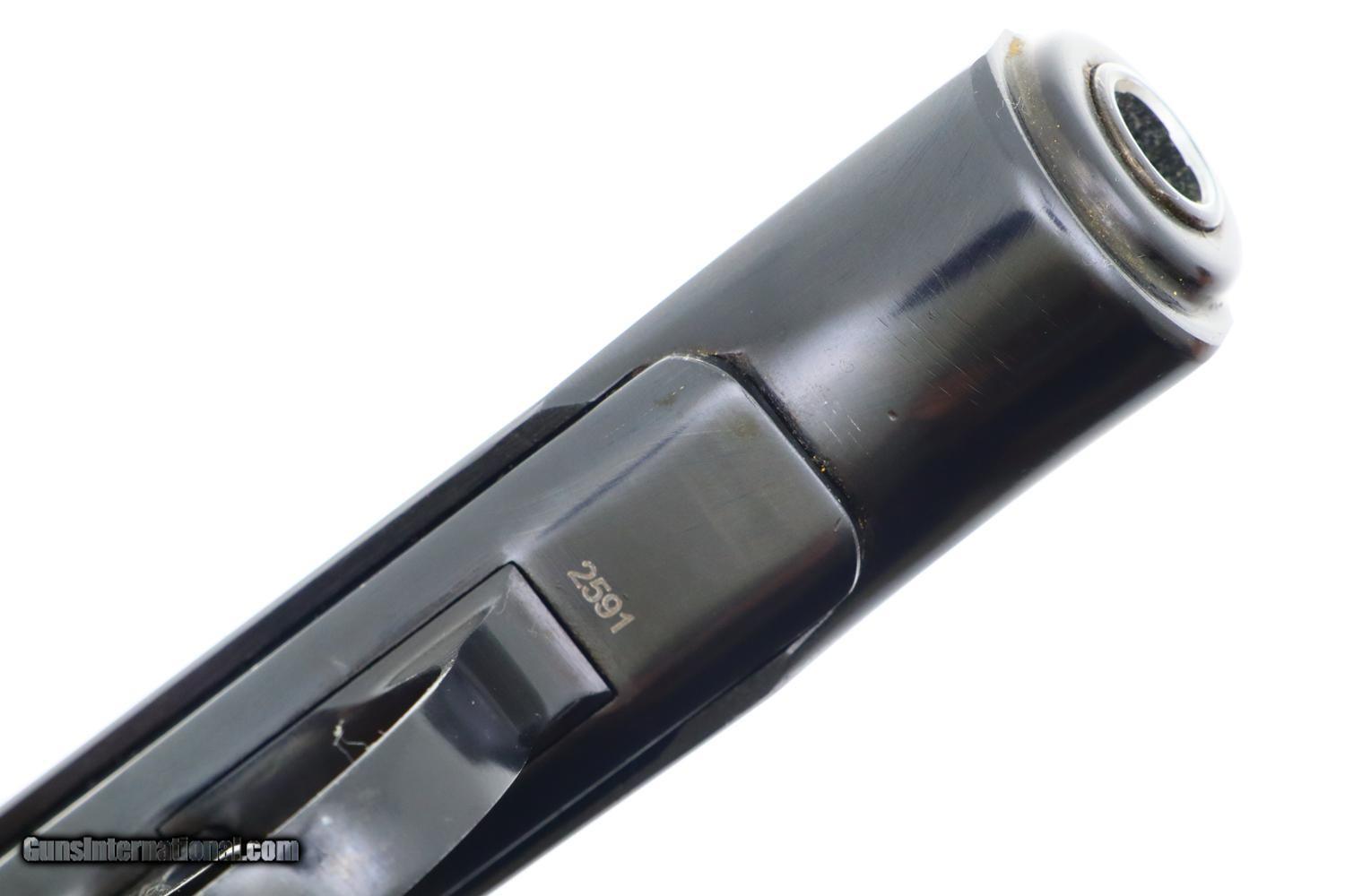 Description: Synopsis: Russian Military Makarov, 1961 date, Spare Magazine Description: Early Standard configuration Makarov made in 1961, cal 9mmM, with fixed front sight and drift adjustable rear sight. Full serial number on left side of slide, safety, left side of frame, and forward frame in front of trigger guard. Izhevsk Arsenal marking on left side of frame. Import markings as imaged. Factory reworked magazines, matching numbers – 1 and -2 scribed on left side of body, original numeration on spine crossed out. Single piece reddish maroon plastic grip with two checkered panels impressed with encircled 5 pointed star. Condition: Pistol is a bright original 98% salt blue with comparable condition grip. Reworked magazines as previously detailed. Mirror bore. Perfect manual mechanics with each magazine. A high condition, early production Makarov with a difficult to find date, now with two reworked to match magazines. Curio/Relic: Yes Manufacturer: Izhevsk Model: Makarov Serial Number: 231260 Caliber Info: 9mm Condition: 0.98 Price: $1,895.00 Contact Seller |