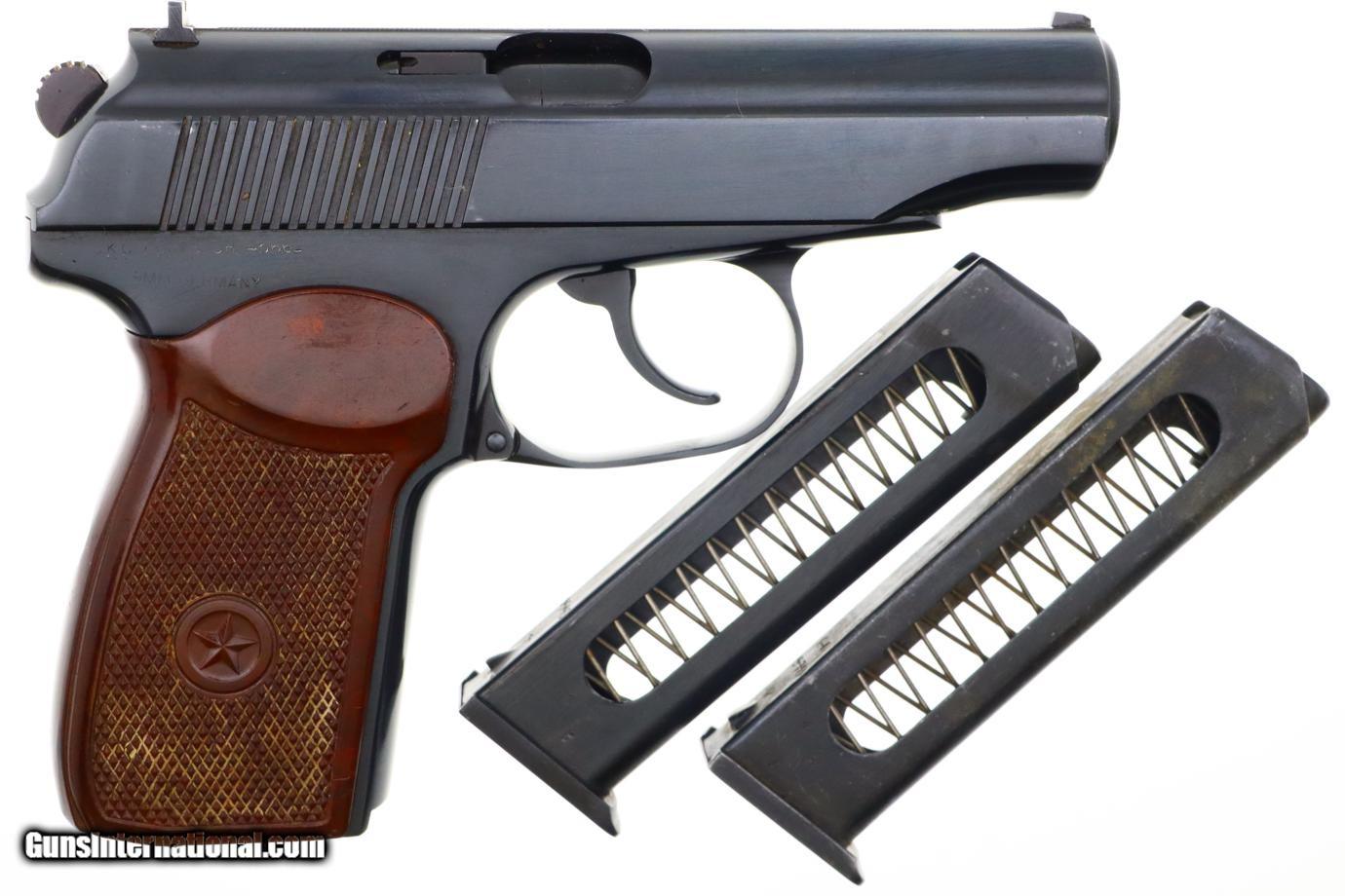 Early Standard configuration Makarov made in 1961, cal 9mmM, with fixed front sight and drift adjustable rear sight. Full serial number on left side of slide, safety, left side of frame, and forward frame in front of trigger guard. Izhevsk Arsenal marking on left side of frame. Import markings as imaged. Factory reworked magazines, matching numbers – 1 and -2 scribed on left side of body, original numeration on spine crossed out. Single piece reddish maroon plastic grip with two checkered panels impressed with encircled 5 pointed star.