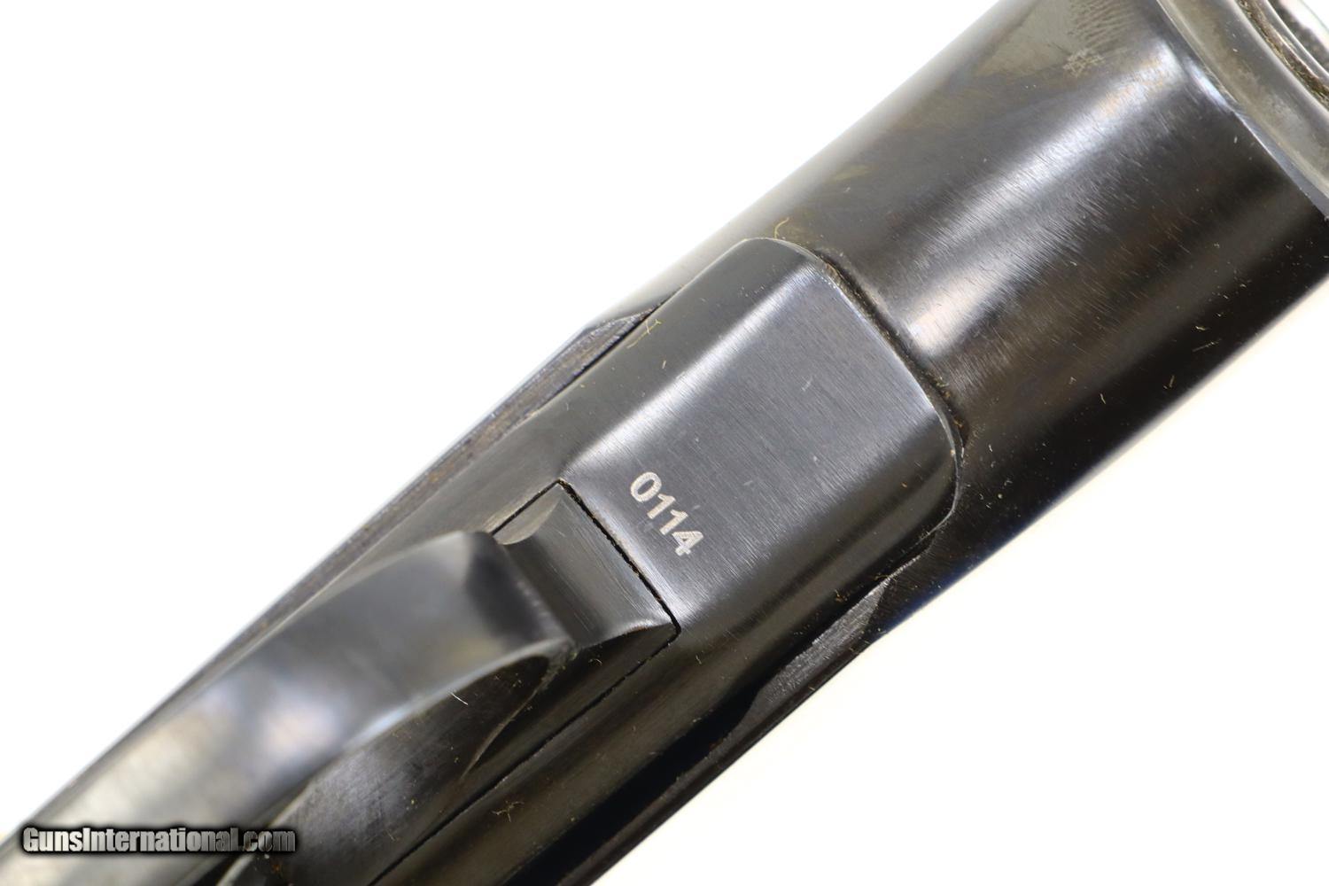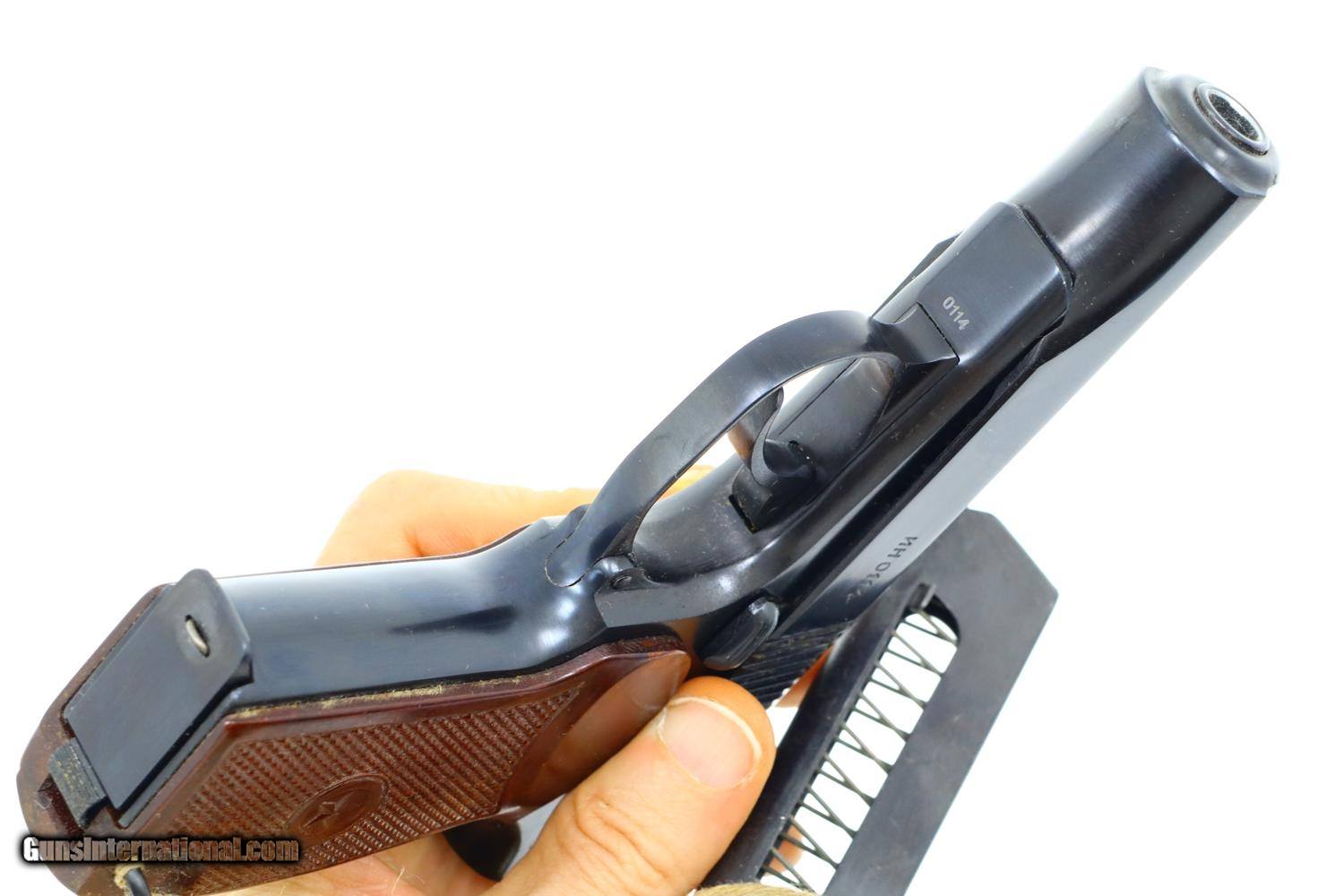 Description: Standard configuration Makarov with fixed front sight and drift adjustable rear sight made in 1966. Full serial number on left side of slide, safety, and left side of frame. Original factory-matching magazines sub numbered "1" and "2". Izhevsk Arsenal marking on left side of frame. Import markings as imaged. Single piece reddish maroon plastic grip with two checkered panels impressed with encircled 5 pointed star. Synopsis: Scarce Russian military Makarov rig, dated 1966, two factory-matching magazines. Condition: Fantastic 99% original salt blue with comparable condition magazines. Mirror bore, perfect manual mechanics. A super condition, early, Russian Makarov with two factory-matching magazines. ~~Insured shipping fee of $65; most packages shipped using FedEx 2nd Day.~~ SOLD Curio/Relic: Yes Manufacturer: Izhevsk Serial Number: 114 Caliber Info: 9mmM |