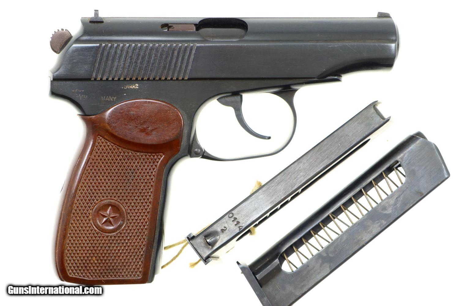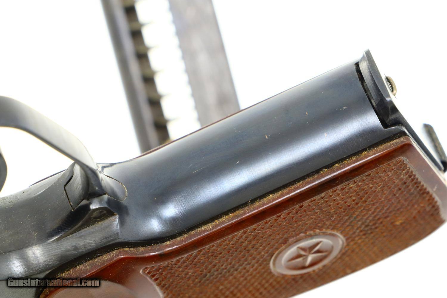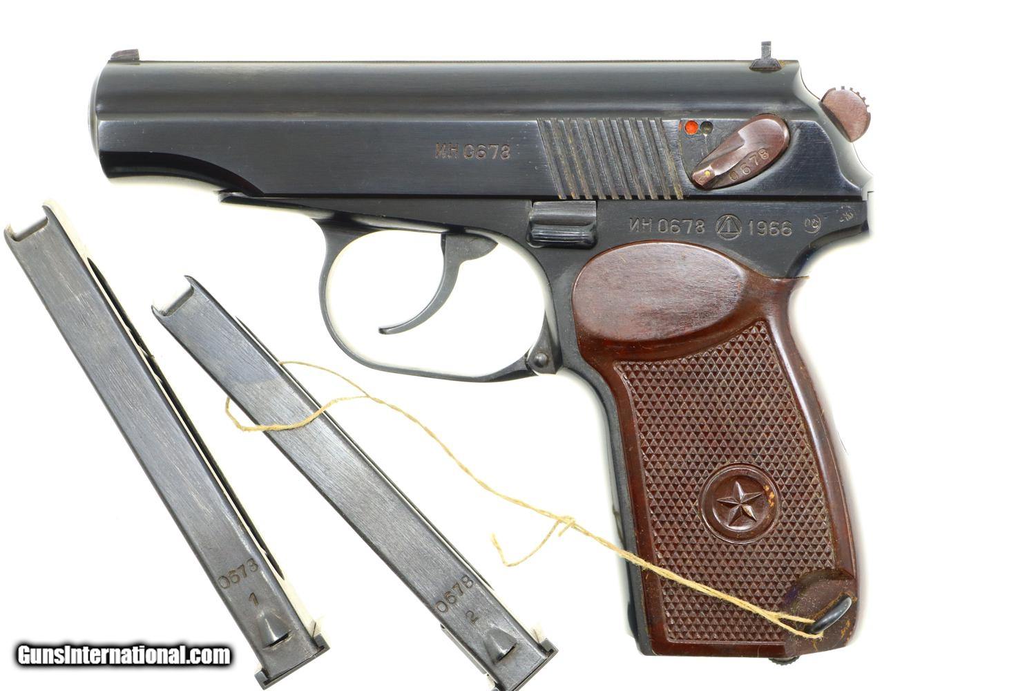 Description: Standard configuration Makarov with fixed front sight and drift adjustable rear sight made in 1966. Full serial number on left side of slide, safety, and left side of frame. Original factory-matching magazines sub numbered "1" and "2". Izhevsk Arsenal marking on left side of frame. Import markings as imaged. Single piece reddish maroon plastic grip with two checkered panels impressed with encircled 5 pointed star. Synopsis: Scarce Russian military Makarov rig, dated 1966, two factory-matching magazines. Condition: Fantastic 99% original salt blue with comparable condition magazines. Mirror bore, perfect manual mechanics. A super condition, early, Russian Makarov with two factory-matching magazines. ~~Insured shipping fee of $65; most packages shipped using FedEx 2nd Day.~~ SOLD Manufacturer: Izhevsk Serial Number: 114 Caliber Info: 9mmM |
