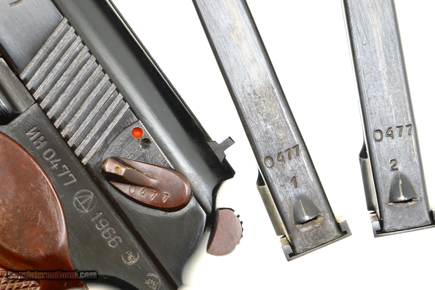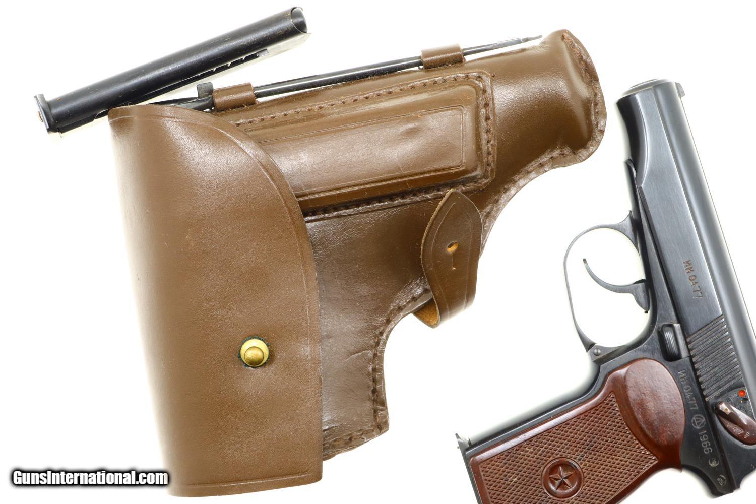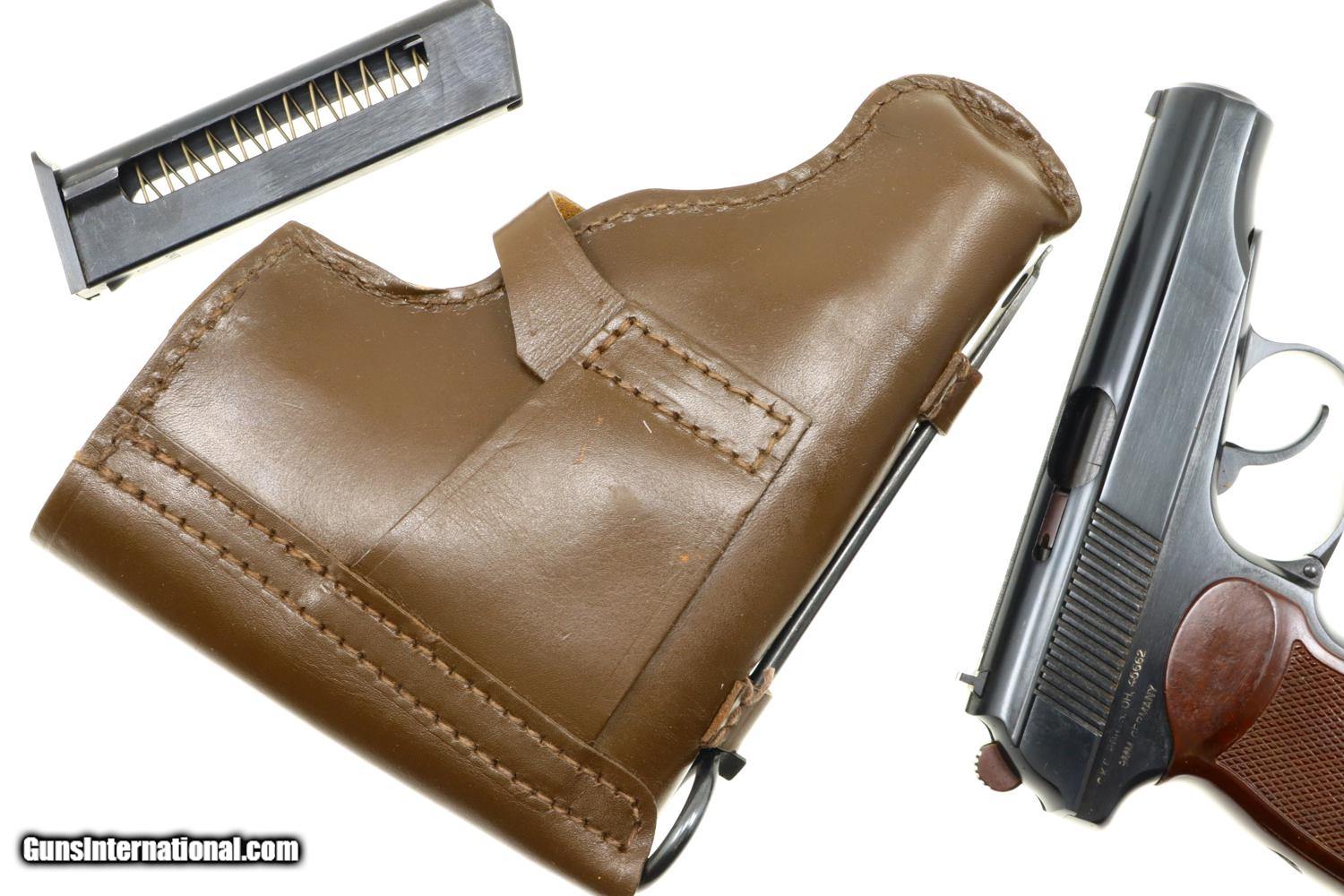 Standard configuration Makarov with fixed front sight and drift adjustable rear sight. Full serial number on left side of slide, safety, and left side of frame. Original factory-matching magazines sub numbered "1" and "2". Izhevsk Arsenal marking on left side of frame. Import markings as imaged. Single piece reddish maroon plastic grip with two checkered panels impressed with encircled 5 pointed star. Correct Russian holster with cleaning rod, date not discernable.