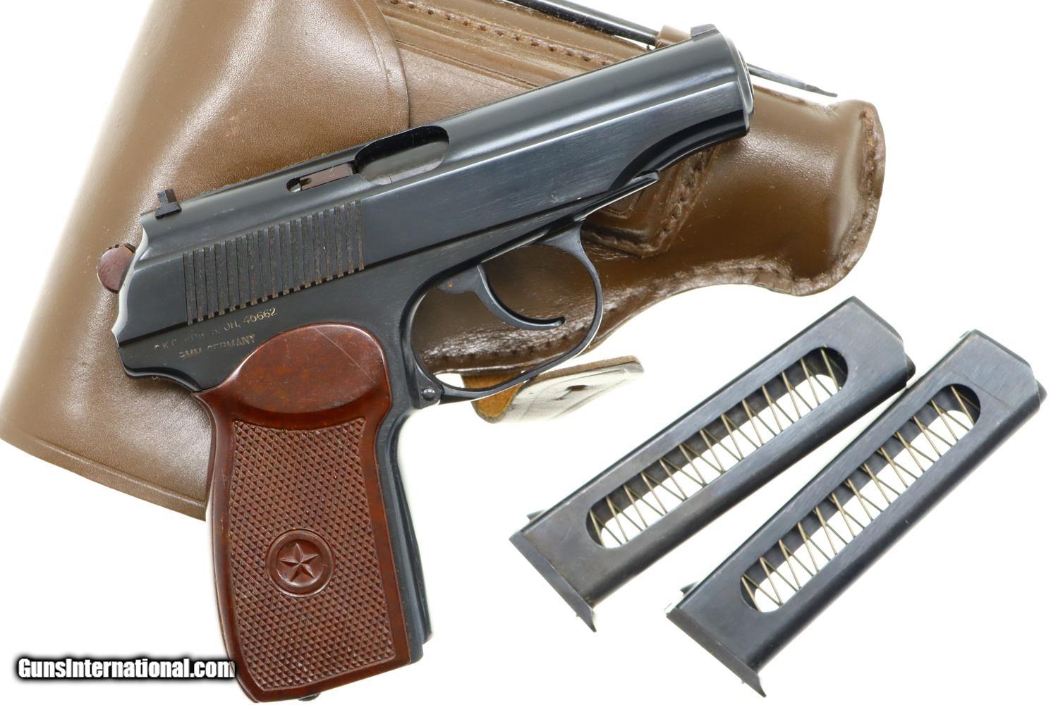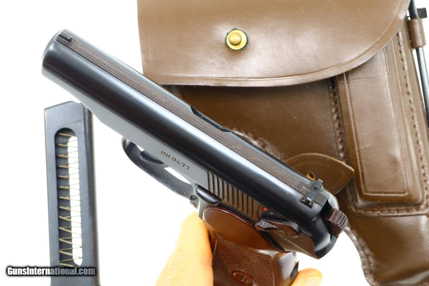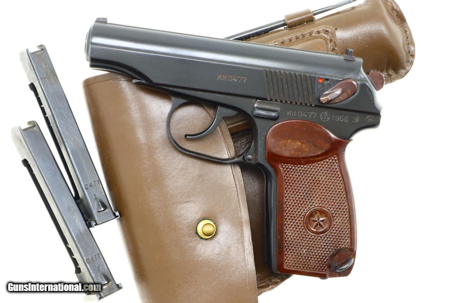 Standard configuration Makarov with fixed front sight and drift adjustable rear sight. Full serial number on left side of slide, safety, and left side of frame. Original factory-matching magazines sub numbered "1" and "2". Izhevsk Arsenal marking on left side of frame. Import markings as imaged. Single piece reddish maroon plastic grip with two checkered panels impressed with encircled 5 pointed star. Correct Russian holster with cleaning rod, date not discernable.
