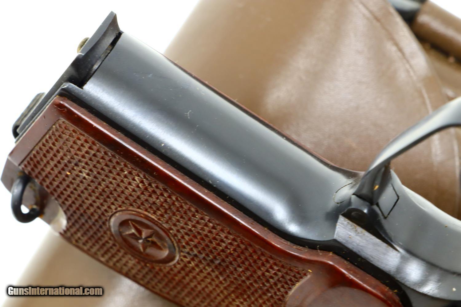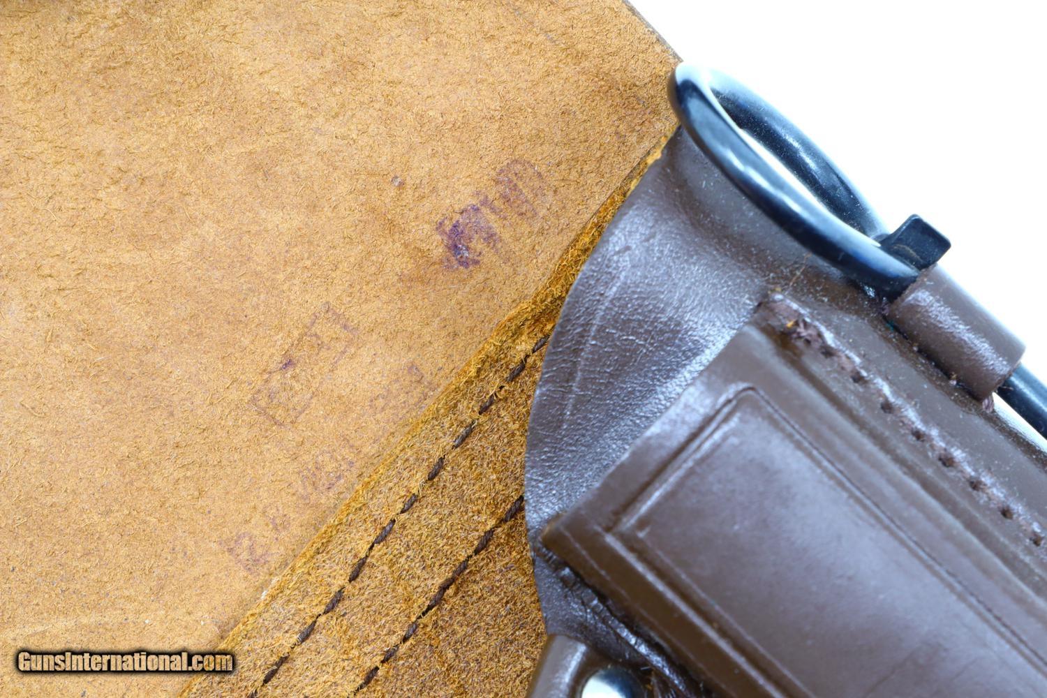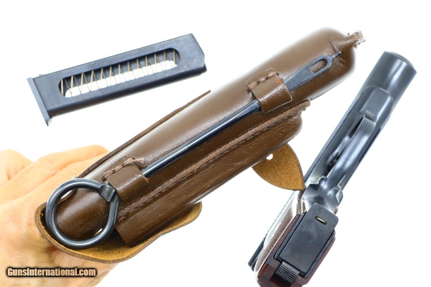 Fantastic 99+% original salt blue with comparable condition magazines. Mirror bore, perfect manual mechanics. Excellent holster with a few scuffs. A super condition, early, Russian Makarov with two factory-matching magazines, correct leather holster with cleaning rod.
