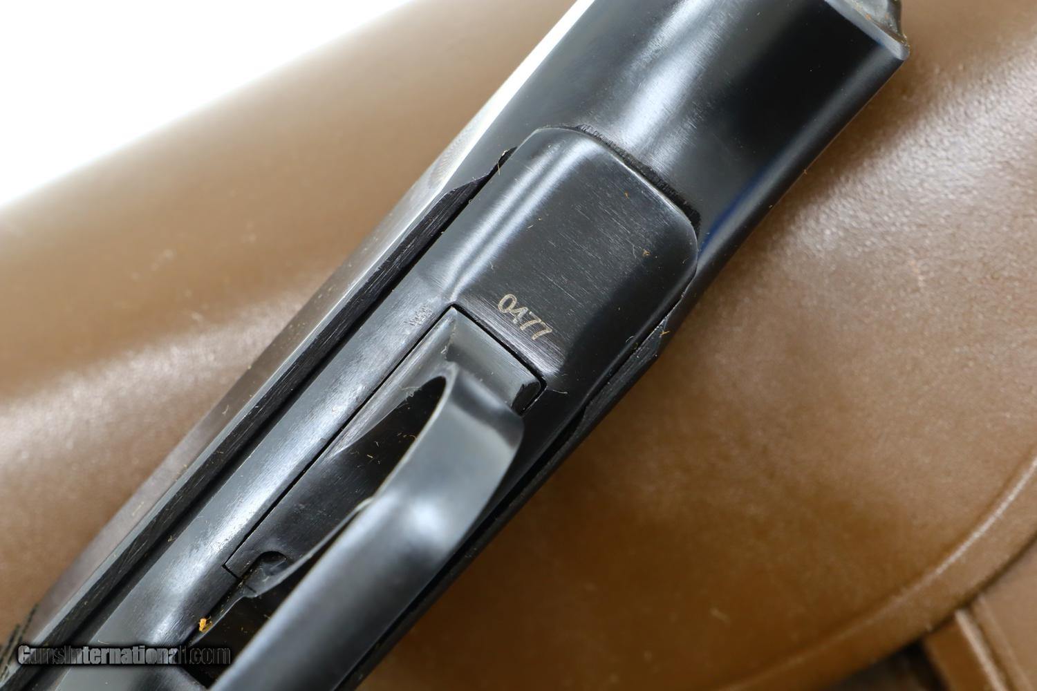 Description: Description: Standard configuration Makarov with fixed front sight and drift adjustable rear sight. Full serial number on left side of slide, safety, and left side of frame. Original factory-matching magazines sub numbered "1" and "2". Izhevsk Arsenal marking on left side of frame. Import markings as imaged. Single piece reddish maroon plastic grip with two checkered panels impressed with encircled 5 pointed star. Correct Russian holster with cleaning rod, date not discernable. Synopsis: Scarce Russian military Makarov rig, dated 1966, two factory-matching magazines, holster, cleaning rod. Condition: Fantastic 99+% original salt blue with comparable condition magazines. Mirror bore, perfect manual mechanics. Excellent holster with a few scuffs. A super condition, early, Russian Makarov with two factory-matching magazines, correct leather holster with cleaning rod. SOLD Manufacturer: Izhevsk Model: Makarov Serial Number: 0477 Caliber Info: 9mmM Condition: 99.00% |