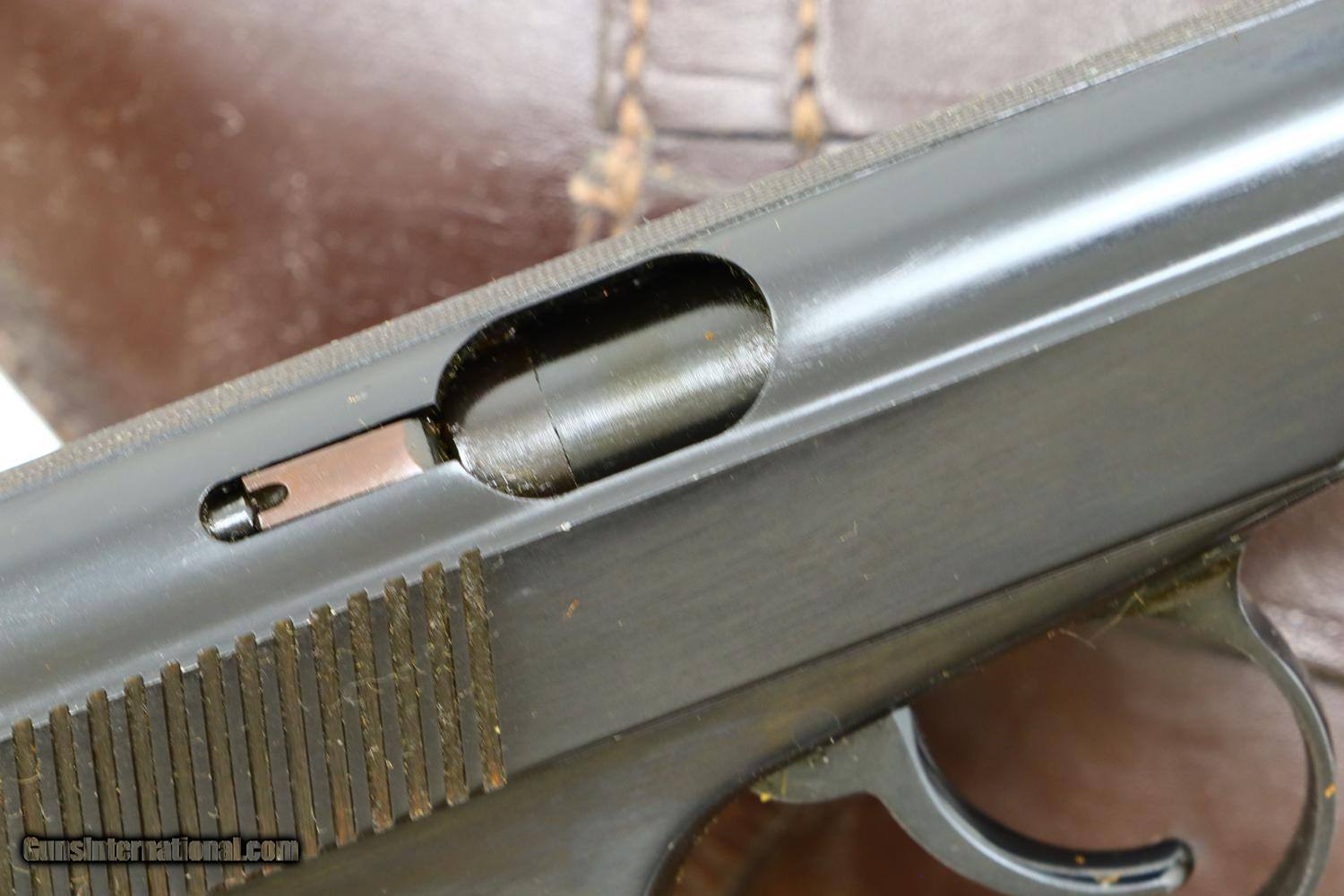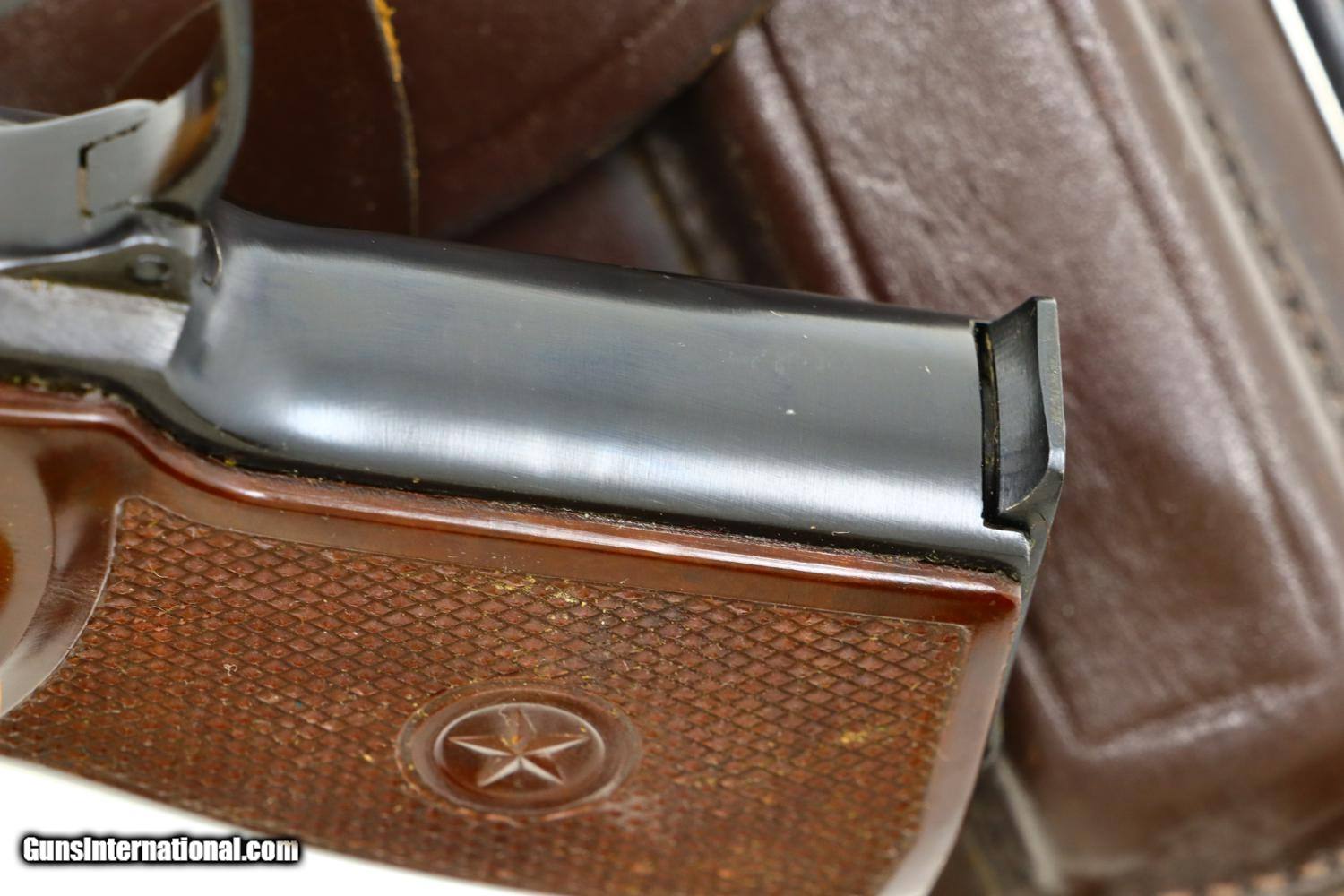 Description: Standard configuration Makarov with fixed front sight and drift adjustable rear sight made in 1963. Full serial number on left side of slide, safety, and left side of frame. Original factory-matching magazines sub numbered "1" and "2". Izhevsk Arsenal marking on left side of frame. Import markings as imaged. Single piece reddish maroon plastic grip with two checkered panels impressed with encircled 5 pointed star. Correct Russian holster with cleaning rod, dated 1965. Synopsis: Scarce Russian military Makarov rig, dated 1963, two factory-matching magazines, holster, cleaning rod. Condition: Fantastic 99% original salt blue with comparable condition magazines. Mirror bore, perfect manual mechanics. Excellent holster with a few scuffs. A super condition, early, Russian Makarov from 1963 with two factory-matching magazines, correct leather holster dated 1965, with cleaning rod. ~~Insured shipping fee of $65; most packages shipped using FedEx 2nd Day.~~ SOLD Manufacturer: Izhevsk Serial Number: 2918 Caliber Info: 9mmM |