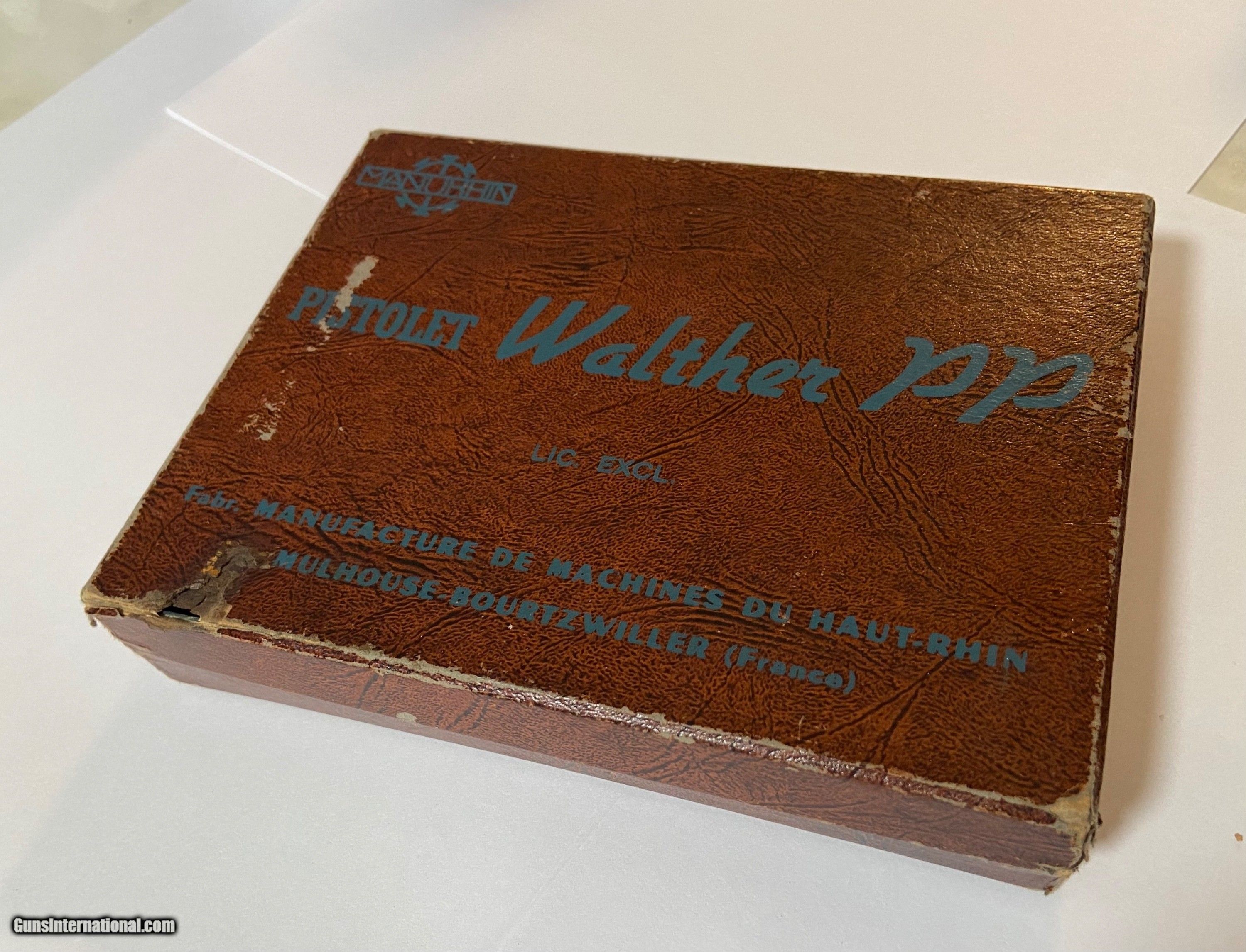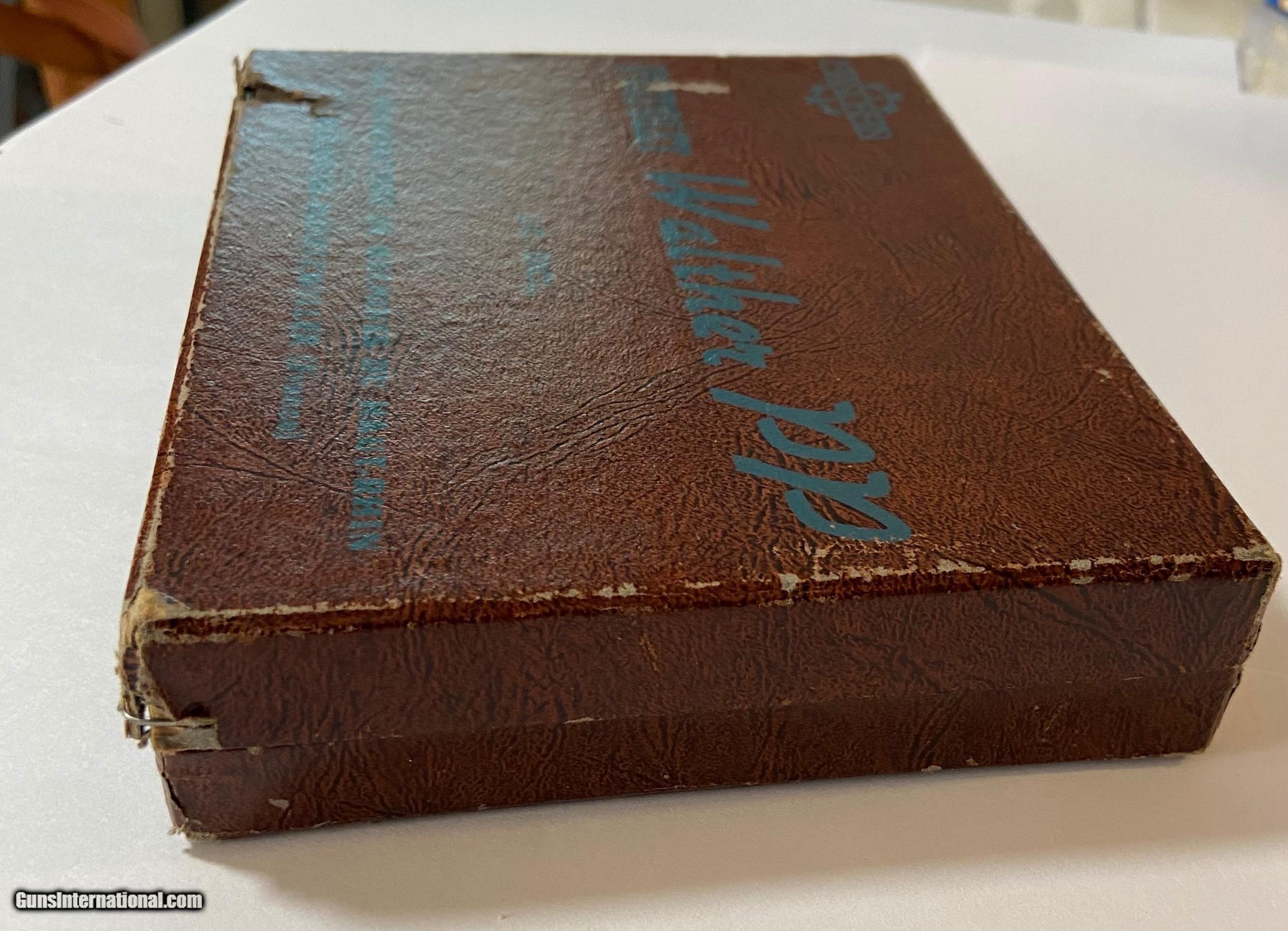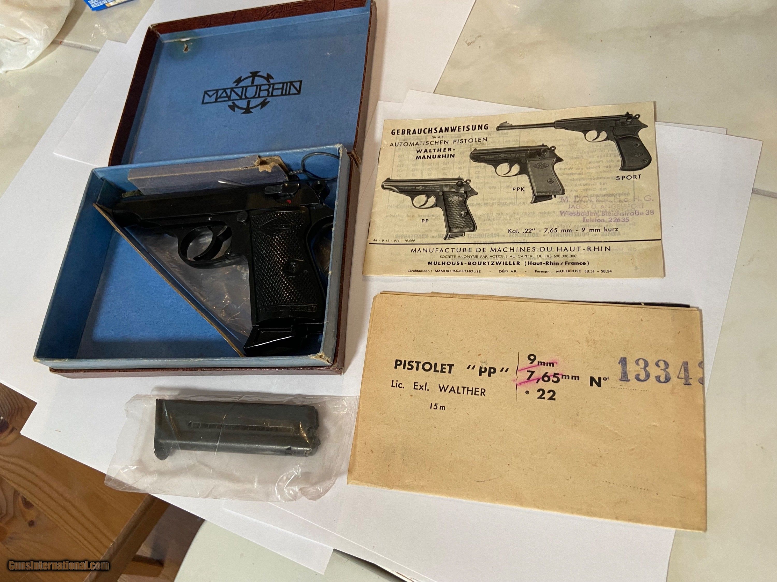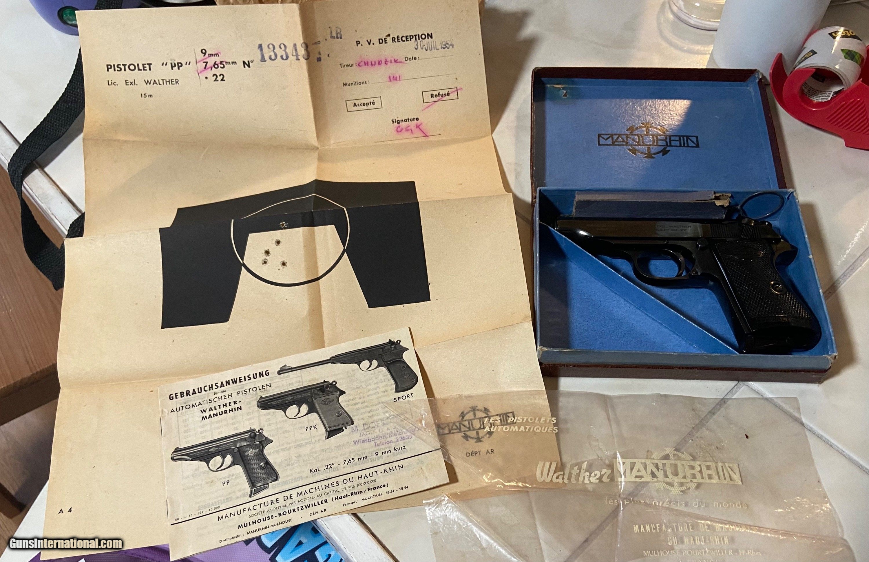 Description: A 1954 first year post war French Manurhin Walther pp 22lr, complete in original box, with target (dated), paperwork, and the original printed plastic gun shaped Manurhin bag... gun may be unfired, looks new, he two original mags, and whatever else it was shipped with new.... Curio/Relic: Yes Handgun Caliber: .22 Long Rifle Manufacturer: Manurhin Model: Walther pp Serial Number: 13343 Condition: Excellent Metal Condition: Excellent Finish: Blued Manufacture Date: 1954 Price: $2,200.00 Shipping: $50.00 Contact Seller |
