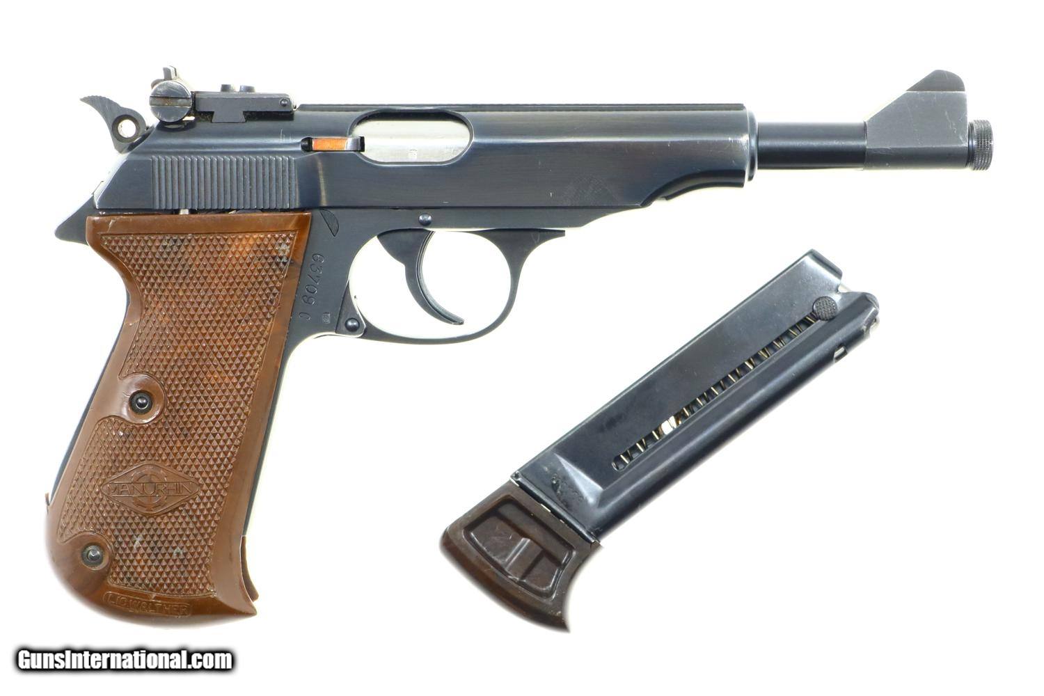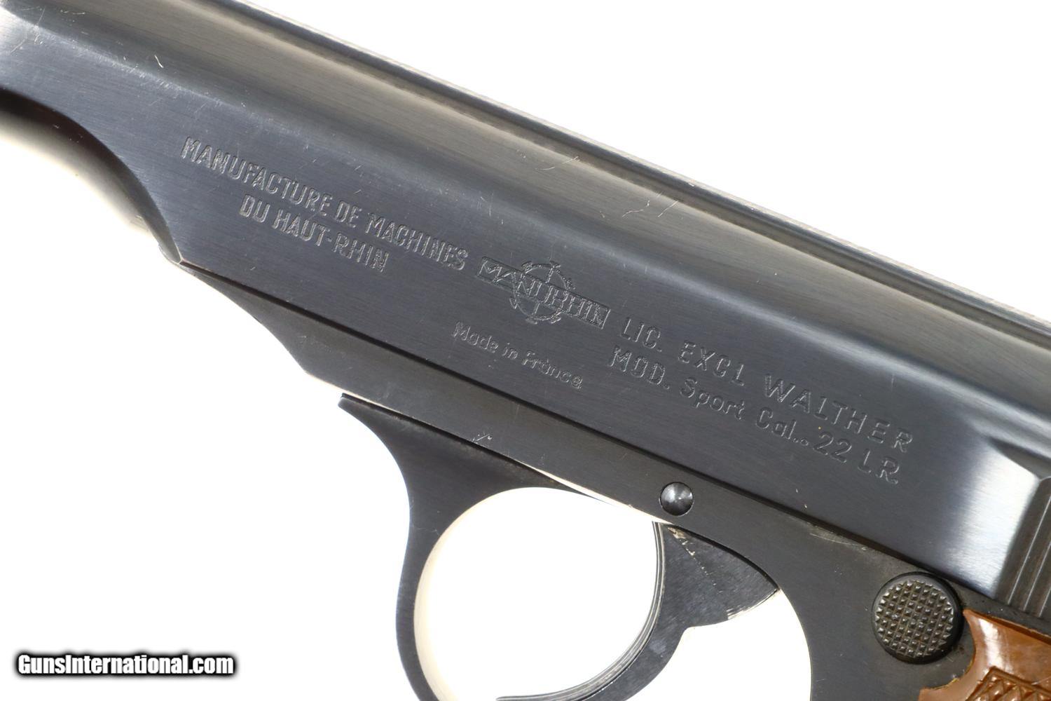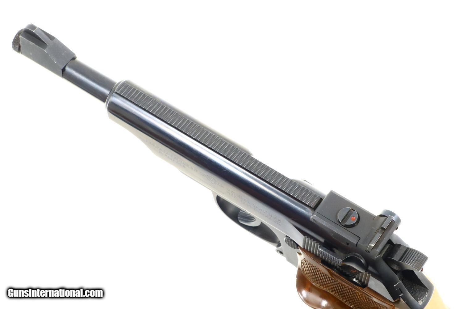 Description: Standard configuration Manurhin Sport pistol, made under Walther license, with a 6 inch barrel. Removable front sight and fully adjustable rear sight. Single action only. Left side of slide with usual Manurhin legend referencing mode, caliber, and location in France. Full serial number is on the right side of the frame. Usual french proofs on exposed barrel hood/frame boss and right side of frame. Brown modeled plastic grips, the left panel with thumb rest, both impressed with the Manurhin logo and reference to Walther. Correct Manurhin magazine, base darker than the grip, the right side with a slotted view port and marked "France". Synopsis: Manurhin Walther Sport, SA only, with a 6 inch barrel and birds head grip. Condition: Approximately 98% bright original salt blue with minimal sharp edge wear. Most of the red dotted paint missing. Comparable condition grips with light scattered handling marks as photographed and slight warpage as is common with these guns. Mirror bright bore. Perfect manual mechanics. A very attractive sport/informal target pistol from the 1960s/1970s. ~~Insured shipping fee of $45; most packages shipped using FedEx 2nd Day.~~ SOLD Manufacturer: Walther Serial Number: 63709C Caliber Info: .22LR |