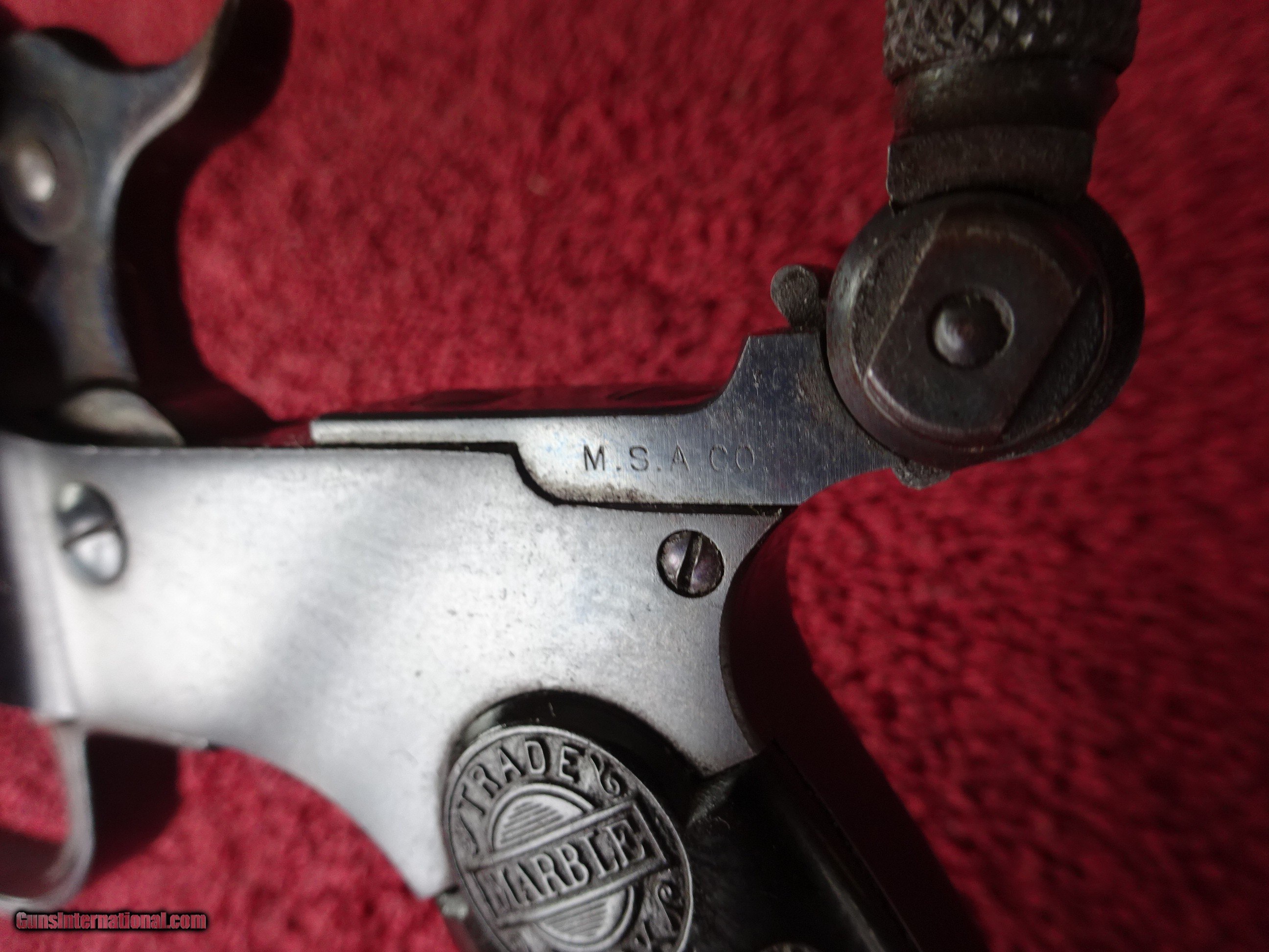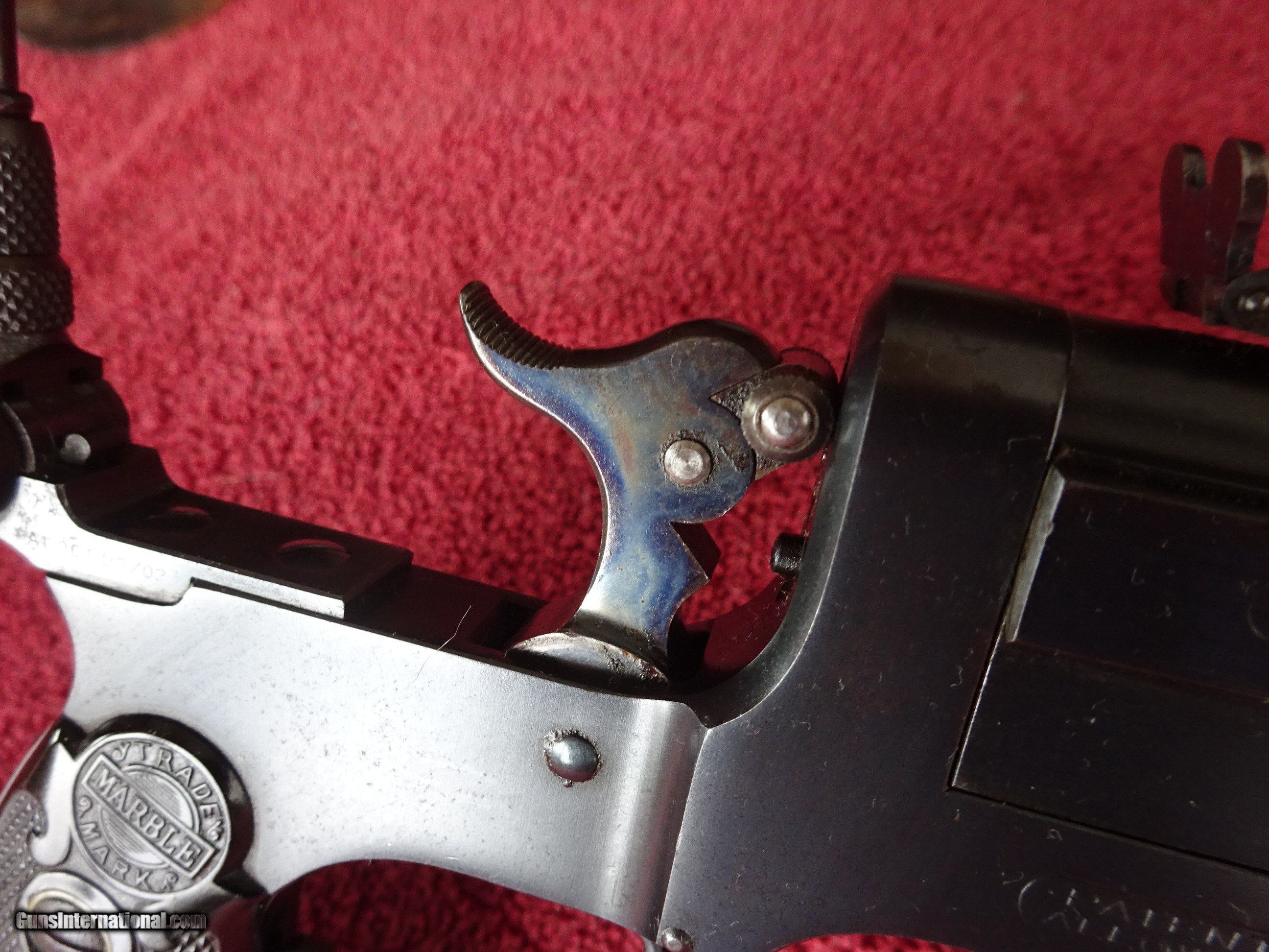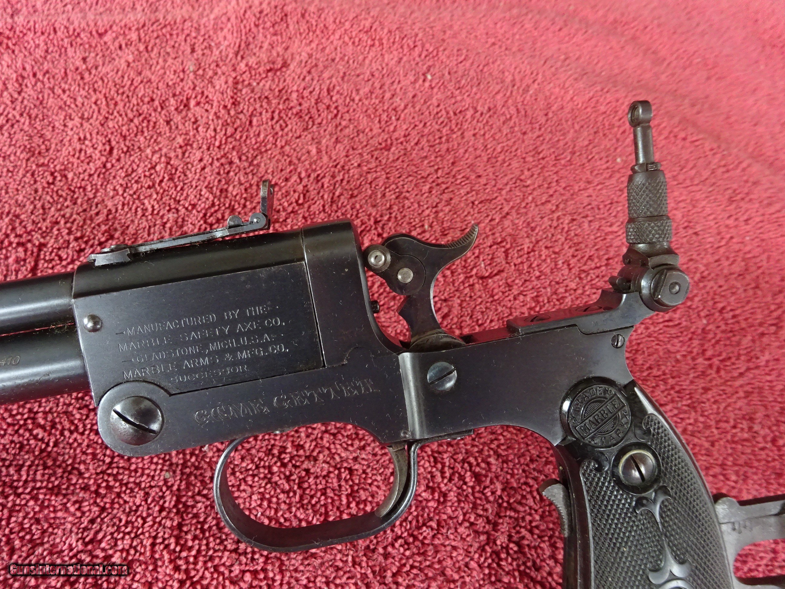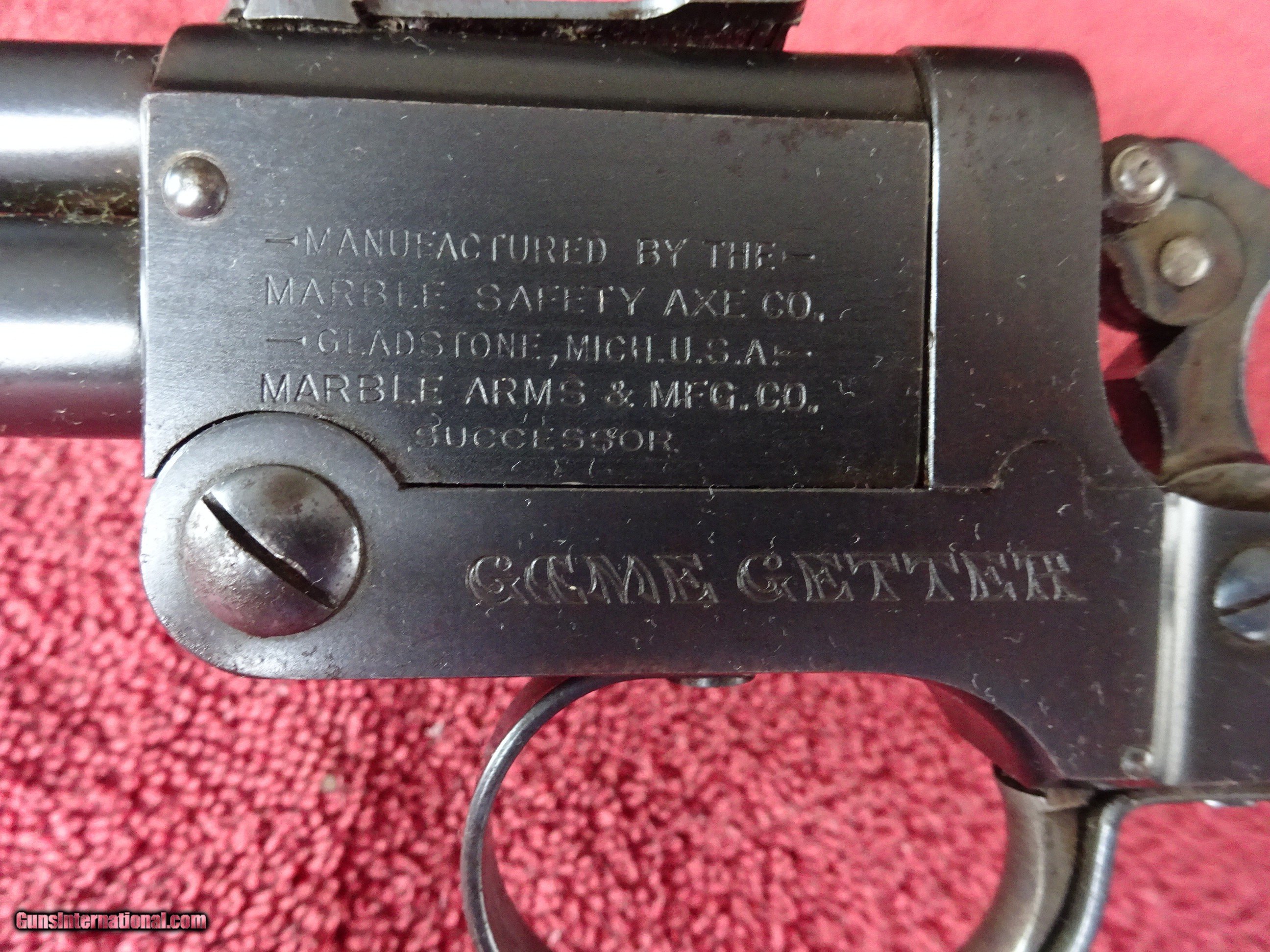 Description: MARBLES GAME GETTER MODEL 1908, 18" BARRELS MARKED "CALIBERS 22 & 410", LEFT SIDE MARKED "MANUFACTURED BY THE MARBLES SAFETY AXE CO. GLADSTONE MICH USA MARBLES ARM & MFG. CO. SUCCESSER". EXCELLENT OVERALL BRIGHT BLUE, NO EDGE OR MUZZLE WEAR, MIRROR-PERFECT BORES. FIXED FRONT SIGHT, ADJUSTABLE REAR SIGHT, TANG PEEP SIGHT, 100% BOLD VIVID CASE COLOR ON THE HAMMER. PERFECT BLACK BAKELITE EMBOSSED AND CHECKERED GRIPS. FOLDING METAL SHOULDER STOCK. FUNCTIONS PERFECTLY, EXCEPTIONAL EXAMPLE, 100% ORIGINAL CONDITION. INCLUDES ORIGINAL MARBLE MARKED 18" LEATHER HOLSTER. $3500.00 + $70.00 Insured shipping to an FFL address. Layaway is available. See all Pats gun listings on this site! We also have hundreds of ORIGINAL gun company advertising & memorabilia pieces available for sale on our site SPORTINGCOLLECTIBLES. We have no reprints or reproductions. Email for more information. If you need to call, morning or evening is best, and please note the Seller's Inventory number. SOLD Curio/Relic: Yes |
