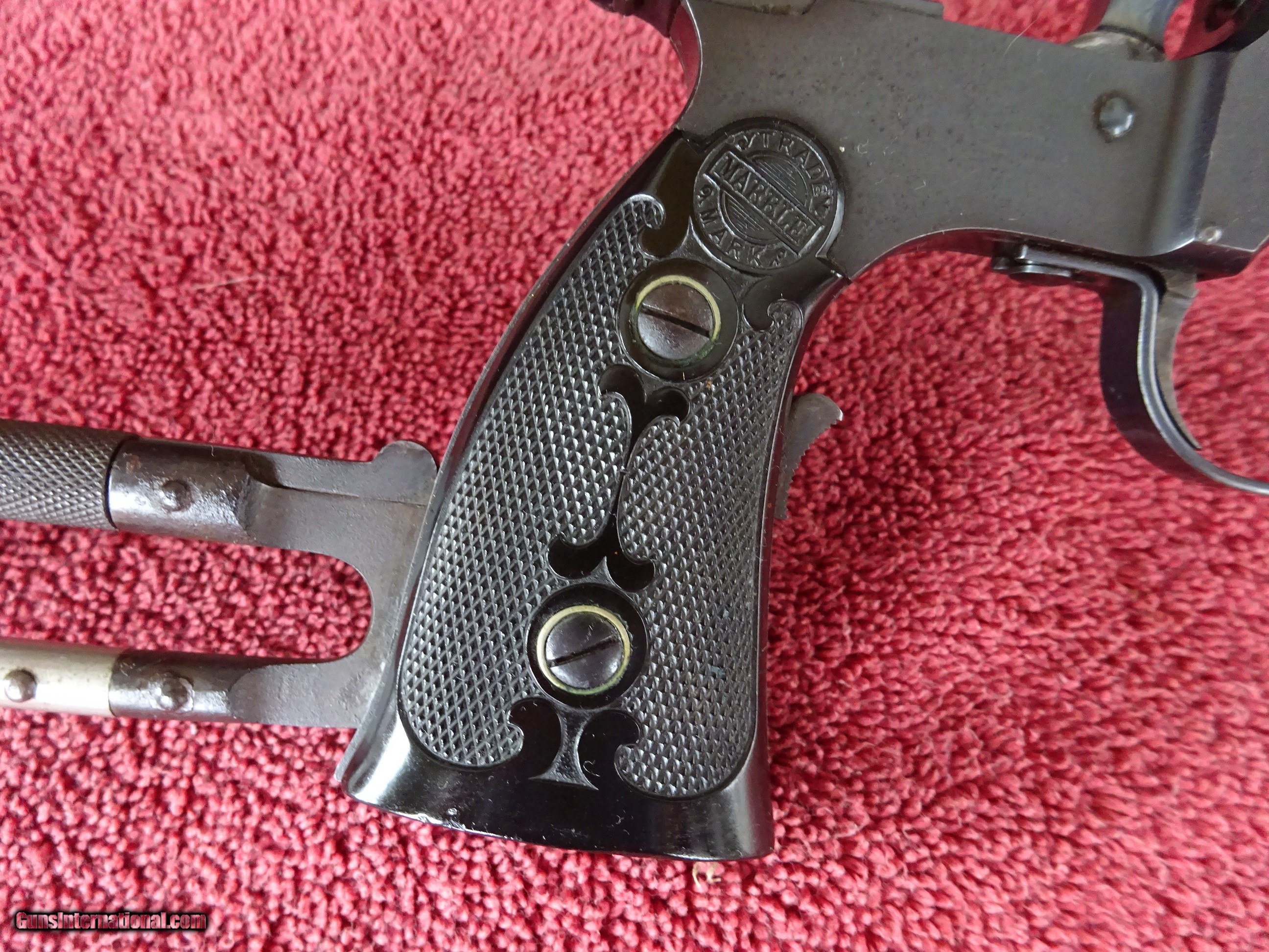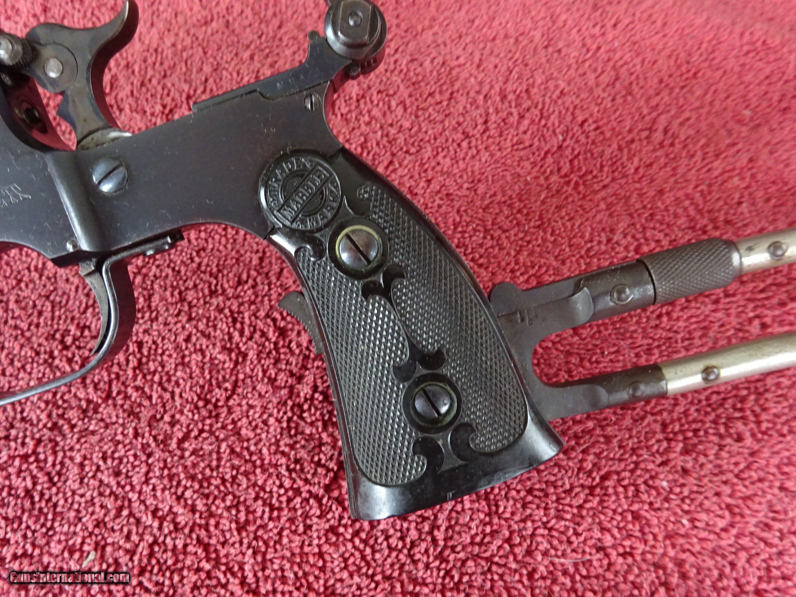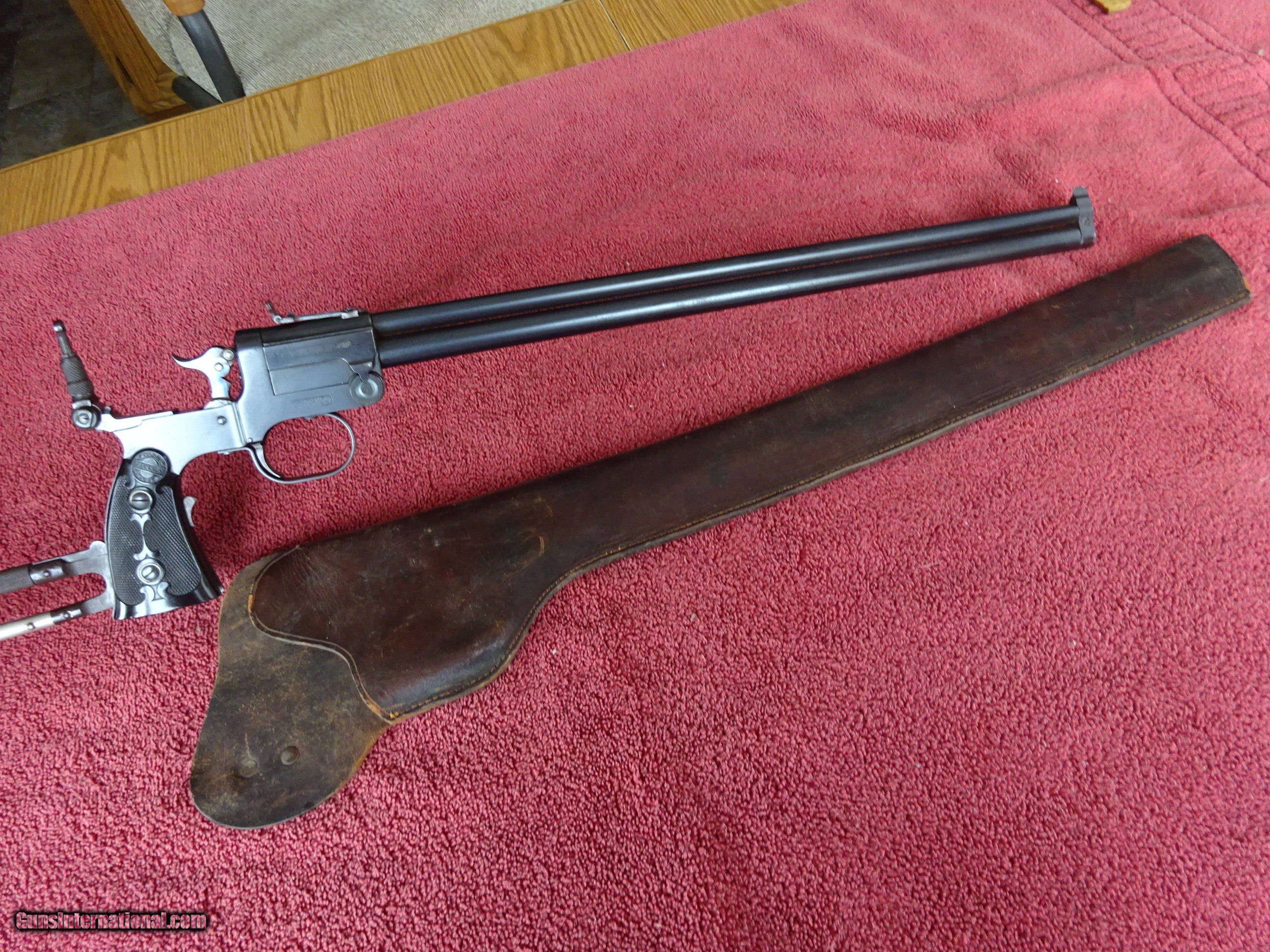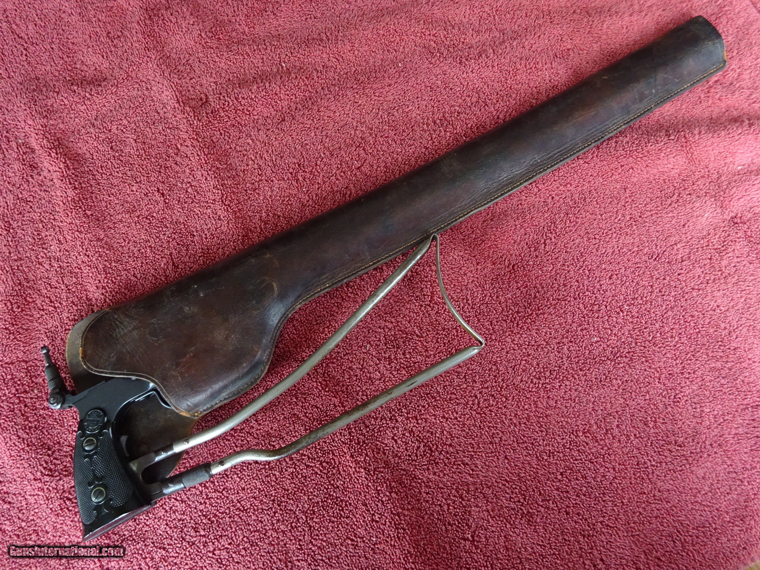 Description: MARBLES GAME GETTER MODEL 1908, 18" BARRELS MARKED "CALIBERS 22 & 410", LEFT SIDE MARKED "MANUFACTURED BY THE MARBLES SAFETY AXE CO. GLADSTONE MICH USA MARBLES ARM & MFG. CO. SUCCESSER". EXCELLENT OVERALL BRIGHT BLUE, NO EDGE OR MUZZLE WEAR, MIRROR-PERFECT BORES. FIXED FRONT SIGHT, ADJUSTABLE REAR SIGHT, TANG PEEP SIGHT, 100% BOLD VIVID CASE COLOR ON THE HAMMER. PERFECT BLACK BAKELITE EMBOSSED AND CHECKERED GRIPS. FOLDING METAL SHOULDER STOCK. FUNCTIONS PERFECTLY, EXCEPTIONAL EXAMPLE, 100% ORIGINAL CONDITION. INCLUDES ORIGINAL MARBLE MARKED 18" LEATHER HOLSTER. $3500.00 + $70.00 Insured shipping to an FFL address. Layaway is available. See all Pats gun listings on this site! We also have hundreds of ORIGINAL gun company advertising & memorabilia pieces available for sale on our site SPORTINGCOLLECTIBLES. We have no reprints or reproductions. Email for more information. If you need to call, morning or evening is best, and please note the Seller's Inventory number. SOLD Curio/Relic: Yes |