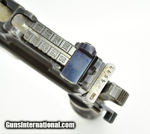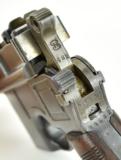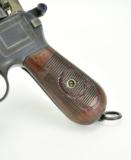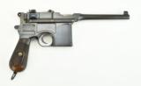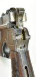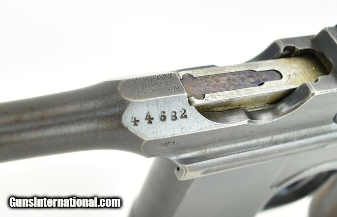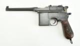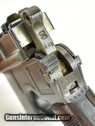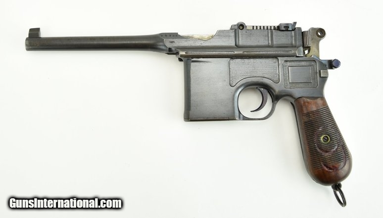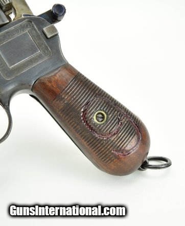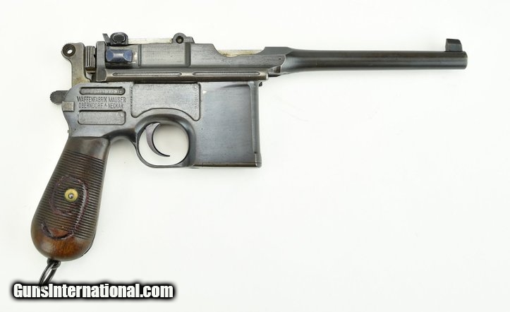 Mauser 1896 9mm Mauser caliber pistol. Red nine Mauser. Right side vertical flat has German army acceptance stamp. Bore is very good, action works perfectly. Gun has correct “Rednine” grips. Matching numbers except bold stop (under rear sight) which is unnumbered. Very good plus with 95% blue.
