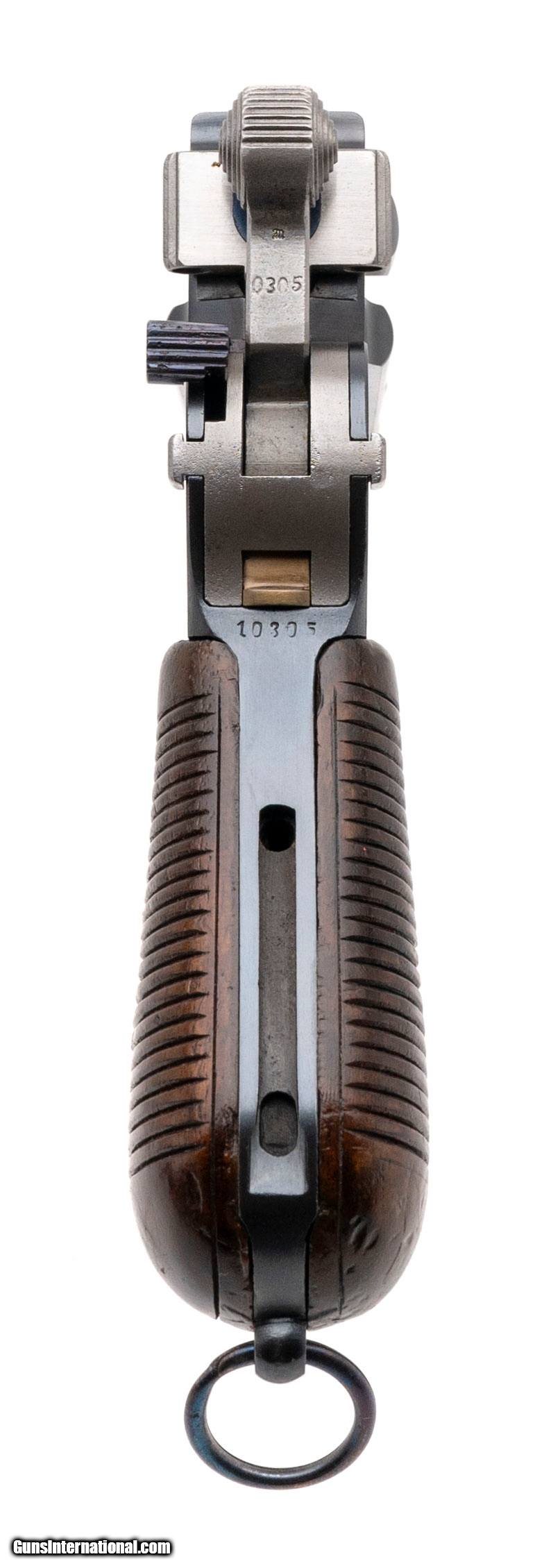 Description: "Serial number 10305. Made in 1897. 7.63 Mauser caliber with a 4.75" barrel. This gun is in excellent condition as professionally restored. The grips have a coat of varnish. This gun is a short barrel variation of the conehammmer which has a fixed rear sight instead of the adjustable sights. Very scarce gun! SOLD Antique: Yes |