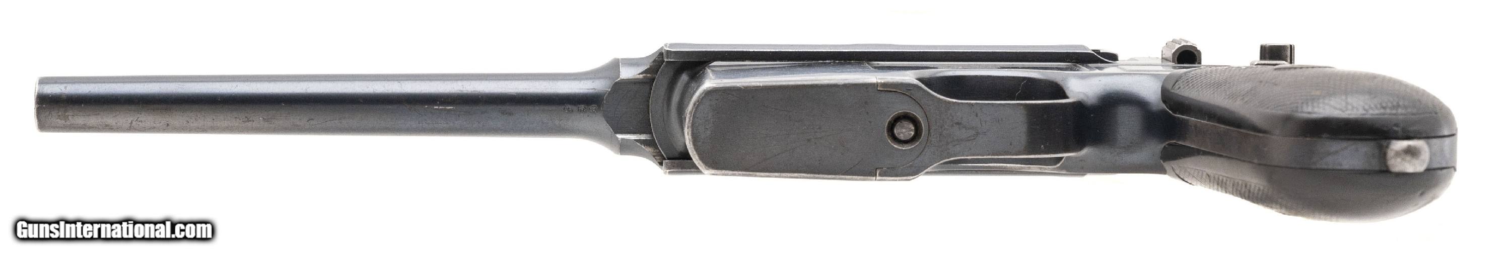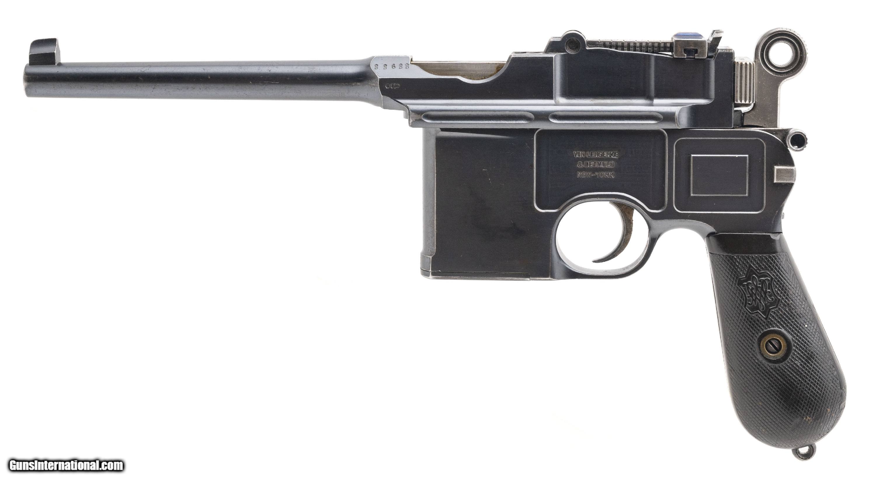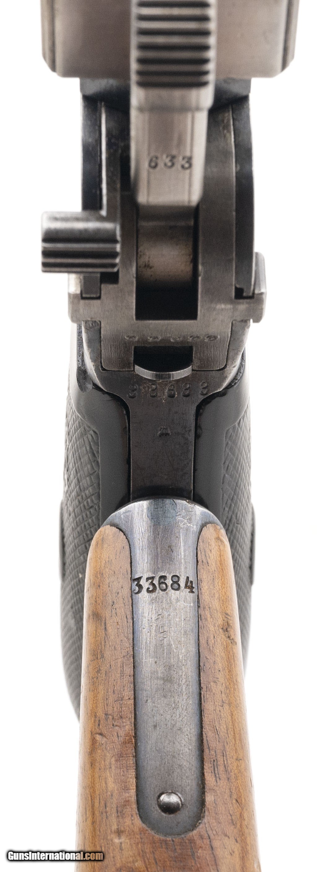 Description: "Serial number 33633. Made in 1903. 7.63 Mauser with a 5 ½" barrel. This is a fantastic example of a large ring Mauser Broomhandle with a shoulder stock. This gun has 90% + of the original blue finish. The left hand side of the frame is marked Von LengerKe & Detmold New York. This is a shallow milled frame. Grips are very good with light handling wear. Stock is very good! (DALLAS LOCATION) Curio/Relic: Yes Price: $7,500.00 Contact Seller |