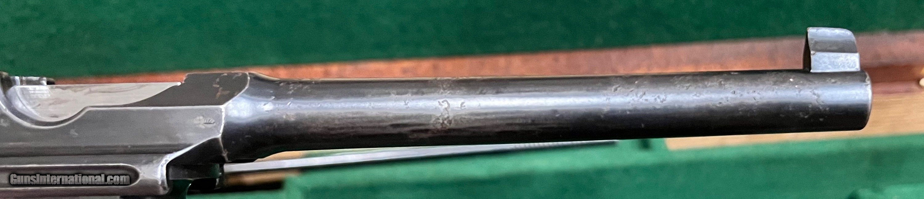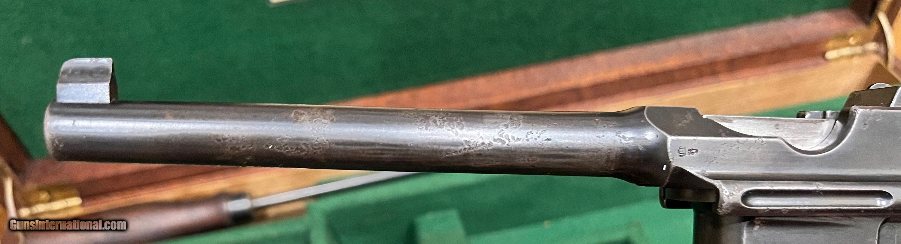 Description: Westley Richards marked & retailed Mauser C96 conehammer Broomhandle pistol Chambered in 7.63x25mm 5.5" barrel with excellent bore Tangent rear sight adjustable from 100-1000 meters Ten round magazine All serial numbers match on the gun 23 groove walnut grips Limited edition case with stock, cleaning rod, and stripper clips. Nicley presented C96 conehammer Broomhandle pistol in very good condition with excellent bore. Antique item that can be shipped direct SOLD Antique: Yes Handgun Caliber: 7.63x25mm Mauser (30 Mauser) |