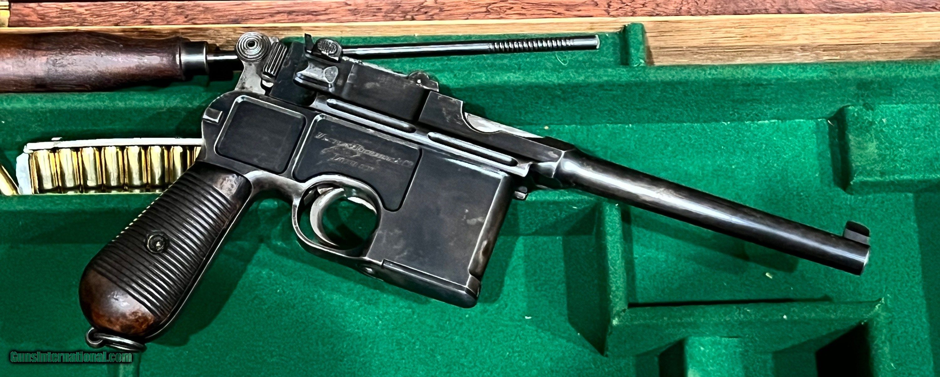 ANTIQUE WESTLEY RICHARDS MARKED AND RETAILED MAUSER C96 7.63X25MM CONEHAMMER BROOMHANDLE PISTOL ALL #’S MATCH STOCK & CASE ADDED LATER BUILT 1897