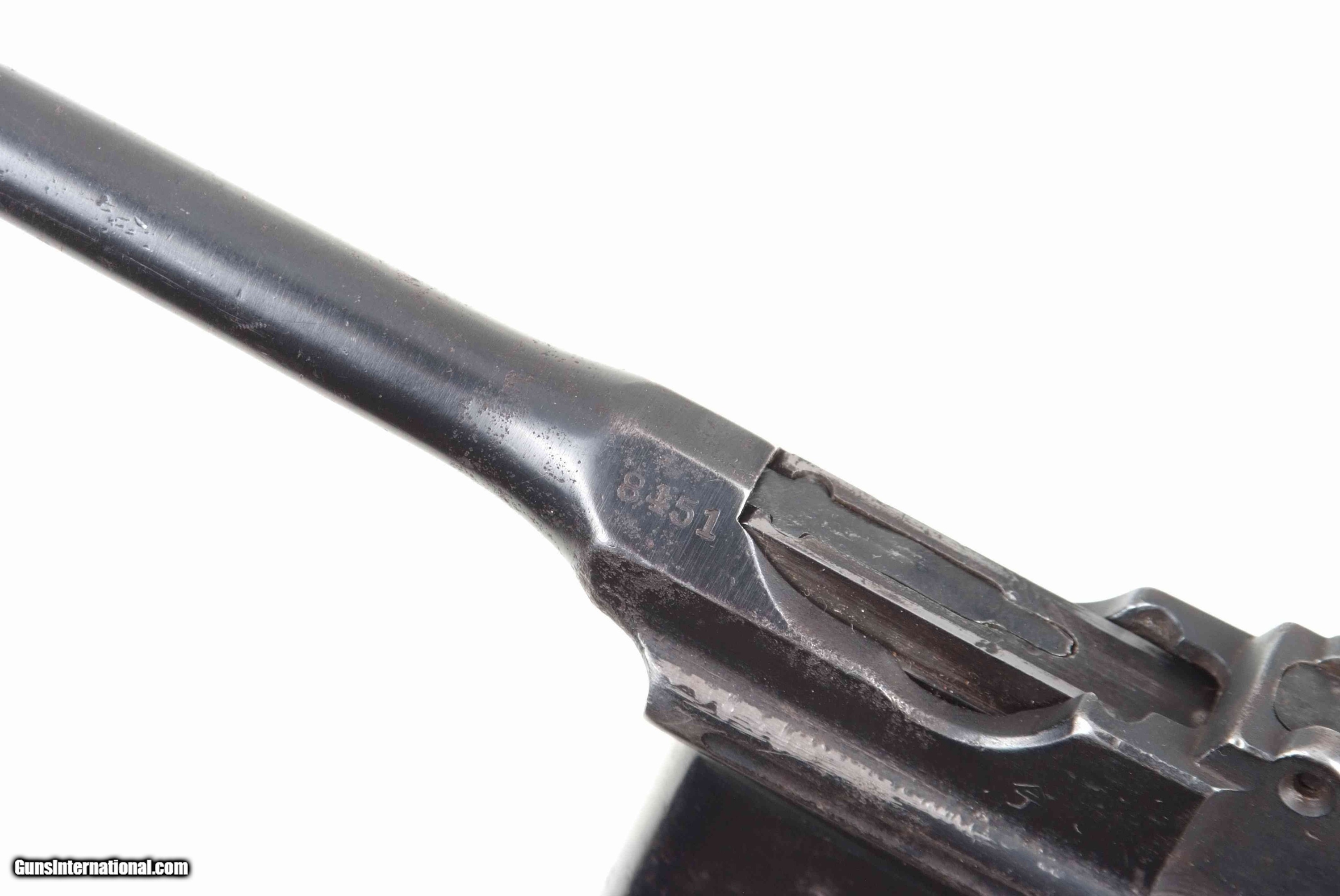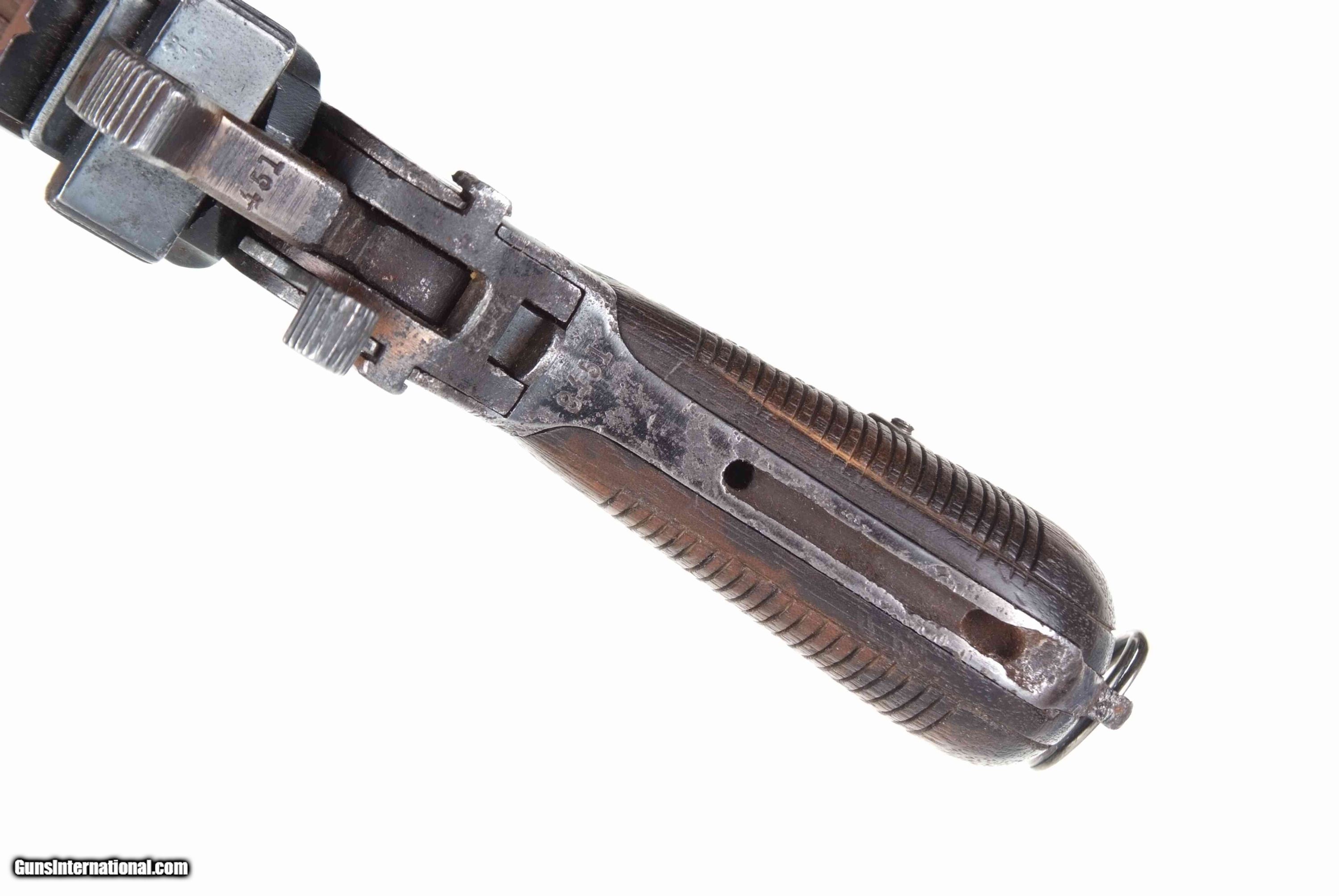 Description: Standard configuration C96 with a 5.5” barrel having fixed front sight on barrel band (as typical for Hanyang made C96s) and slip-in rear sight marked 50/1000. Short extractor, one lug firing pin. Correct safety. Chinese characters on right side of frame largely obliterated by pitting and reblue. Serrated grips secured with a transverse screw. Replacement lanyard ring. No discernable import marks. Synopsis: Chinese Warlord era C96 made by Hanyang Arsenal, in Wuhan, externally matching, reblued. Condition: G- as refinished over scattered pitting. Dull/dark bore with shallow rifling. Perfect manual mechanics. One of the more unusual Chinese C96s, with recognized arsenal markings. A HISTORIC INVESTMENT! NOT TO BE FIRED! NOT TO BE FIRED! NOT BE FIRED! ~~Insured shipping fee of $55; most packages shipped using FedEx 2nd Day.~~ SOLD Manufacturer: Chinese Serial Number: 8451 Caliber Info: 7.63mm |