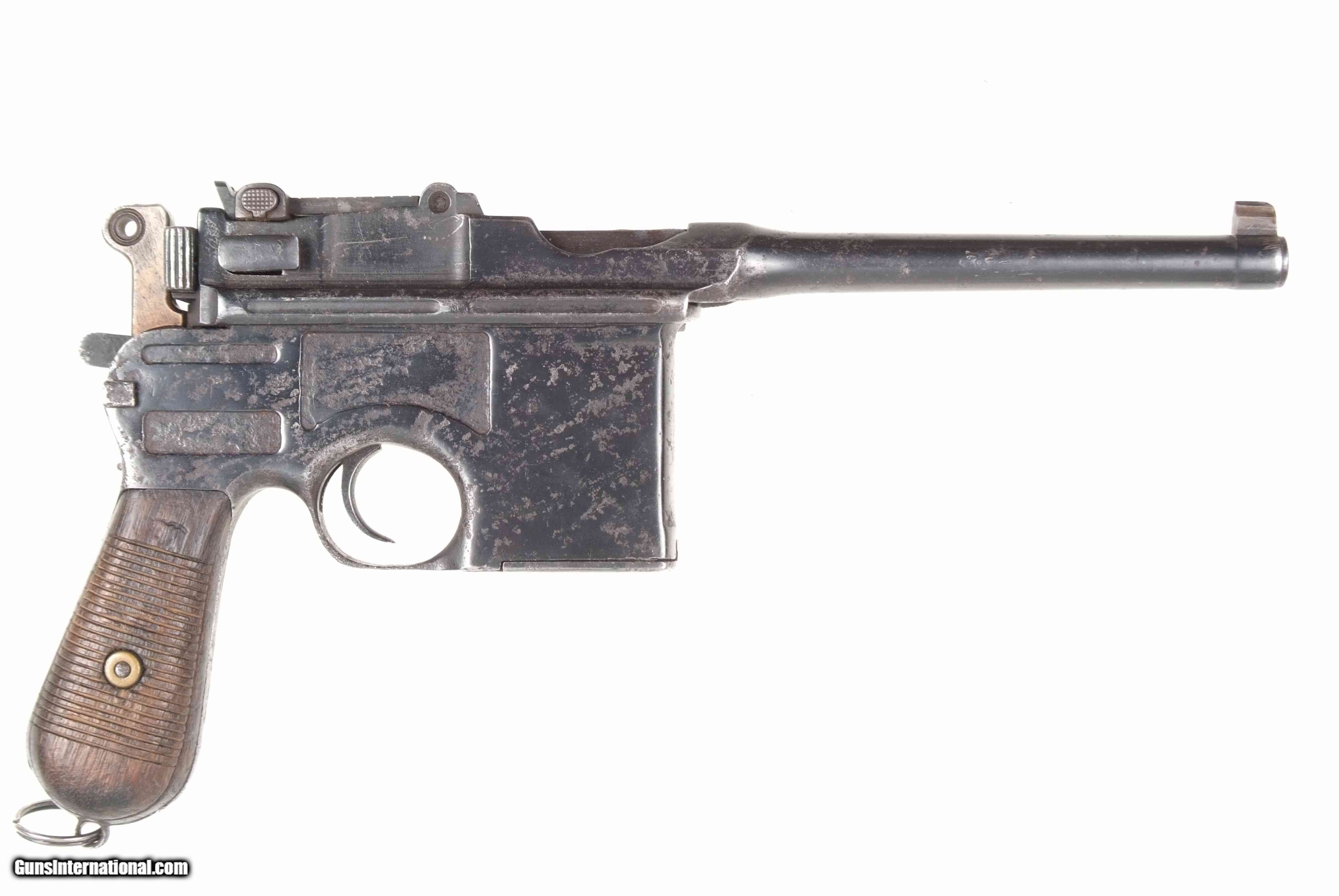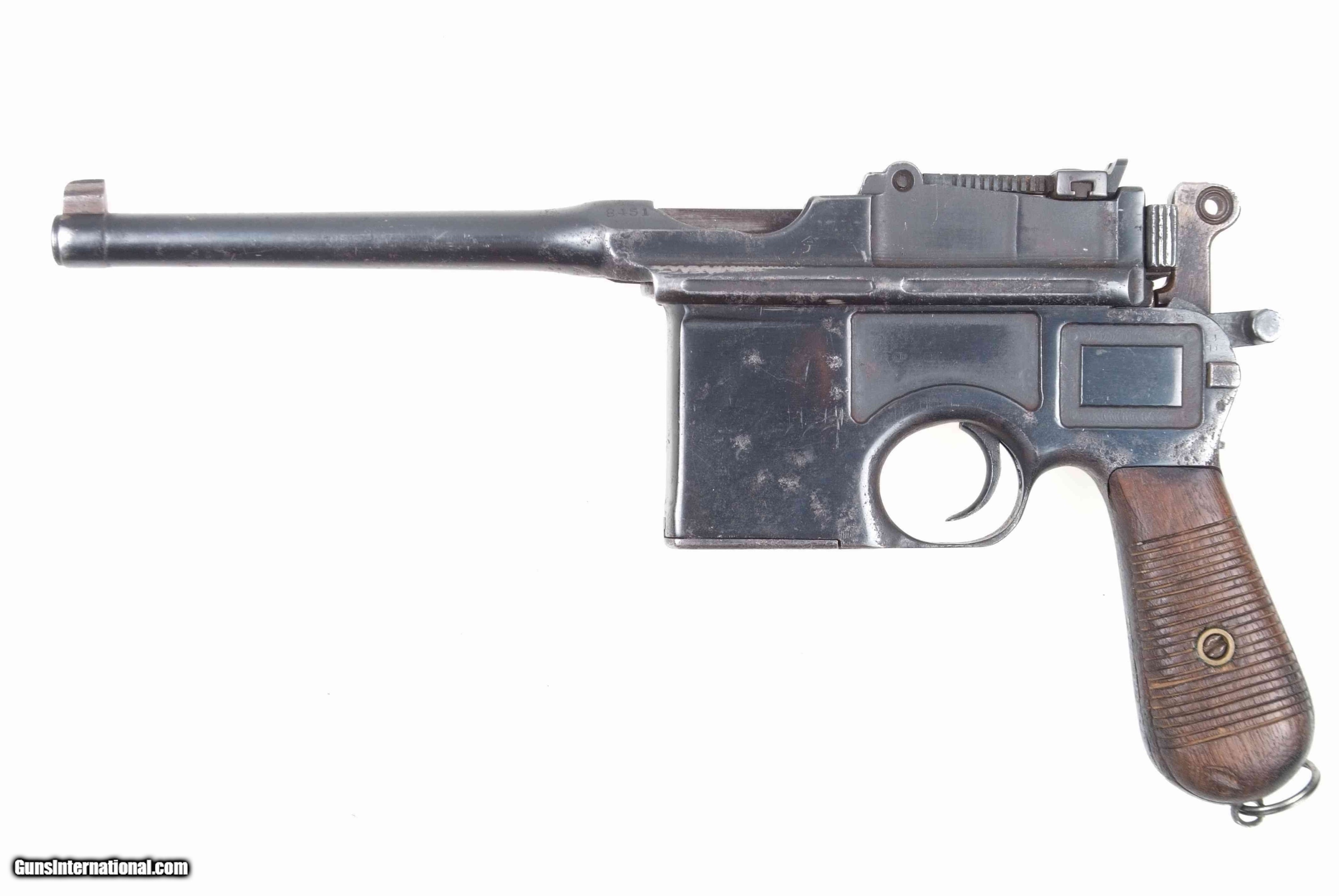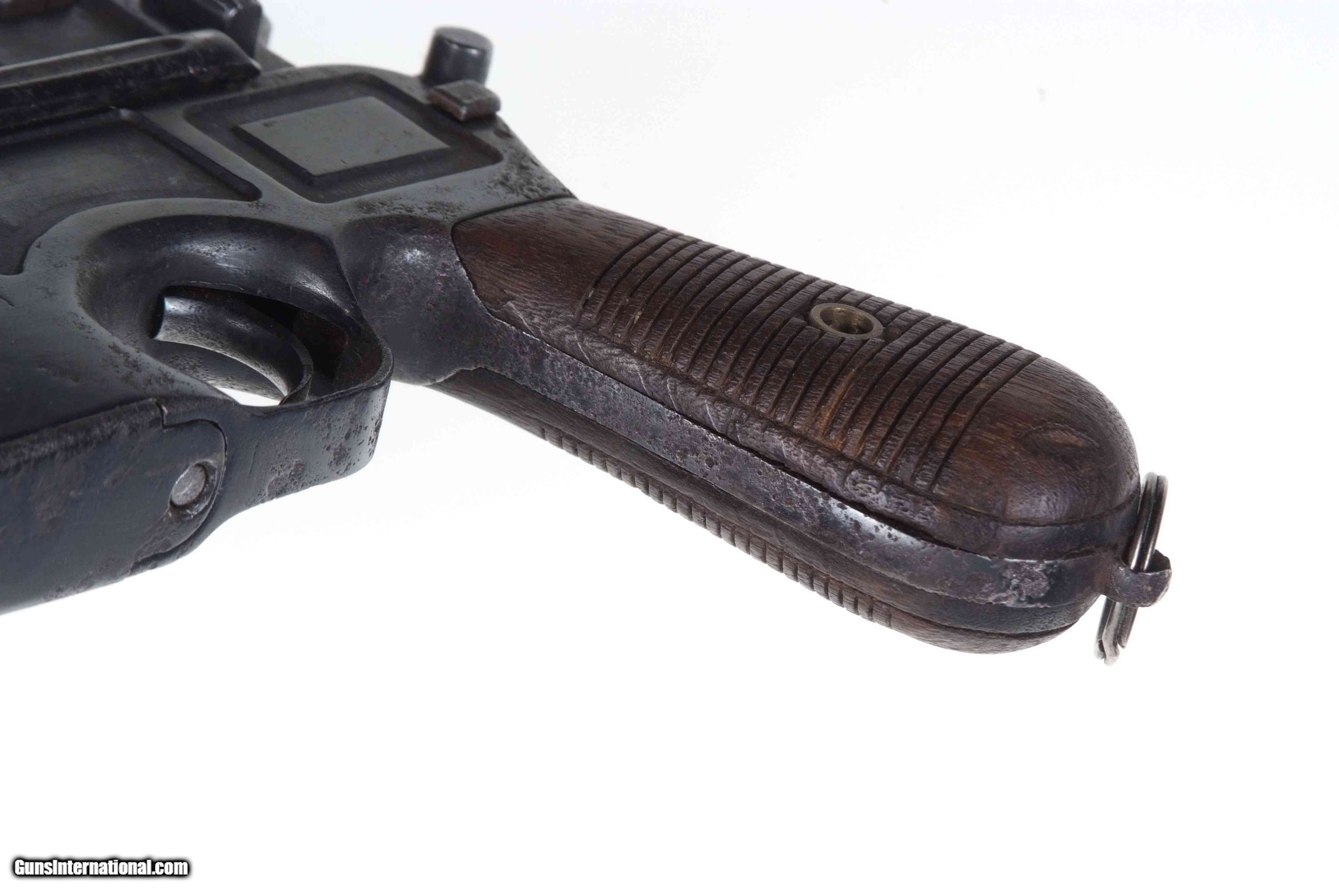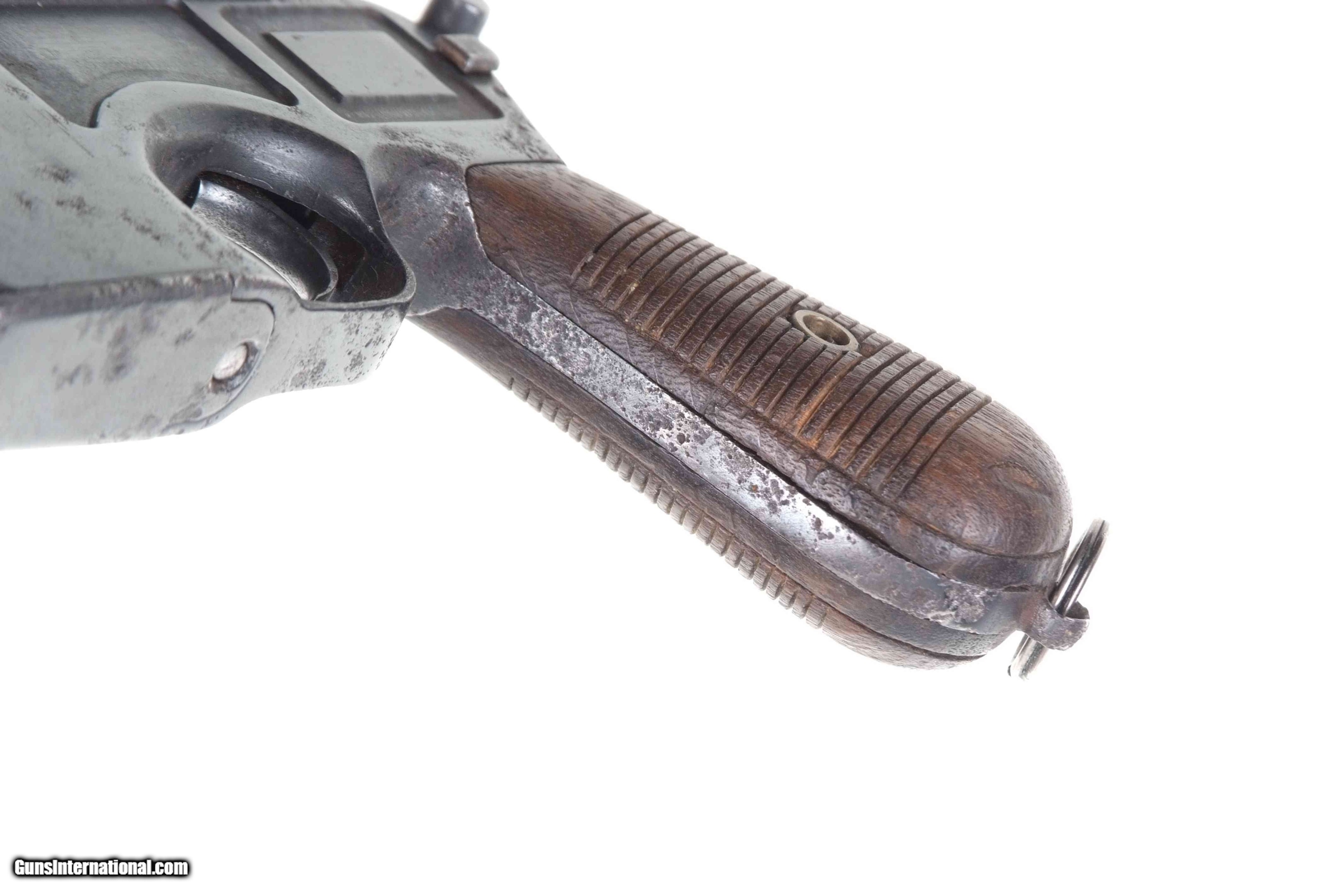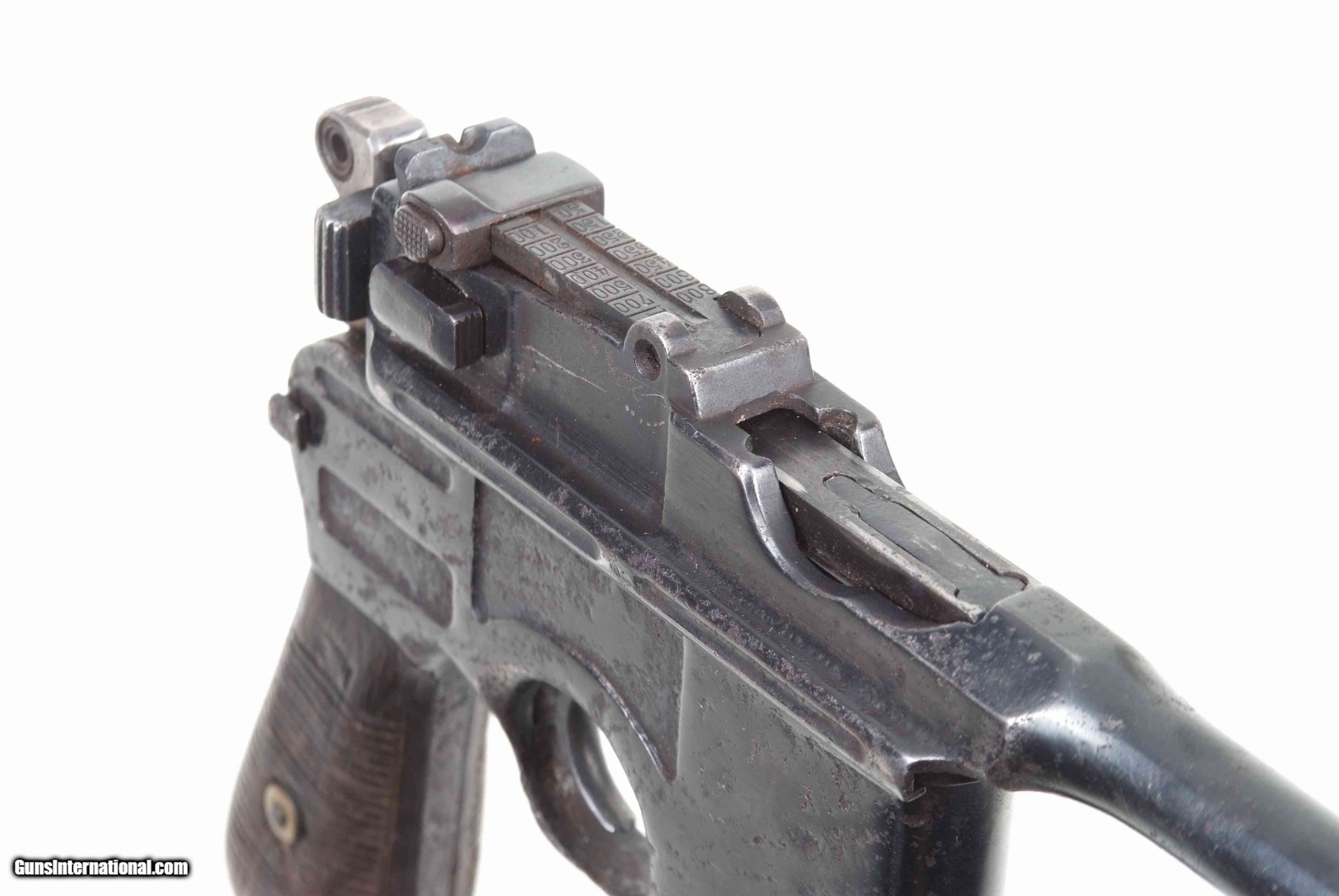 Description: Description: Standard configuration C96 with a 5.5” barrel having fixed front sight on barrel band (as typical for Hanyang made C96s) and slip-in rear sight marked 50/1000. Short extractor, one lug firing pin. Correct safety. Chinese characters on right side of frame largely obliterated by pitting and reblue. Serrated grips secured with a transverse screw. Replacement lanyard ring. No discernable import marks. Synopsis: Chinese Warlord era C96 made by Hanyang Arsenal, in Wuhan, externally matching, reblued. Condition: G- as refinished over scattered pitting. Dull/dark bore with shallow rifling. Perfect manual mechanics. One of the more unusual Chinese C96s, with recognized arsenal markings. A HISTORIC INVESTMENT! NOT TO BE FIRED! NOT TO BE FIRED! NOT BE FIRED! SOLD Manufacturer: Chinese Serial Number: 8451 Caliber Info: 7.63mm |