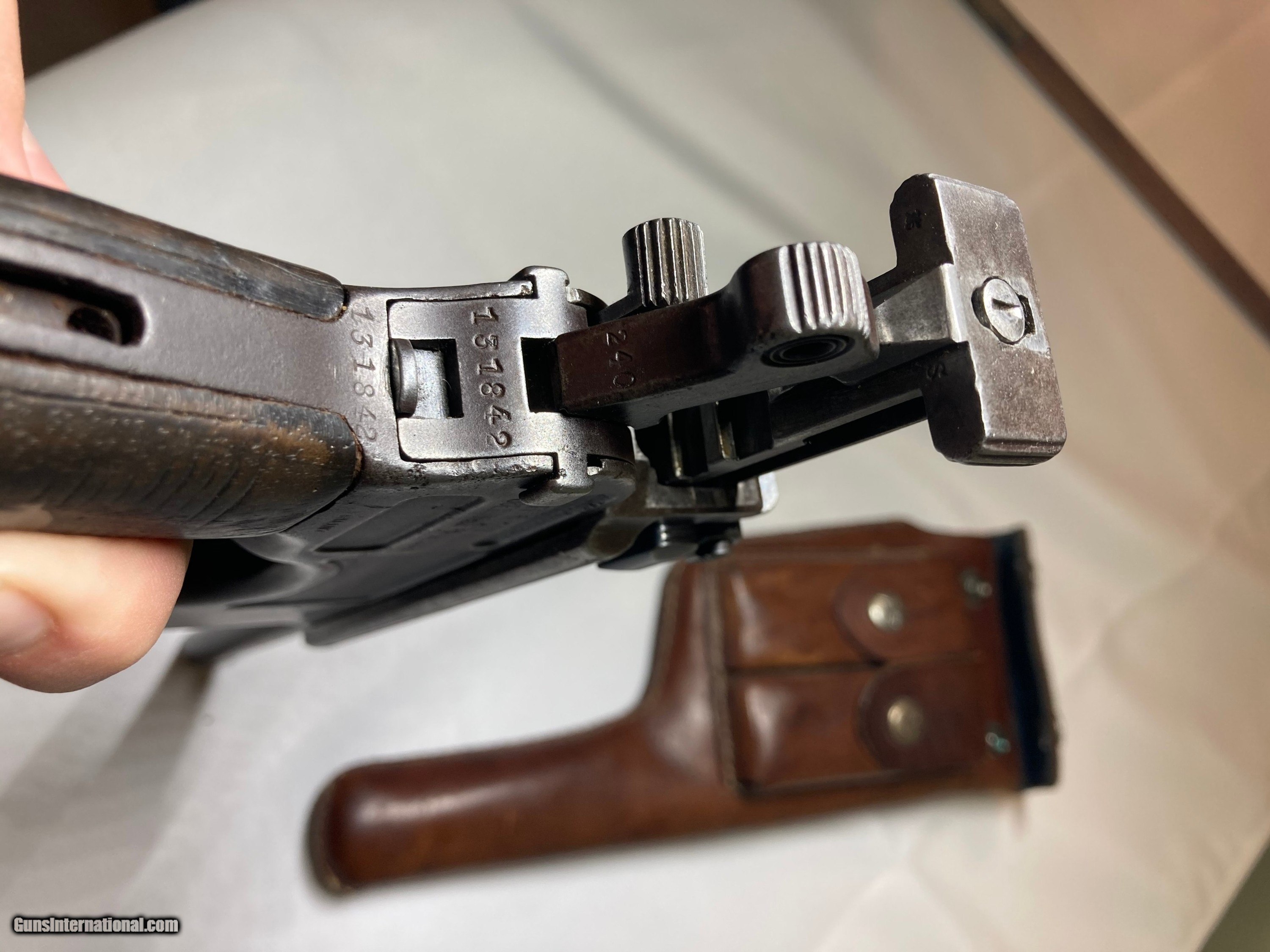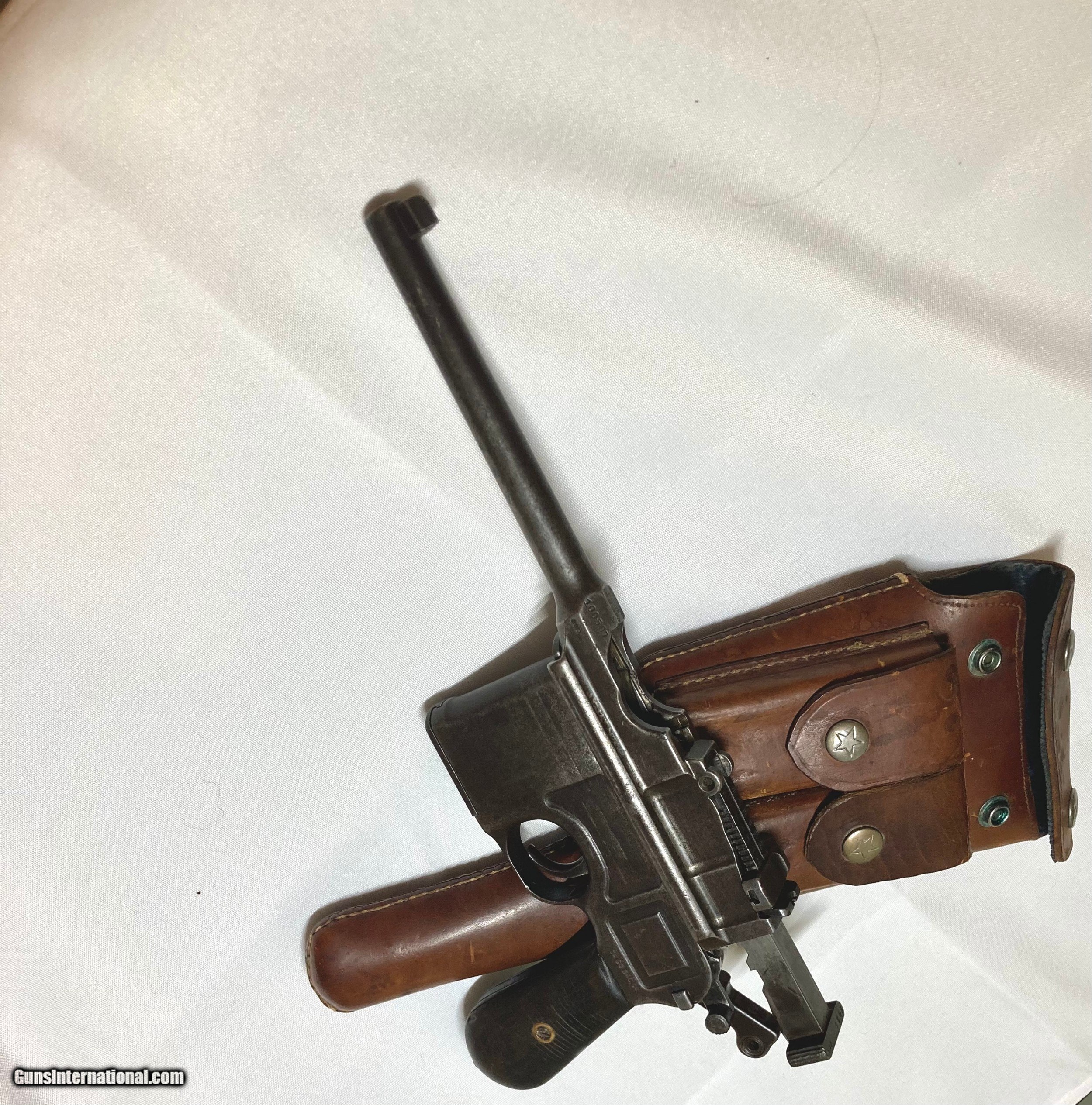 Description: This is a German C96 broomhandle pistol, manufactured pre-world war 1 in Germany and used by the Chinese as a service pistol. These pistols were very heavily used, and as in many cases where they have not been left in their original state, the barrel has very little rifling left and the blueing is very worn. All parts original with no modifications or alterations. Produced by Mauser from 1896 - 1937 and chambered in 7.63MM Mauser (30 Mauser), the highest velocity commercially made cartridge at the time.This would be a great collector or investment piece, as many of this iconic piece of gun history have been reblued or had the bore redone. This gun comes with a Chinese military leather holster, lined with corduroy. German inspection stamps and "Waffenfabrik Mauser" stamp on barrel. Serial Numbers and Locations: 100507 - Slide 131842 - Receiver 1842 - Charging Handle This gun is located at 2nd Amendment Gun Shop located in Seymour, Missouri. We are a small family-owned business specializing in antique, collectible and military firearms. All of our online listings are also available for sale locally through our store. We do offer a 60-day in store layaway plan with 20% down payment. For more information about this item or anything else in our online inventory, feel free to contact us through our Guns International page or give us a call/text at (417) 860-0900 during business hours, Tuesday - Friday 10 AM - 6PM and Saturday 10 AM - 3 PM. Shipping for guns is $35, insured for full gun value. Thank you! SOLD Curio/Relic: Yes Handgun Caliber: 7.63x25mm Mauser (30 Mauser) Manufacturer: Mauser Model: C96 Serial Number: 131842 |