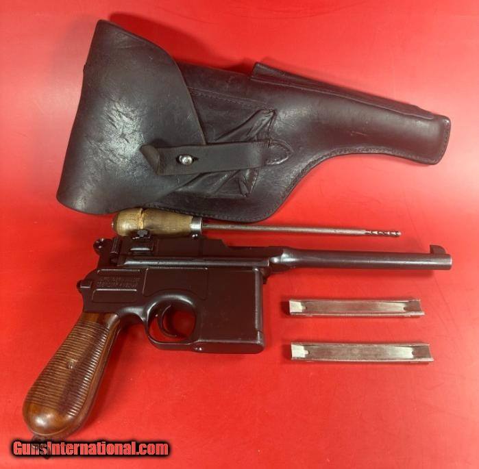 Description: The German C96 Broomhandle Mauser pistol is a fascinating piece of firearms history, embodying both innovative engineering and historical significance. Chambered in 7.63x25mm Mauser, this semi-automatic is remarkably effective firearm even by modern standards. The 7.63x25mm Mauser cartridge, known for its high velocity and flat trajectory. Its internal 10-round magazine and unique ergonomic grip provide a balance of capacity and control. For sale is original Mauser C96, manufactured 1911-1915. The gun is in excellent condition for its age. The metal finish is about 98%, grips are about 98% and have no cracks or chips, all visible parts numbers are matching, bore 6/10. Action works the way it should. Sale includes a leather holster, tool and two loading clips. It will be a great addition to any collection. Layaway and no interest payment plan are available. SOLD Handgun Caliber: 7.63x25mm Mauser (30 Mauser) |