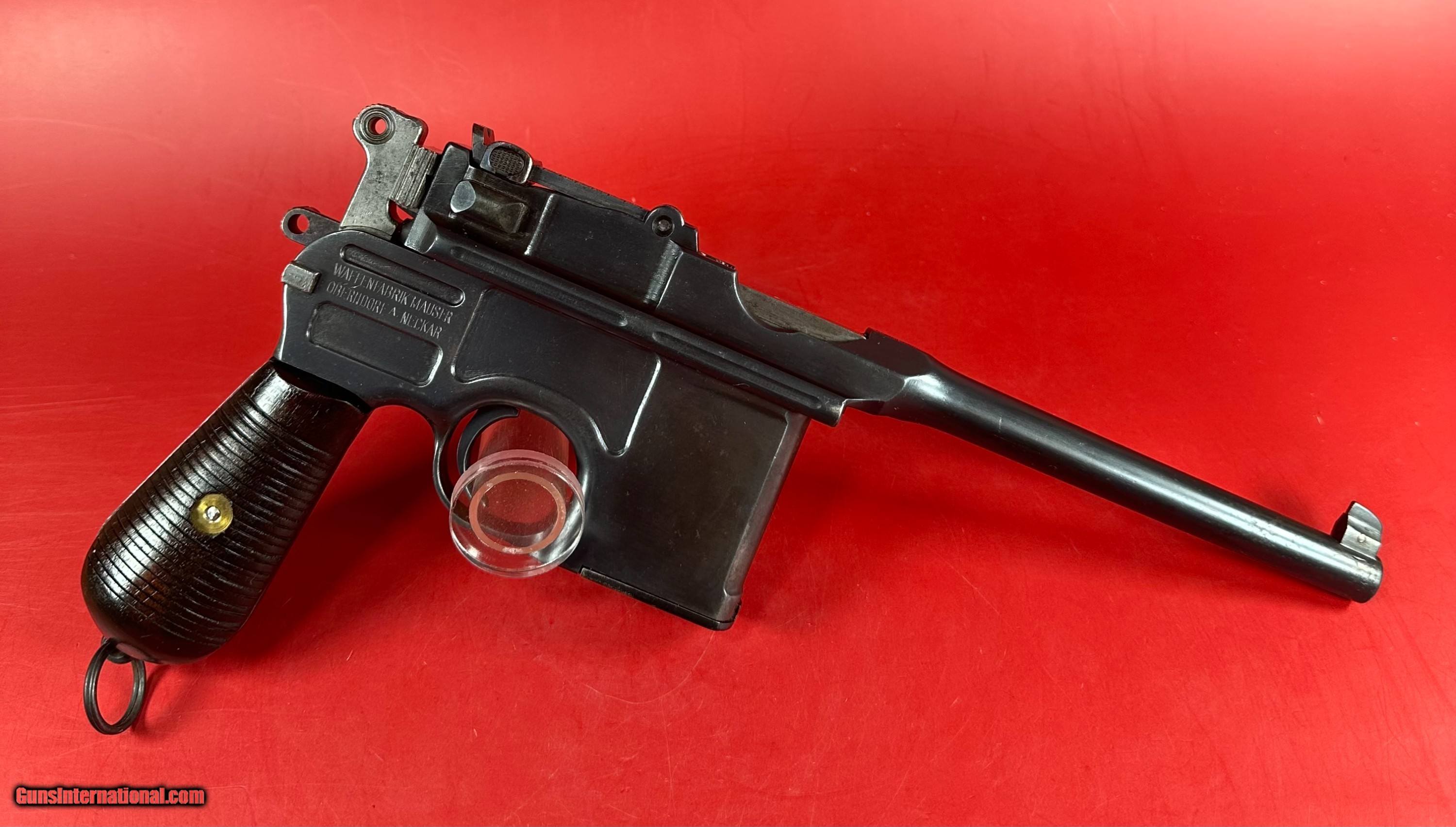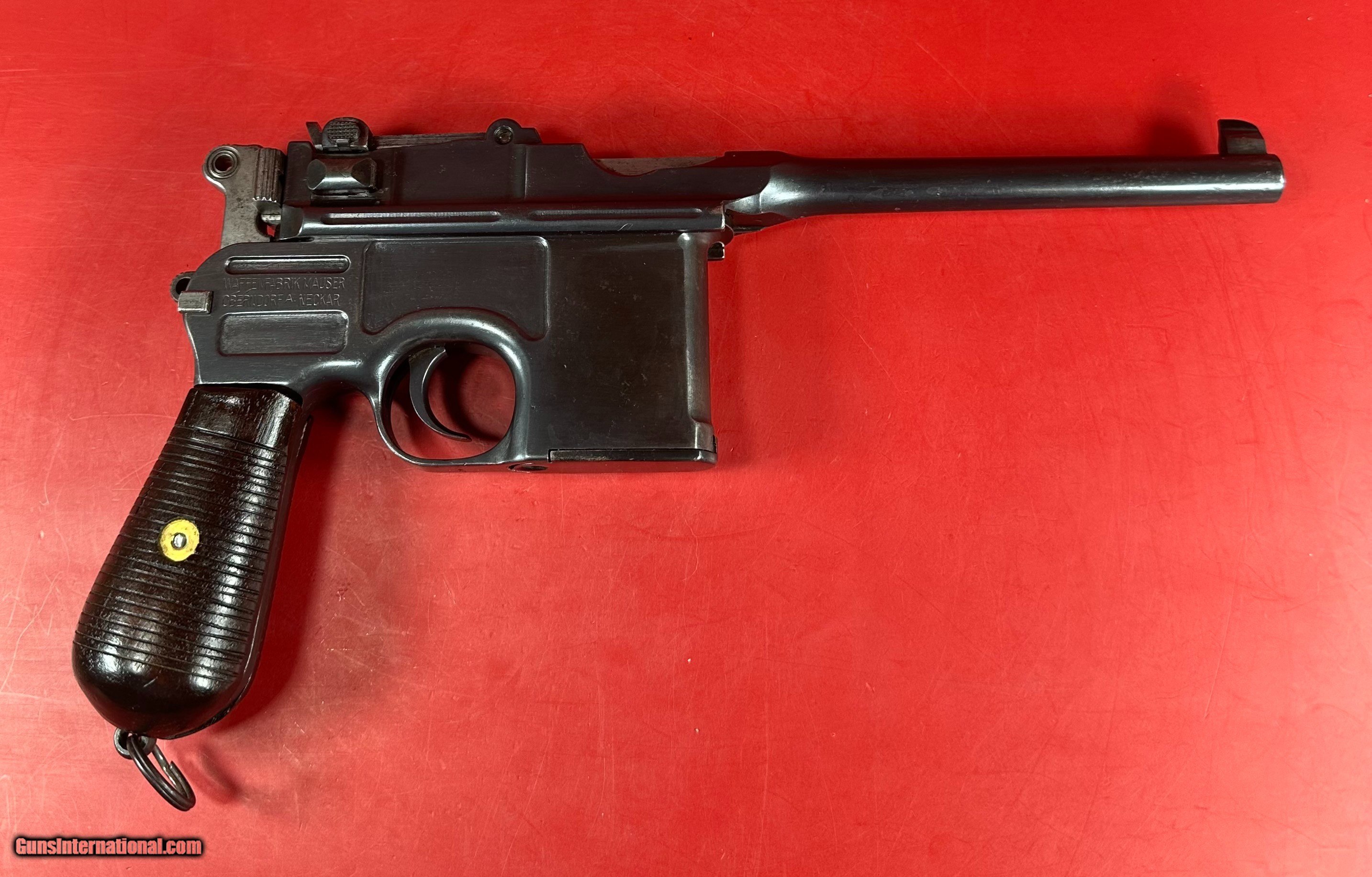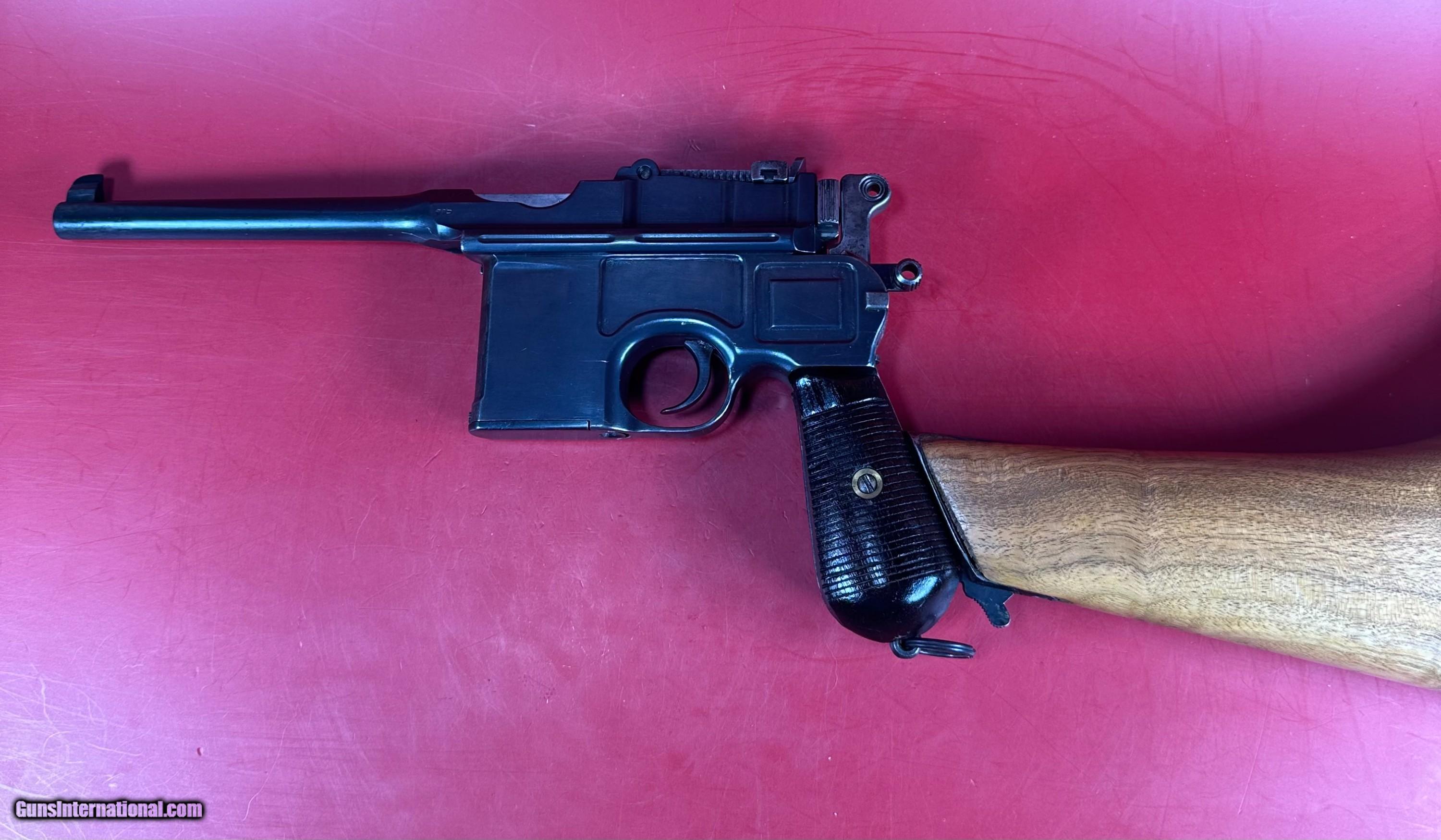 Description: The German C96 Broom handle Mauser pistol is a fascinating piece of firearms history, embodying both innovative engineering and historical significance. Chambered in 7.63x25mm Mauser, this semi-automatic is remarkably effective firearm even by modern standards. The 7.63x25mm Mauser cartridge, known for its high velocity and flat trajectory. Its internal 10-round magazine and unique ergonomic grip provide a balance of capacity and control. For sale is original Mauser C96. The gun is in excellent condition. Metal finish is about 98%, grips are about 97%, no chips or cracks, bright bore with strong rifling. Action works the way it should. All visible numbers are matching. Sale includes a reproduction wood stock / holster, Mauser cleaning tool, loading strips. This gun is not NFA and doesn't require Tax stamp. It will be a great addition to any collection. Layaway and no interest payment plan are available. SOLD Handgun Caliber: 7.63x25mm Mauser (30 Mauser) |