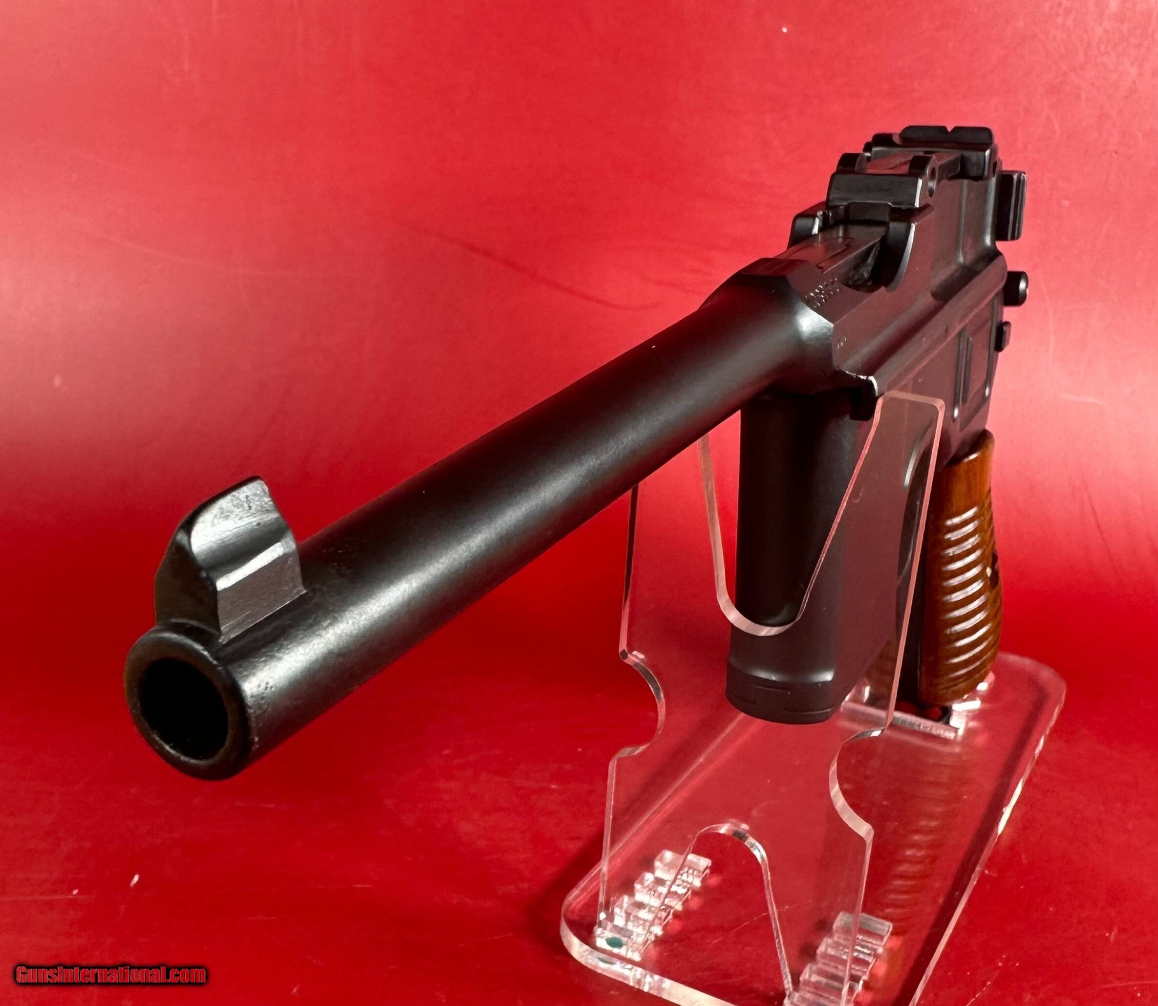 Description: The German C96 Broom handle Mauser pistol is a fascinating piece of firearms history, embodying both innovative engineering and historical significance. Chambered in 7.63x25mm Mauser, this semi-automatic is remarkably effective firearm even by modern standards. The 7.63x25mm Mauser cartridge, known for its high velocity and flat trajectory. Its internal 10-round magazine and unique ergonomic grip provide a balance of capacity and control. For sale is original Mauser C96. The gun is in excellent condition. Metal finish is about 98%, grips are about 99%, no chips or cracks, bright bore. Action works the way it should. Matching numbers. Sale includes wood stock / holster, Mauser cleaning tool, loading strips. This gun is not NFA and doesn't require Tax stamp. It will be a great addition to any collection. Layaway and no interest payment plan are available. 7.24 or SOLD Handgun Caliber: 7.63x25mm Mauser (30 Mauser) |