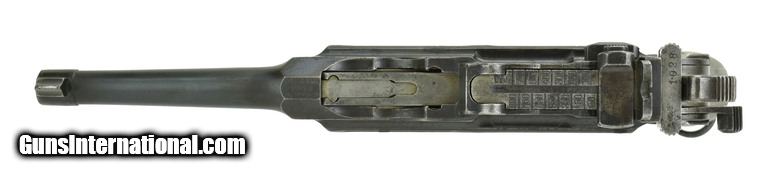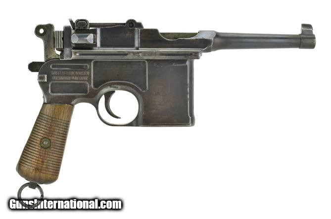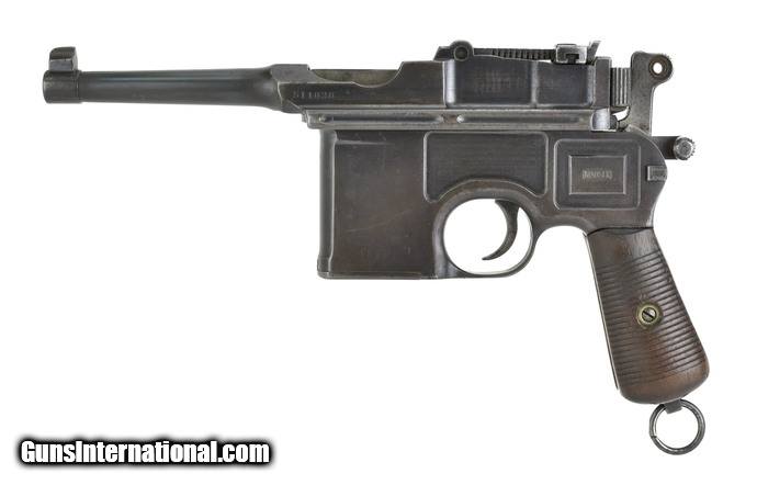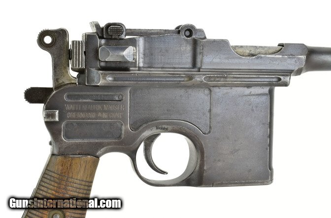 Mauser 1896 7.63 Mauser caliber pistol. Bolo Mauser late production. Bore is excellent with strong rifling and bright bore. Action works perfectly. Gun has approximately 80-85% blue with the rest of the finish as a blue/brown patina mix. Grips are excellent and matching.