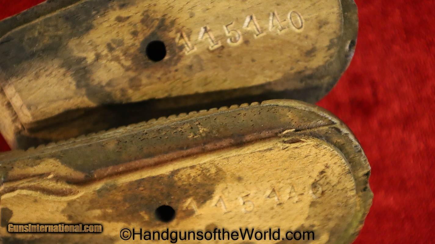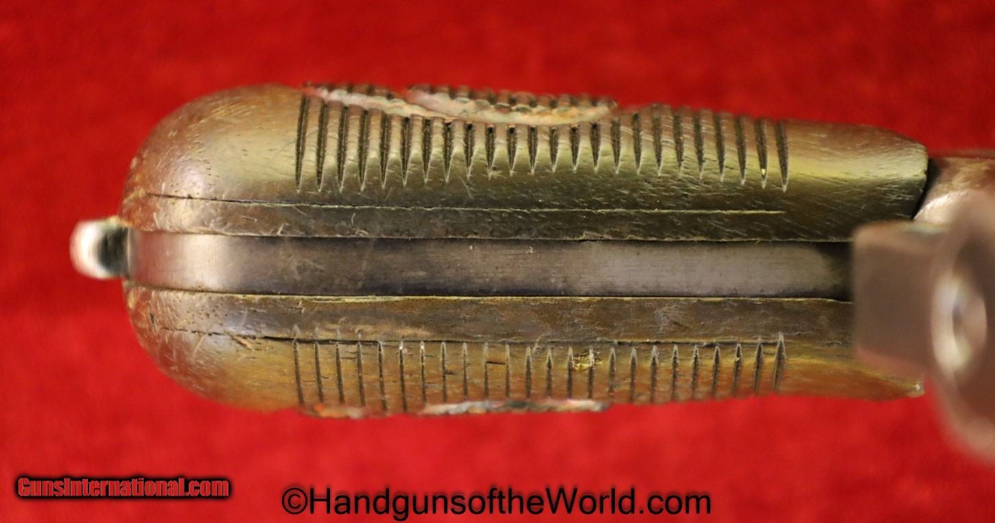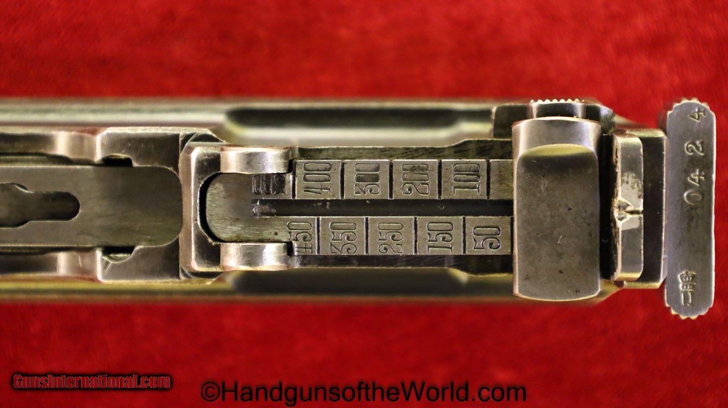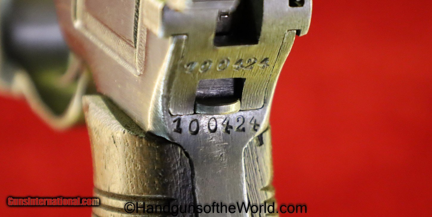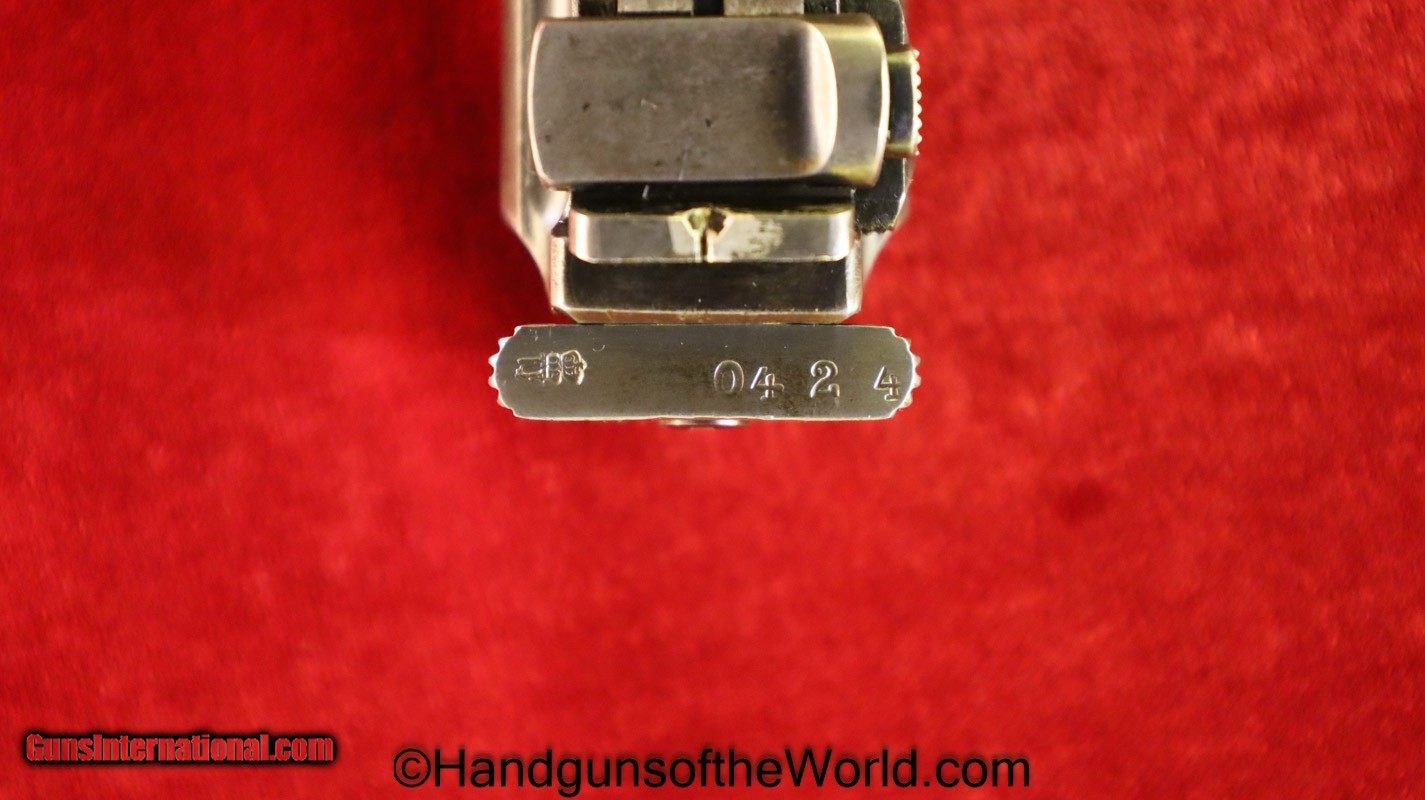 Description: Mauser 1896 Broomhandle, 9mm. This has the lined walnut Red 9 grips from a different gun. This has all matching numbers with an unnumbered sear, to include the wooden holster shoulder stock. This is a WWI Military issue pistol with the 5 1/2″ barrel. The blue rates about 70% and the bore is VG. The stock shows some abuse, but is serviceable. Curio/Relic: Yes Handgun Caliber: 7.63x25mm Mauser (30 Mauser) Manufacturer: Mauser Model: C96 Price: $5,750.00 Shipping: $55.00 Contact Seller |