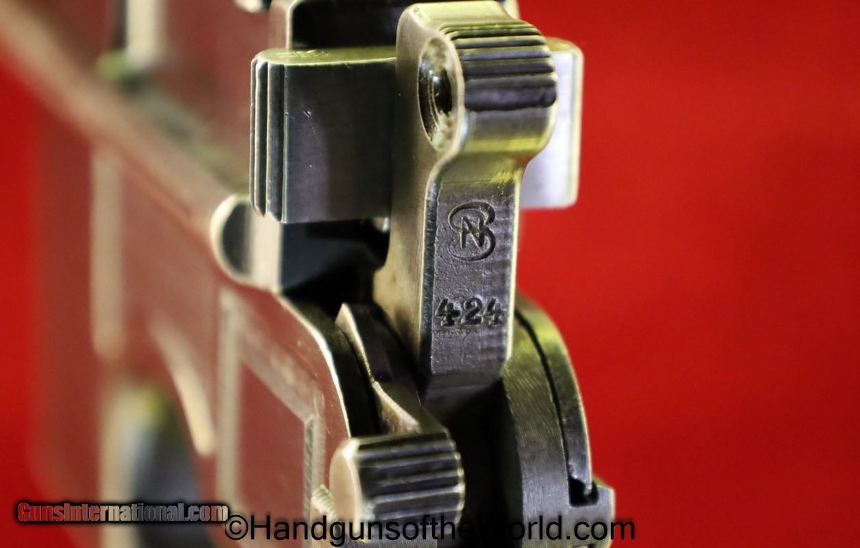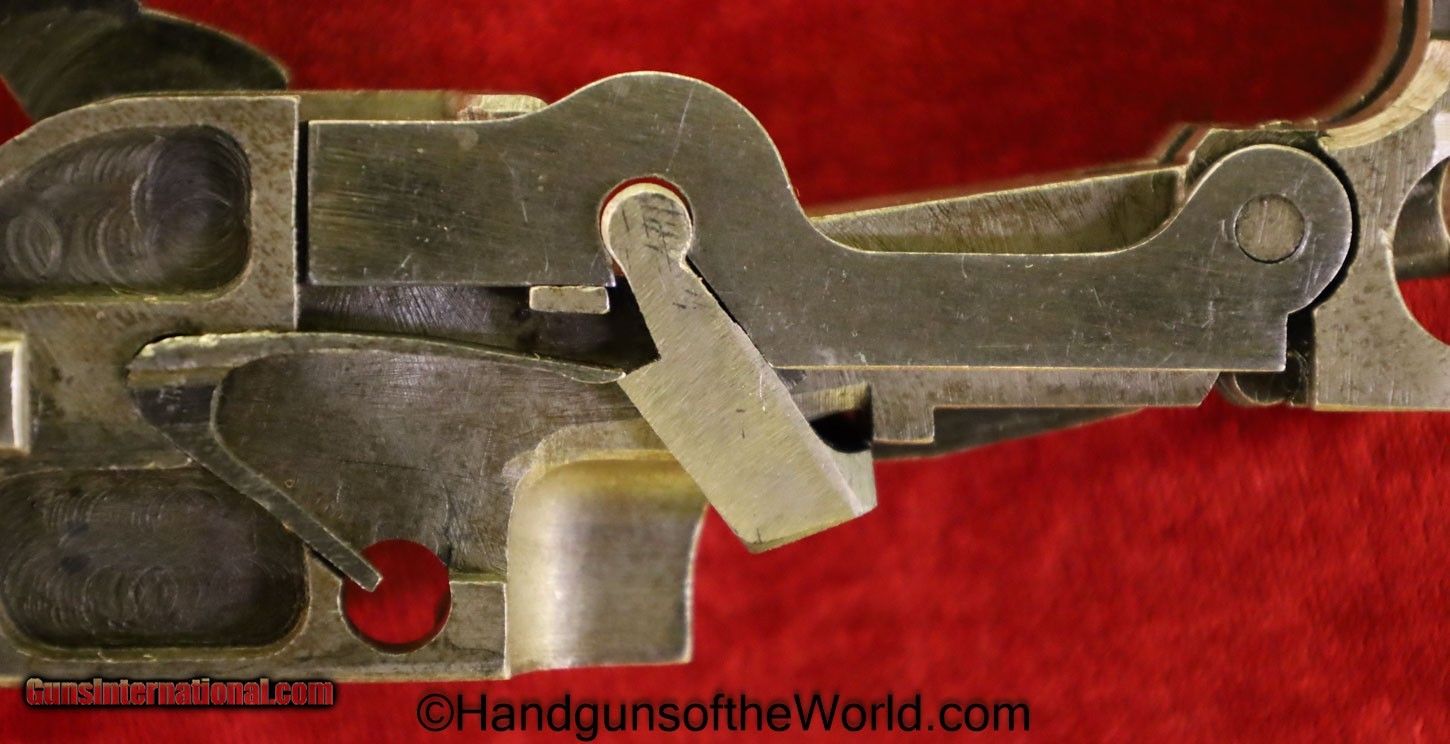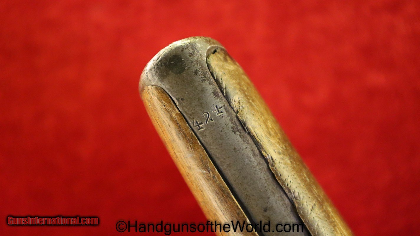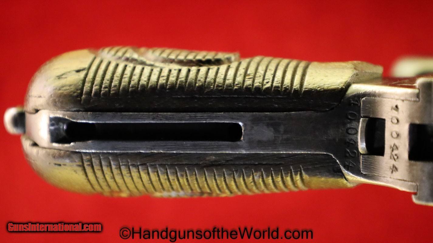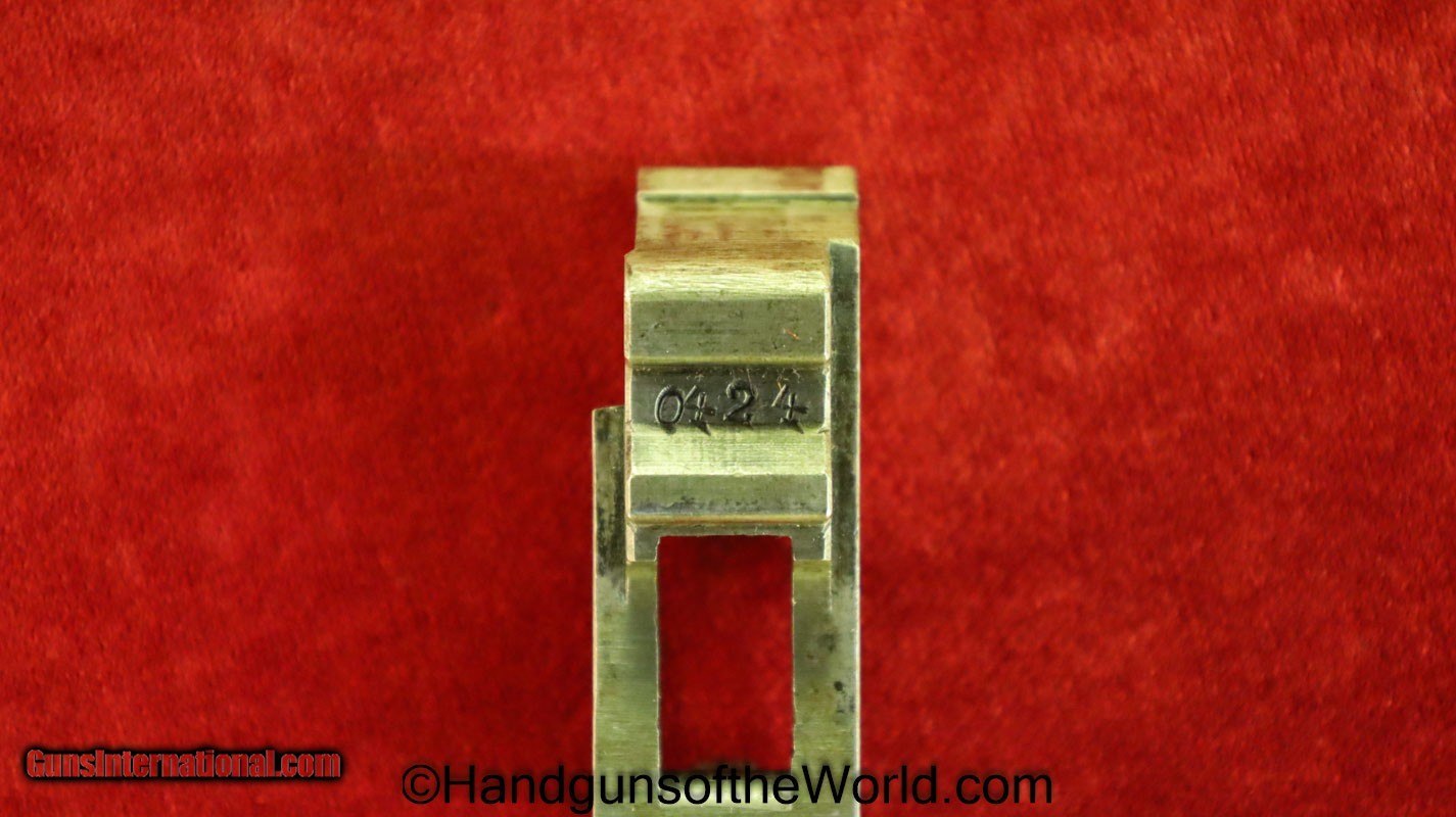 Description: Mauser 1896 Broomhandle, 9mm. This has the lined walnut Red 9 grips from a different gun. This has all matching numbers with an unnumbered sear, to include the wooden holster shoulder stock. This is a WWI Military issue pistol with the 5 1/2″ barrel. The blue rates about 70% and the bore is VG. The stock shows some abuse, but is serviceable. Curio/Relic: Yes Handgun Caliber: 7.63x25mm Mauser (30 Mauser) Manufacturer: Mauser Model: C96 Price: $5,750.00 Shipping: $55.00 Contact Seller |