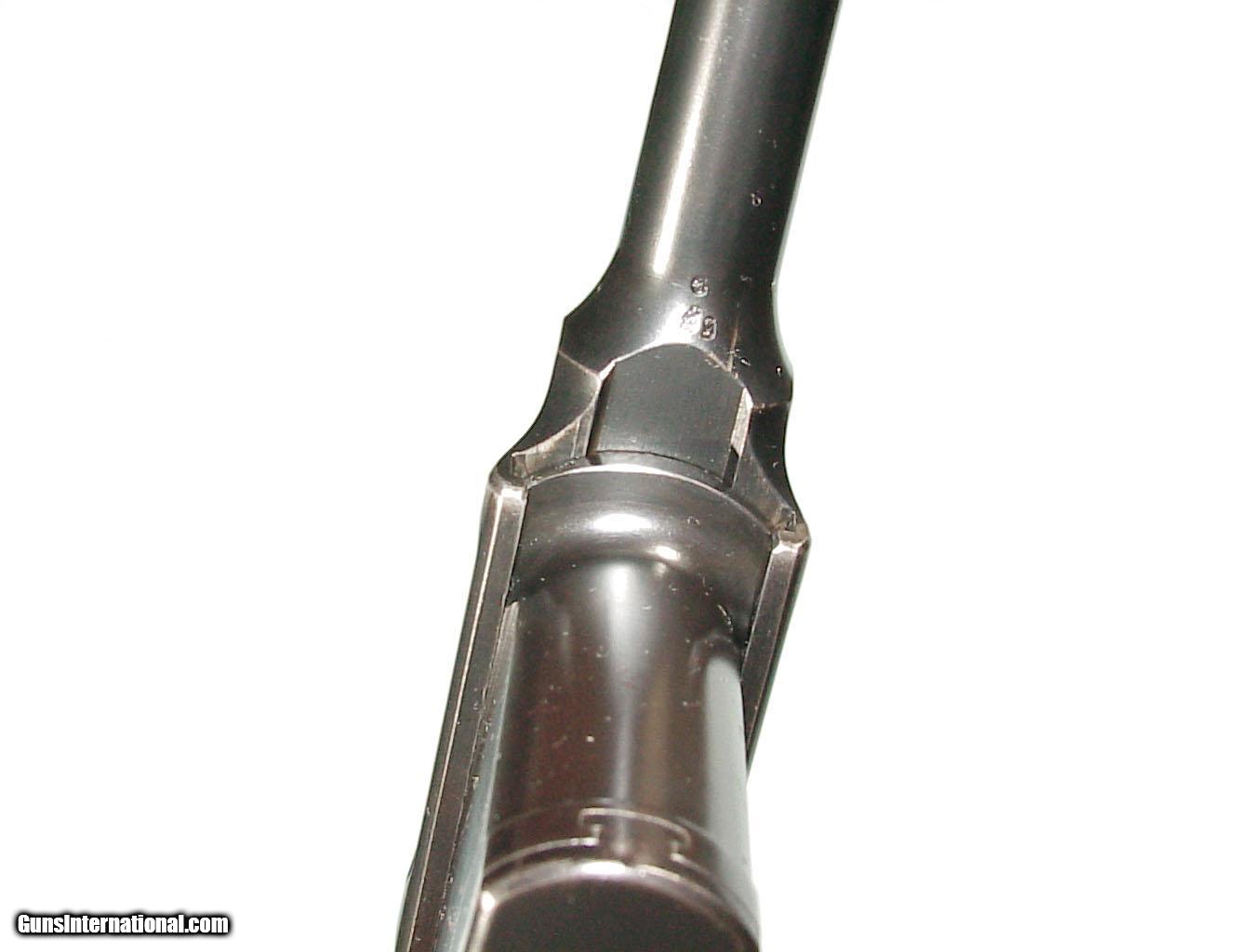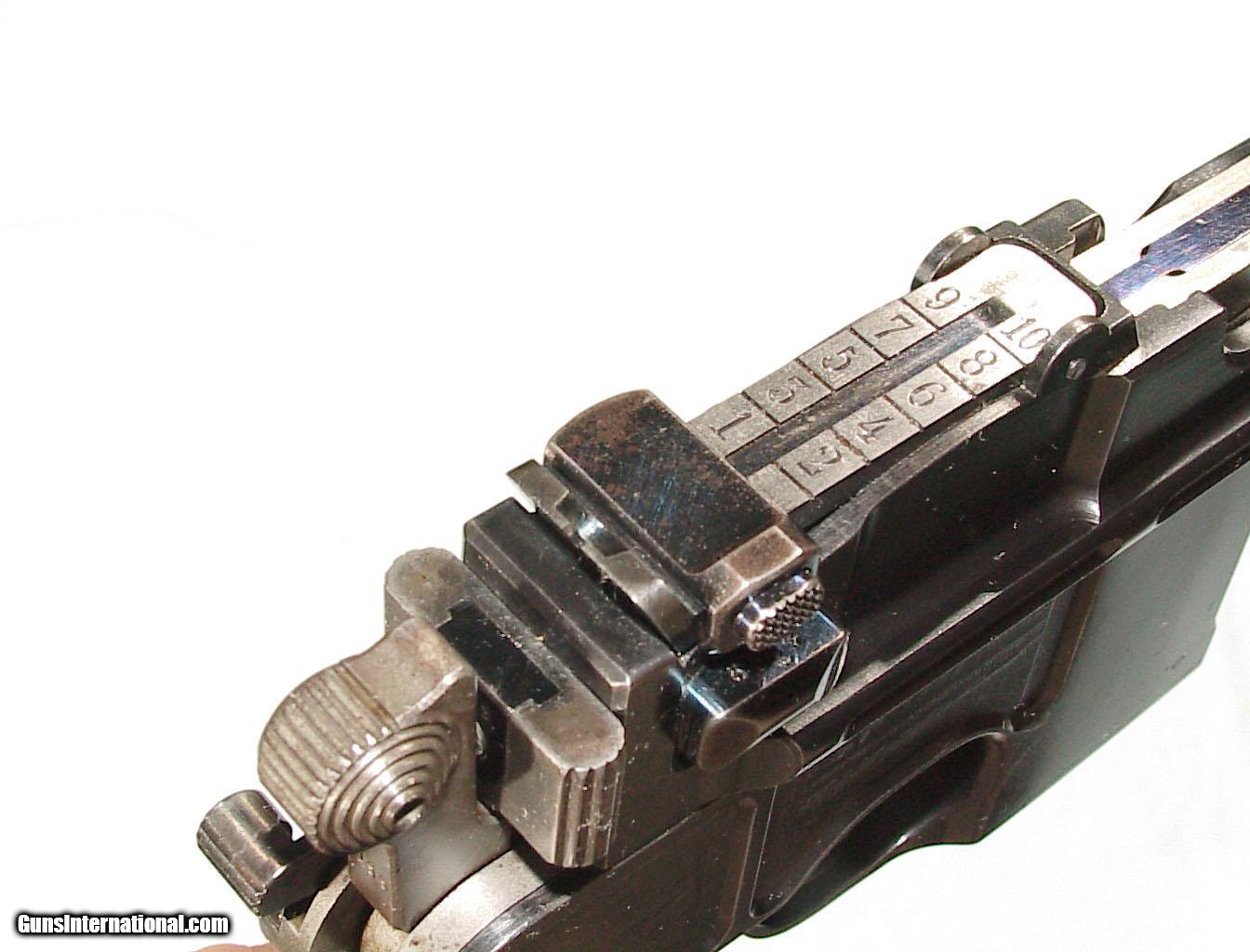 Description: .30 Mauser ctg., 5.5" barrel, finished blue overall. Walnut bag style grips. Matching shoulder stock & holster combination. In superb original condition retaining nearly all of the original blue, 95-97 fire blue remaining on the rear sight and other appropriate parts. Mint bore and grips. All matching numbers. In it's original shoulder stock numbered to the gun. SOLD Antique: Yes |