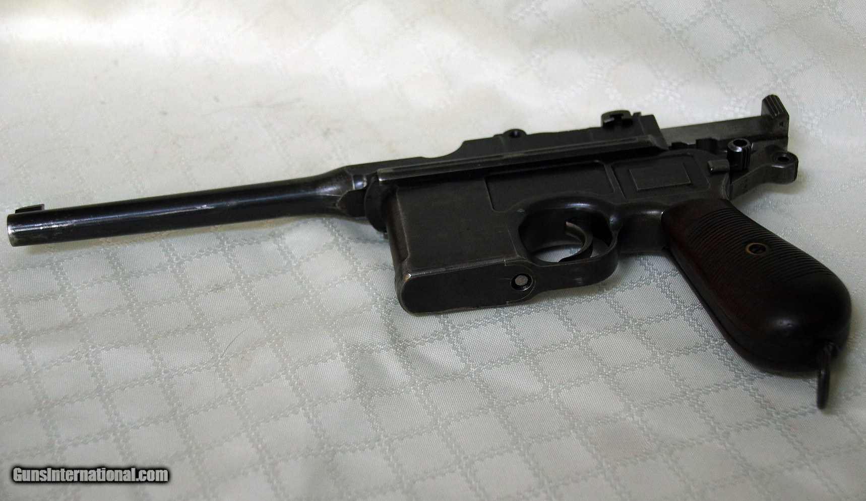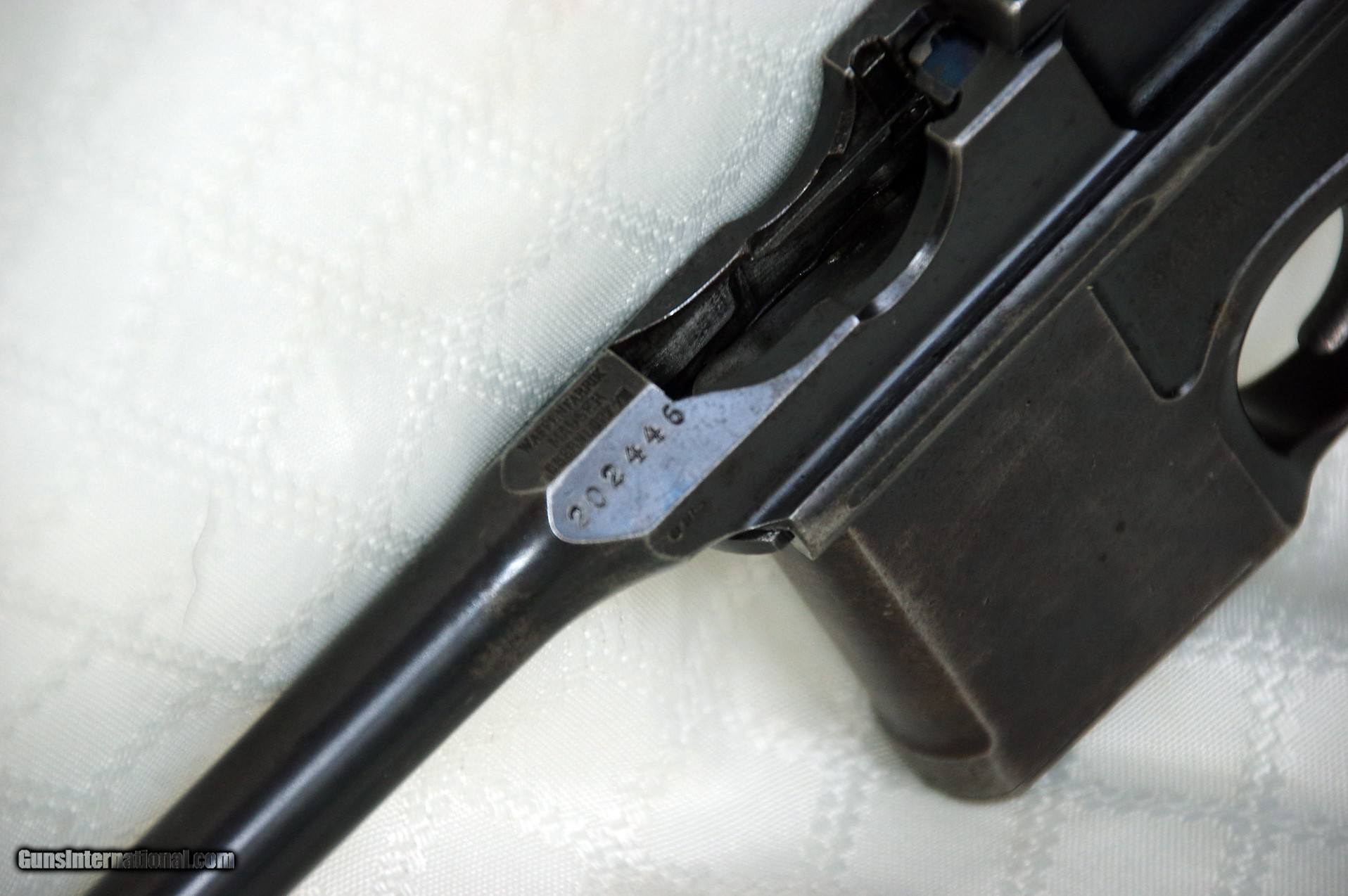 Description: Pre war (WW !) commercial Mauser C96 in its original caliber 7.63×25mm. It was probably manufactured around 1912 or so with a serial # of 202446. Gun is in original condition with about 90% of its original finish. The pistol is fully functional in firing condition and with a good bore with some frosting. It has some holster wear as can be seen in the photos. All numbers match, including the ones in the grips (inside). The metal is in good shape and the grips are very good too. I am a private collector and have owned this firearm for over 30 year but I am downsizing as I get older. I would like the gun to go to a good home or collector. SOLD Handgun Caliber: 7.63x25mm Mauser (30 Mauser) Manufacturer: Mauser Model: C96 Serial Number: 202446 Barrel Length: 5 inches Bore: Good grooves Chambers: Very good Ejectors: Very good Condition: Very good Metal Condition: Very good Wood Condition: Excellent Bore Condition: Very good Barrels: Showing some holster wear Action: Semy auto |