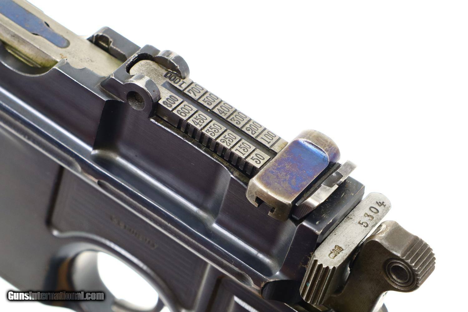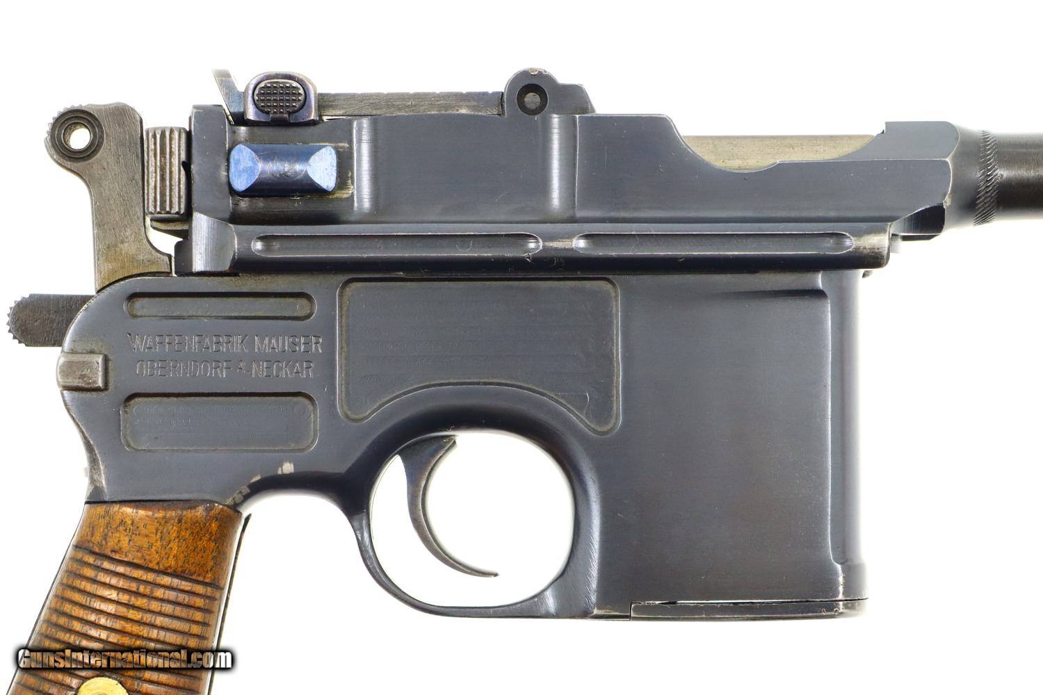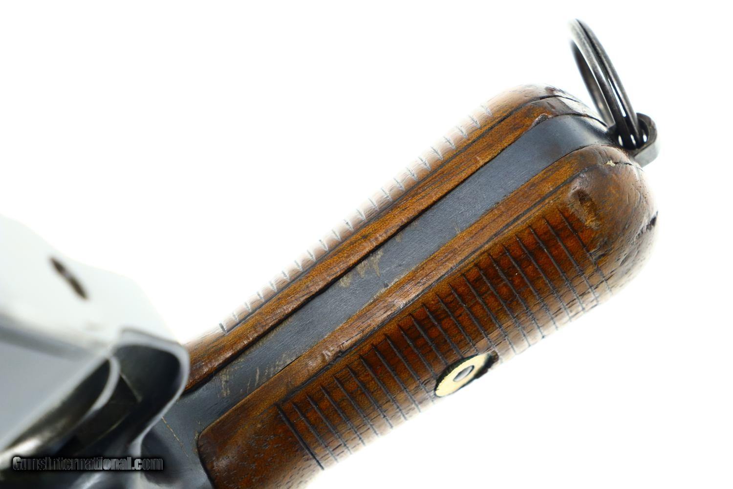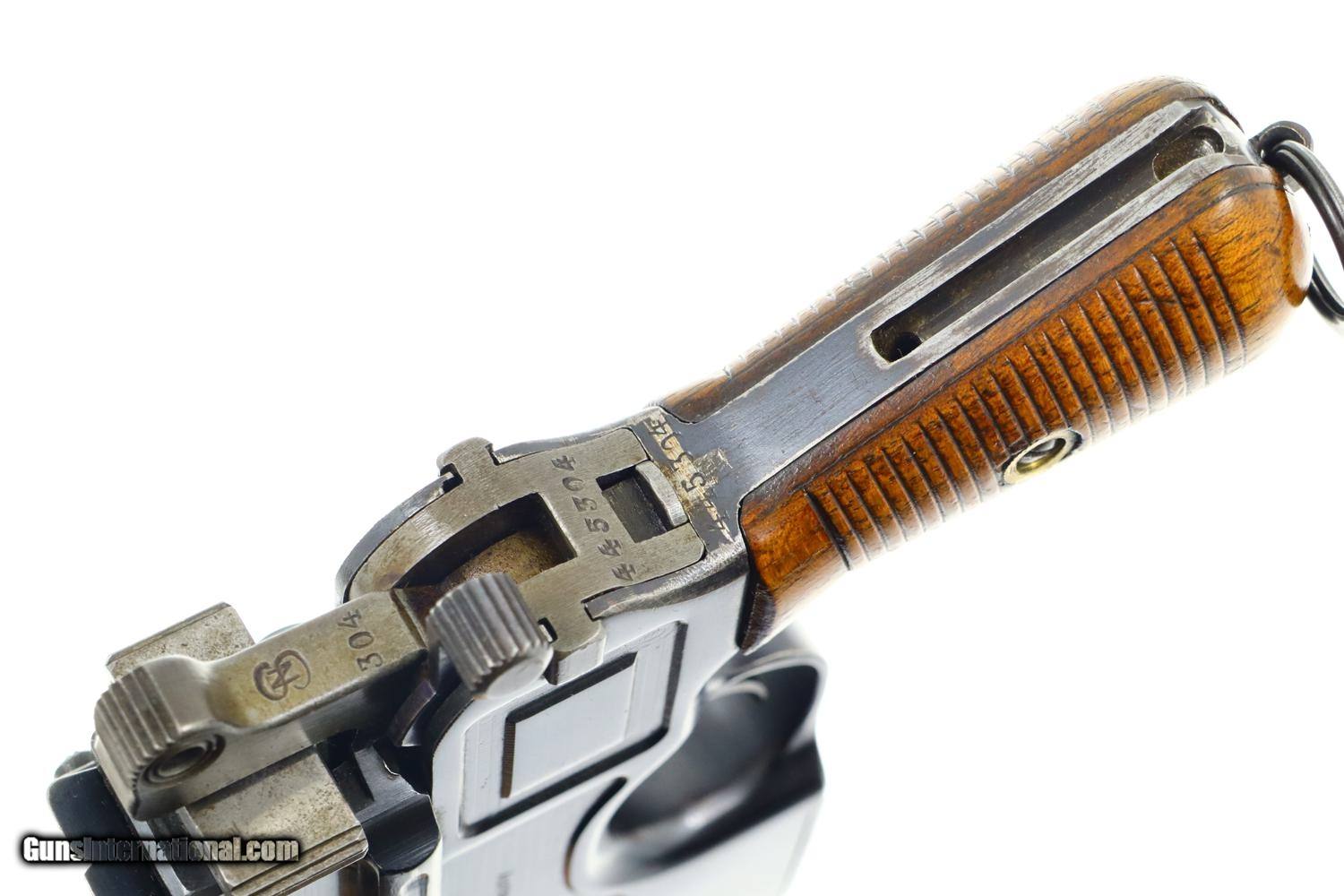 Description: Synopsis: Mauser, C96, Post War Hash Marked Long Barrel Bolo, 445304, FB00948 Description: Very attractive C96, Post War Hash Marked Long Barrel Bolo, all matching and factory original except for replacement bolt stop. Cal: 7.63mm. This is one of the scarcer Post WWI C96 pistols, found in a narrow serial range, that was factory rebarreled to 6” using a barrel with a banded and pinned front sight and hash markings/knurling to conceal the juncture between barrel and extension. Fitted with a slip-in 50-1000 rear sight and two lug firing pin. Three line address on top of chamber. Full serial number on left chamber flat. Crown/crown/U proofing on left side of barrel extension. Left side of frame marked Germany for export. Usual two line address on right side of frame. Serrated walnut grips. Original lanyard ring. Disassembly shows a fully matched pistol except the bolt stop that is number 745. Condition: VG-EXC bright original rust blue, the later added barrel having a different tone than the balance of the pistol. Expected sharp edge wear with slight thinning of front and back straps as consistent with a pistol that has seen light/moderate use. Comparable condition fire blued small parts and grips. Bright bore, minimal etching, sharp rifling. Correct manual mechanics. One of the scarcer and immediately recognizable of the Post War Mauser Bolo C96s! ~~Insured shipping fee of $75; most packages shipped using FedEx 2nd Day.~~ SOLD Manufacturer: Mauser Serial Number: 445304 Caliber Info: 7.63 Mauser |
