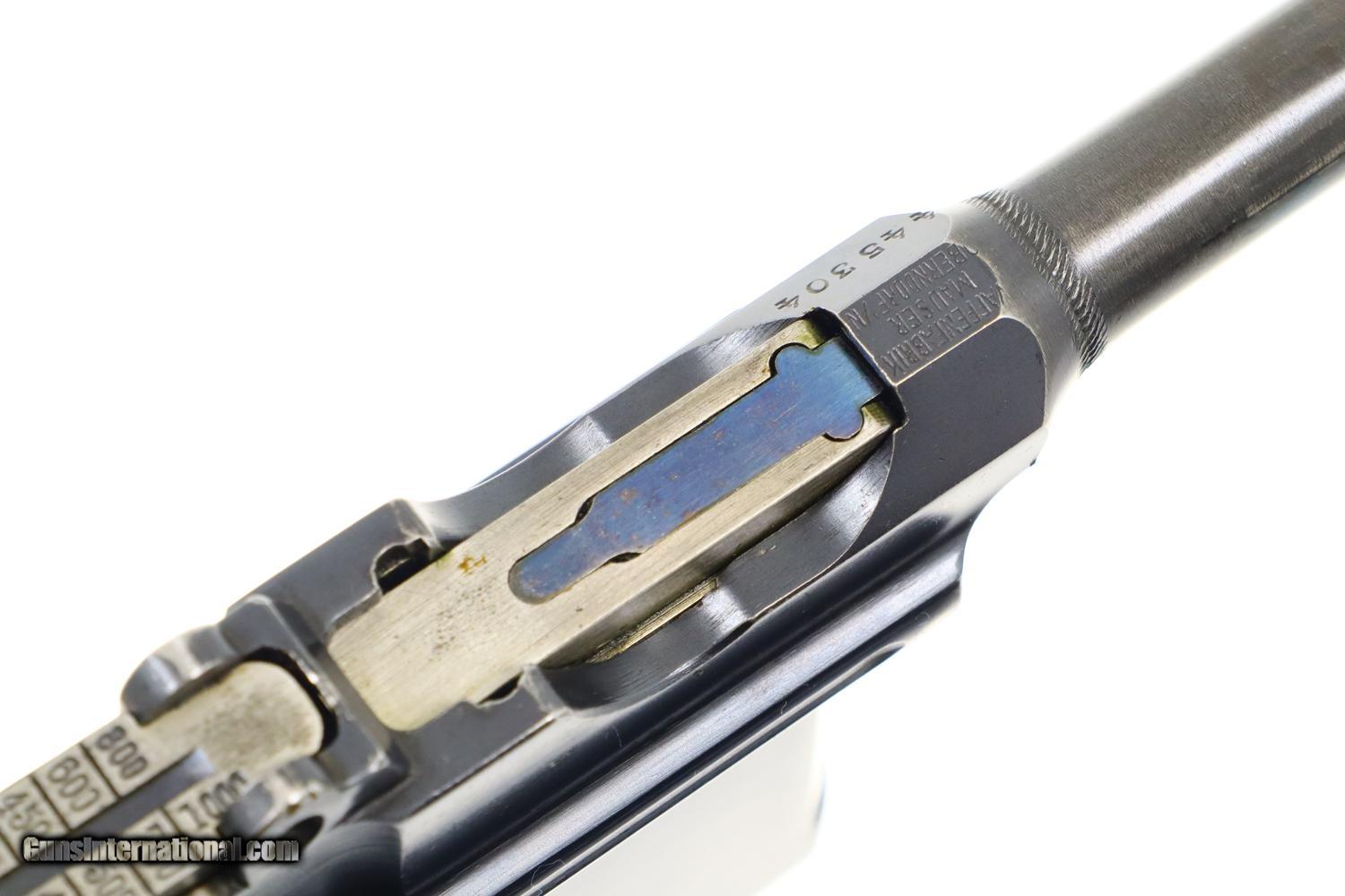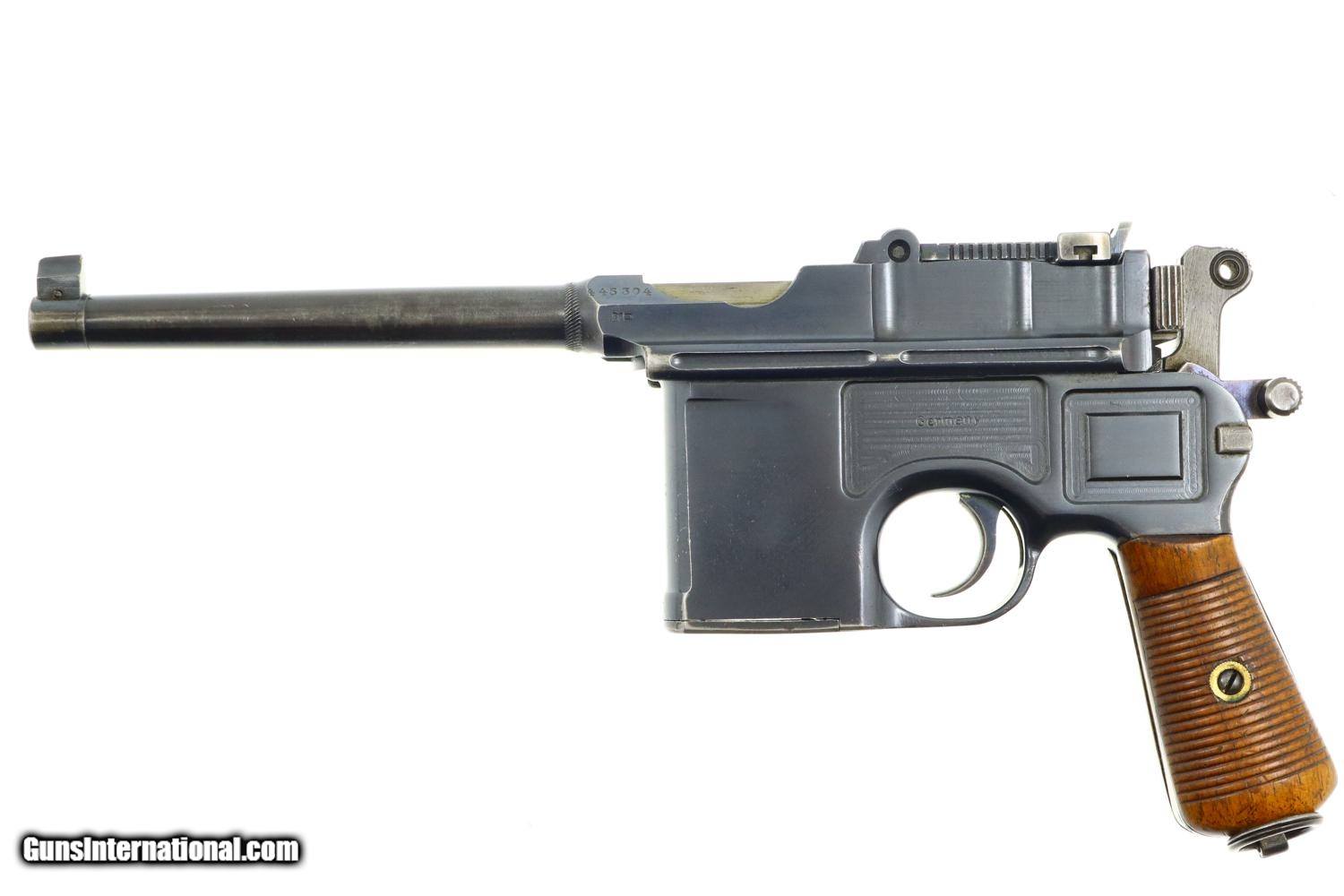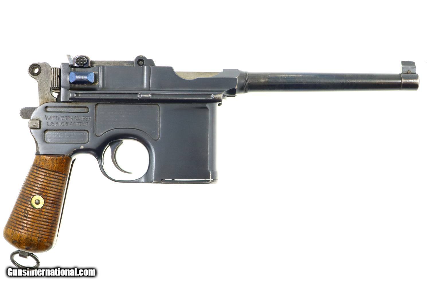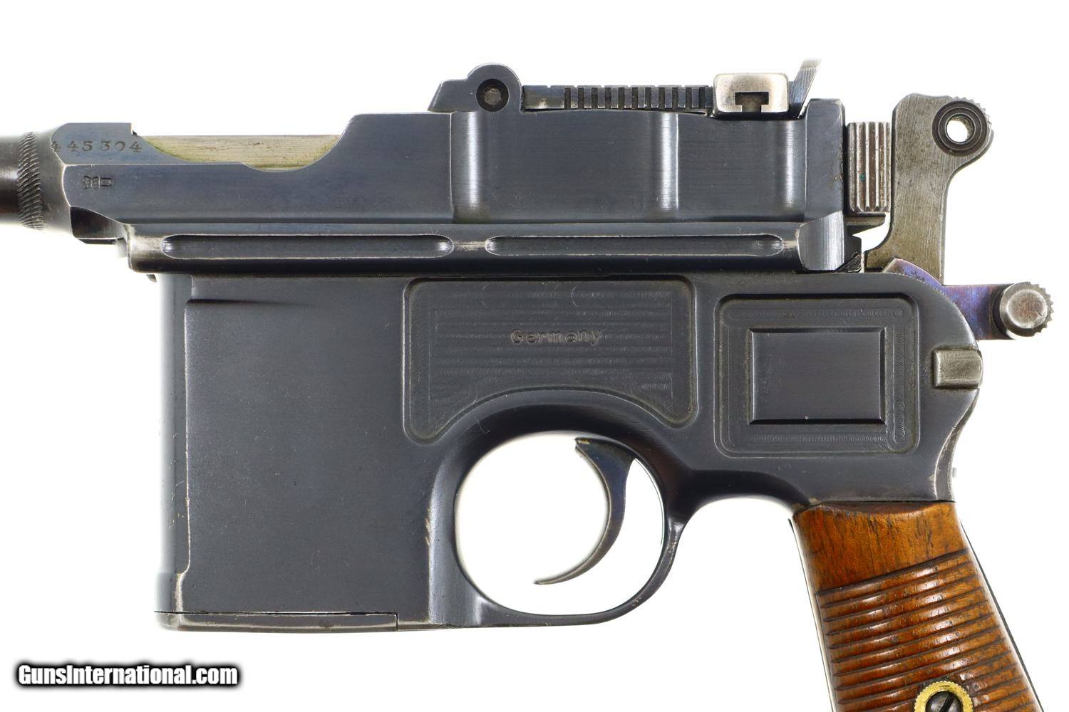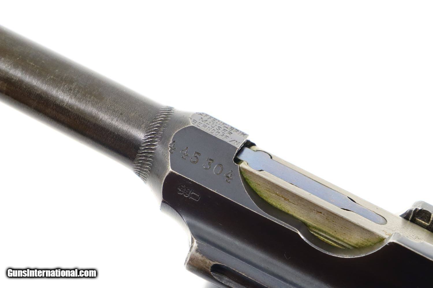 Description: Synopsis: Mauser, C96, Post War Hash Marked Long Barrel Bolo, 445304, FB00948 Description: Very attractive C96, Post War Hash Marked Long Barrel Bolo, all matching and factory original except for replacement bolt stop. Cal: 7.63mm. This is one of the scarcer Post WWI C96 pistols, found in a narrow serial range, that was factory rebarreled to 6” using a barrel with a banded and pinned front sight and hash markings/knurling to conceal the juncture between barrel and extension. Fitted with a slip-in 50-1000 rear sight and two lug firing pin. Three line address on top of chamber. Full serial number on left chamber flat. Crown/crown/U proofing on left side of barrel extension. Left side of frame marked Germany for export. Usual two line address on right side of frame. Serrated walnut grips. Original lanyard ring. Disassembly shows a fully matched pistol except the bolt stop that is number 745. Condition: VG-EXC bright original rust blue, the later added barrel having a different tone than the balance of the pistol. Expected sharp edge wear with slight thinning of front and back straps as consistent with a pistol that has seen light/moderate use. Comparable condition fire blued small parts and grips. Bright bore, minimal etching, sharp rifling. Correct manual mechanics. One of the scarcer and immediately recognizable of the Post War Mauser Bolo C96s! ~~Insured shipping fee of $75; most packages shipped using FedEx 2nd Day.~~ SOLD Manufacturer: Mauser Serial Number: 445304 Caliber Info: 7.63 Mauser |