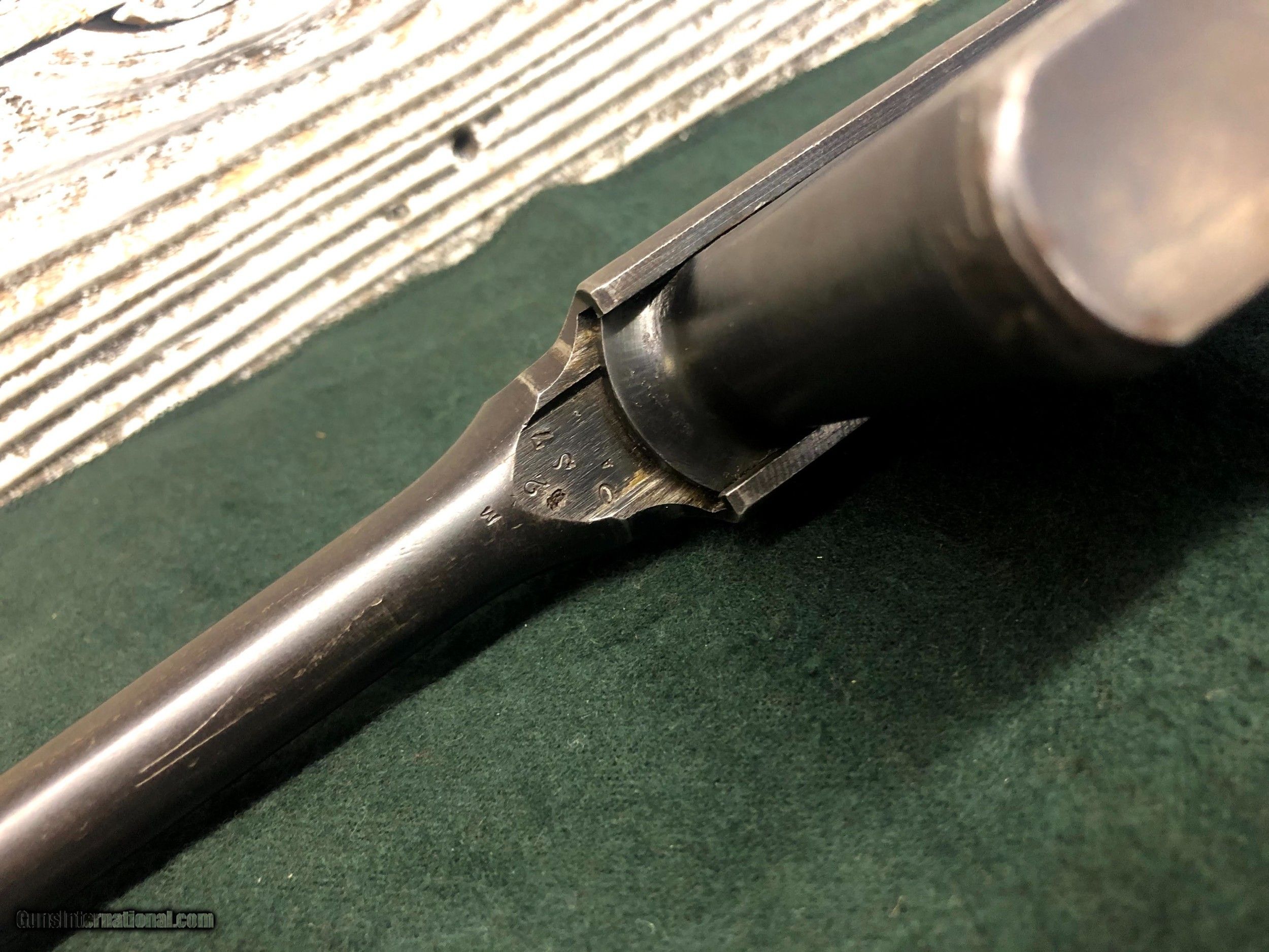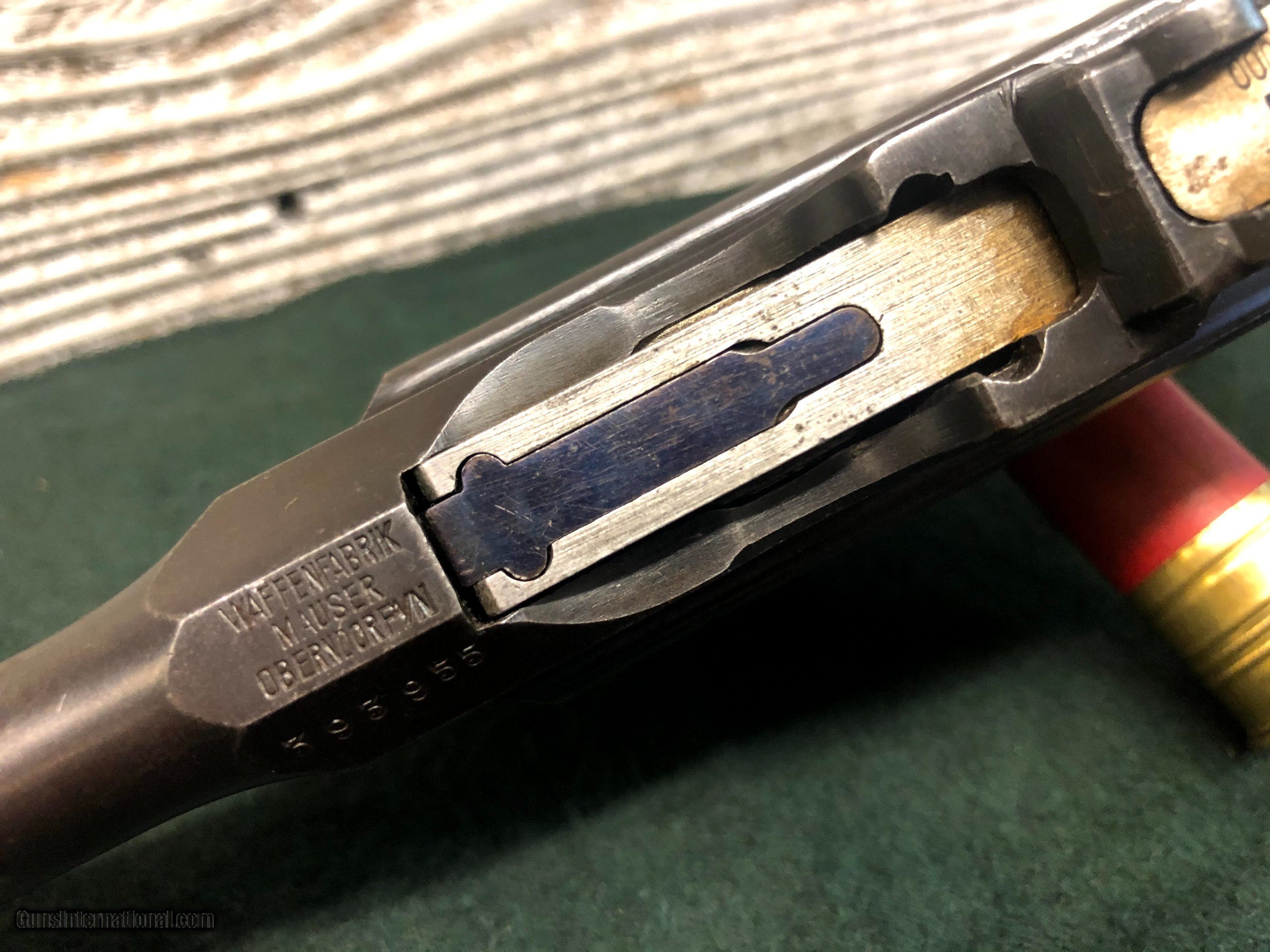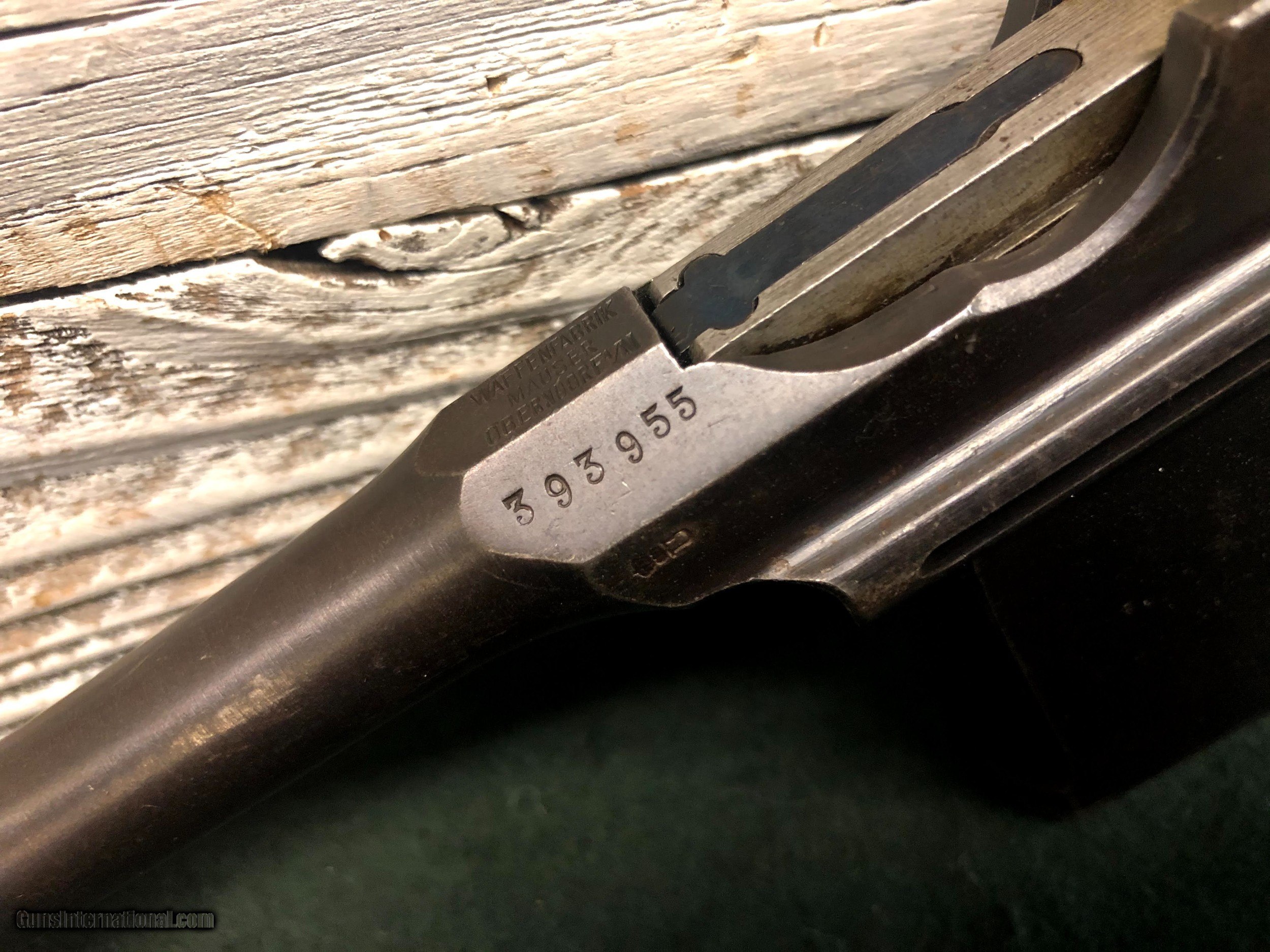 Description: Wartime Commercial Mauser C96 in 30 Luger. Serial number indicates 1915 - 1918 DOM. The top of the barrel chamber is marked “WAFFENFABRIK / MAUSER / OBERNDORF A/N”. The left side of the chamber is marked with a double-crowned “U” definitive proof and the left shoulder with “393955”. The top rear of the bolt is marked with a double-crowned “U” and “955” and the top of the bolt stop is also marked “955”. The back of the lock mechanism and the top of the backstrap are marked “313955” and the back of the hammer is marked “955” and with a “NS”, indicating New Safety, which is the correct safety for this model. The right side of the frame is marked “WAFFENFABRIK MAUSER / OBERNDORF A. NECKAR”. The right side of the barrel at the chamber is marked with a crowned “Gothic R”. The flat on the underside of the barrel is marked “O”, “2”, "S" and “7”. The inside surfaces of the grips are marked “955”. The pistol is mounted with a “V” notch rear sliding elevator sight with markings from “50-1000” that is pinned to the barrel extension. The front sight is an inverted “V” blade fixed to the barrel. The pistol is blued with a fire blue finish on the extractor, bolt stop, safety, rear sight slider, rear sight spring and the rear section of the sight ladder and sight. The cocking piece on the bolt, the hammer, and the lock mechanism are finished “In The White”. The bore is gray with light to moderate wear in the rifling. There is light erosion in the grooves the length of the barrel. This pistol retains about 90% of its original metal finish. There are tiny spots of solid erosion scattered over the sides of the frame and barrel extension, the top of the bolt and rear sight slider, and the front strap. There are minimal tiny dings, a few scratches and thinning in the barrel, and thinning on the magazine floorplate, backstrap, frame rails and edges of the frame and barrel extension. There are a few tiny dings in the barrel extension, scratches at the top of the backstrap and scratches on the sides of the lock frame. The serrations on the hammer are relatively sharp, the serrations on the cocking piece show light wear and tiny nicks on their edges, and those on the safety are sharp. The grip screw is sharp and the markings are clear. Overall, this pistol rates in Very Good condition. PLEASE NOTE WE ARE A GUN STORE LOCATED IN DENVER COLORADO AND AS PER STATE LAW WE ARE REQUIRED TO COLLECT LOCAL SALES TAX OF 7.5% ON ALL OUT OS STATE SALES. SOLD Handgun Caliber: 7.65x22mm Parabellum (7.65x22mm Luger, .30 Luger) |